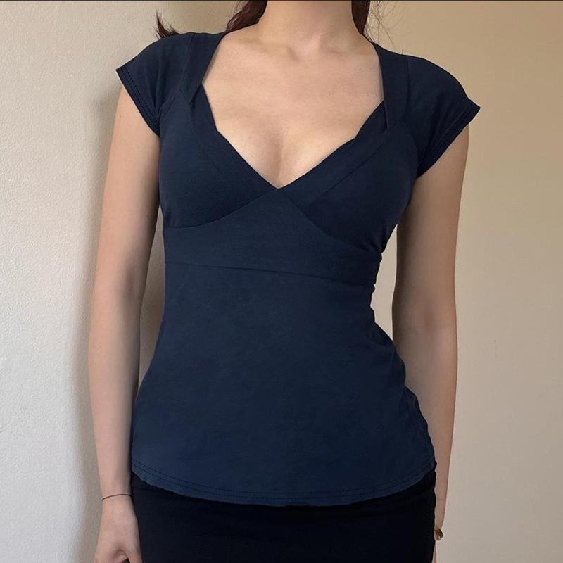 2025 Nuevo Verano Transfronterizo Escote en V Bajo Versátil Simple Elegante Estilo Lujuria Pura Tops Slim de Color Puro para Mujer al Mayoreo