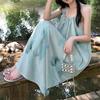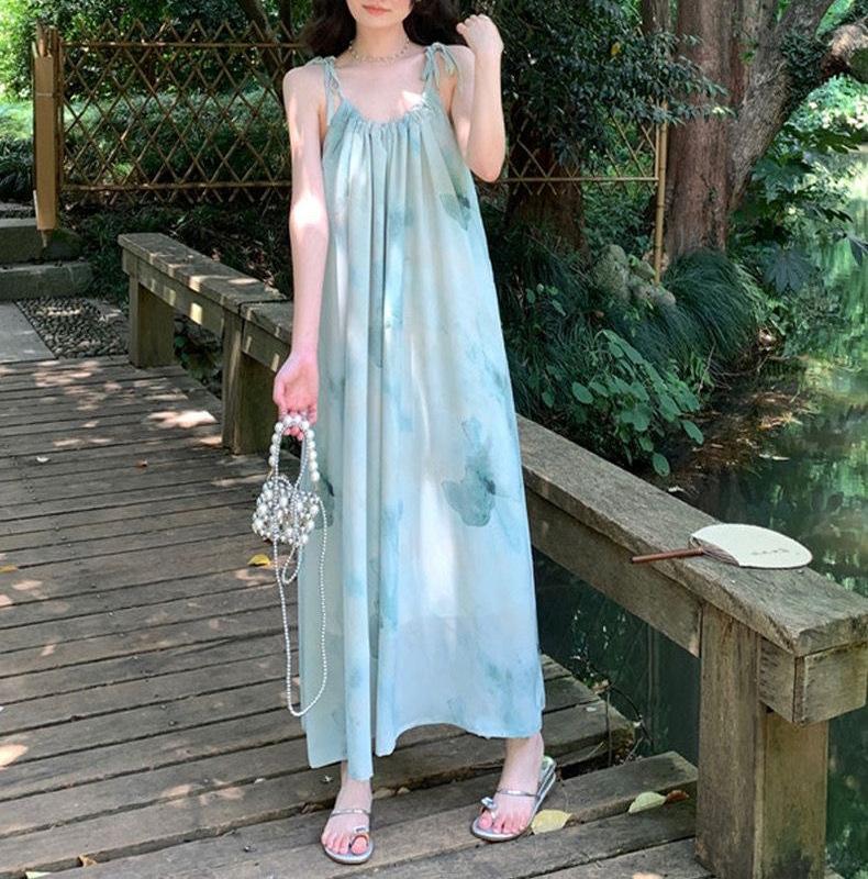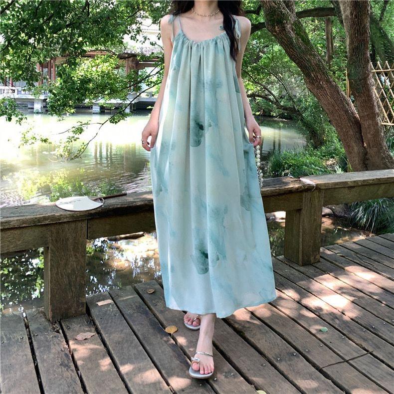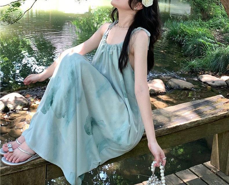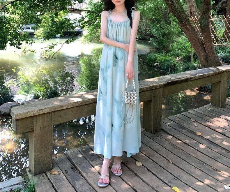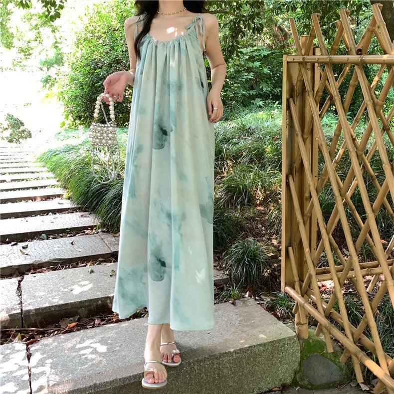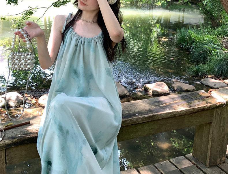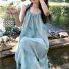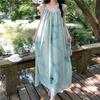Vestido Tie-Dye Vacaciones en la Playa para Mujer Verano Francés Línea A Suelto Ajustado Vestido de Playa sin Mangas Falda Larga con Tirantes