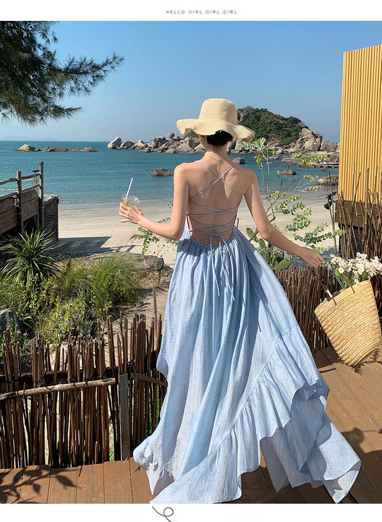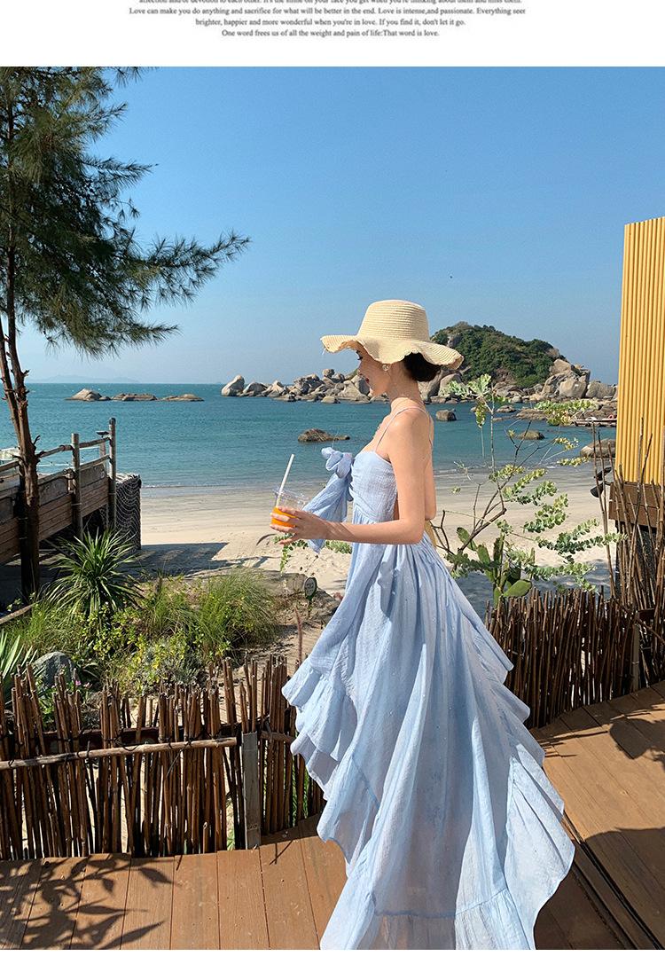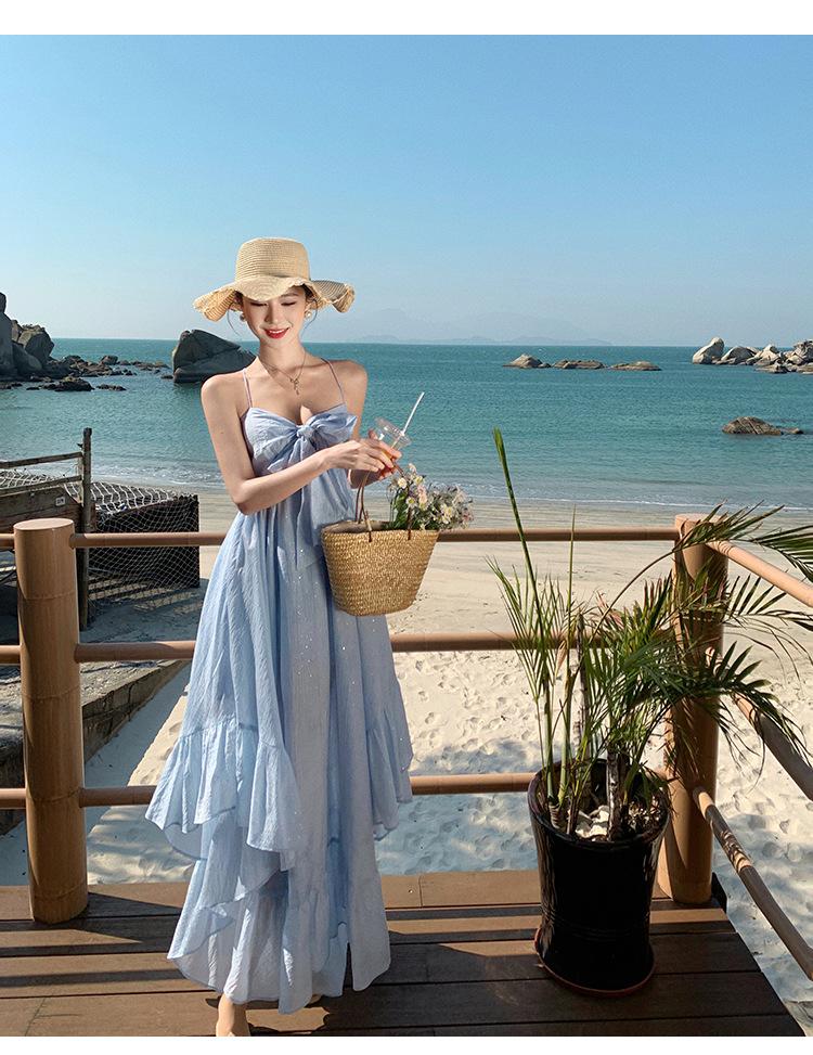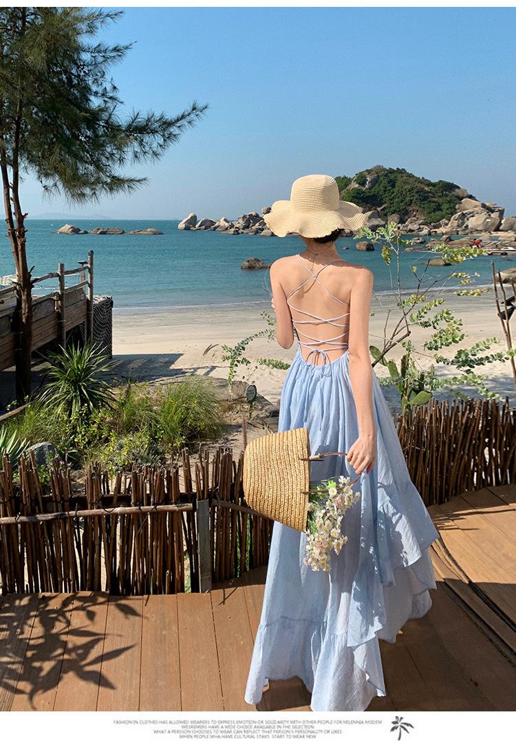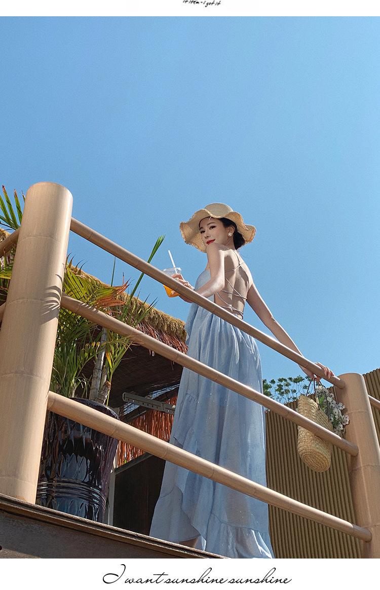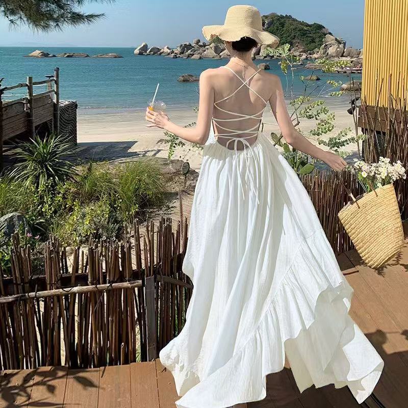 Vestido Irregular con Volantes en la Espalda Descubierta con Tirantes Brillante Atmósfera de Vacaciones junto al Mar Súper Hada Vestido de Playa Sanya