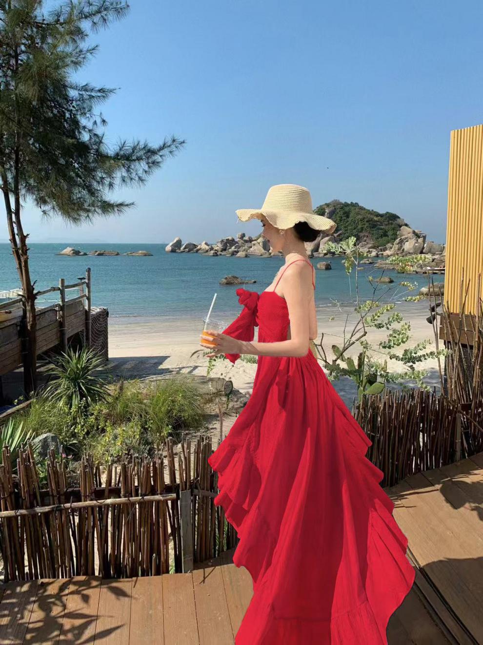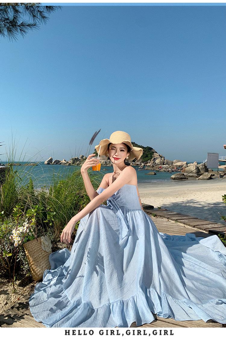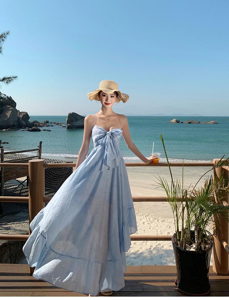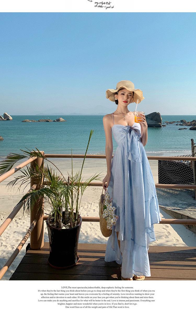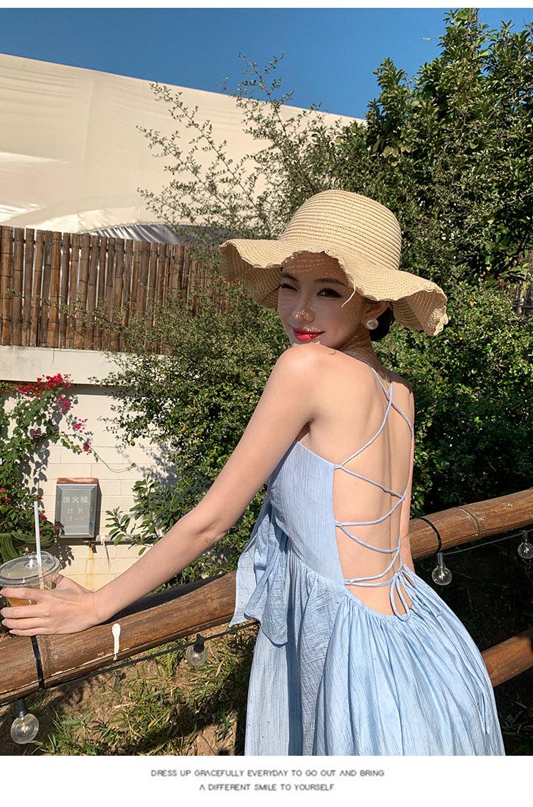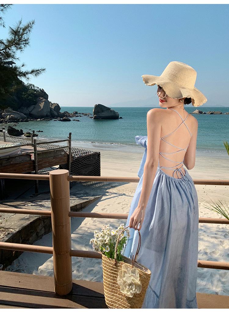 Vestido Irregular con Volantes en la Espalda Descubierta con Tirantes Brillante Atmósfera de Vacaciones junto al Mar Súper Hada Vestido de Playa Sanya