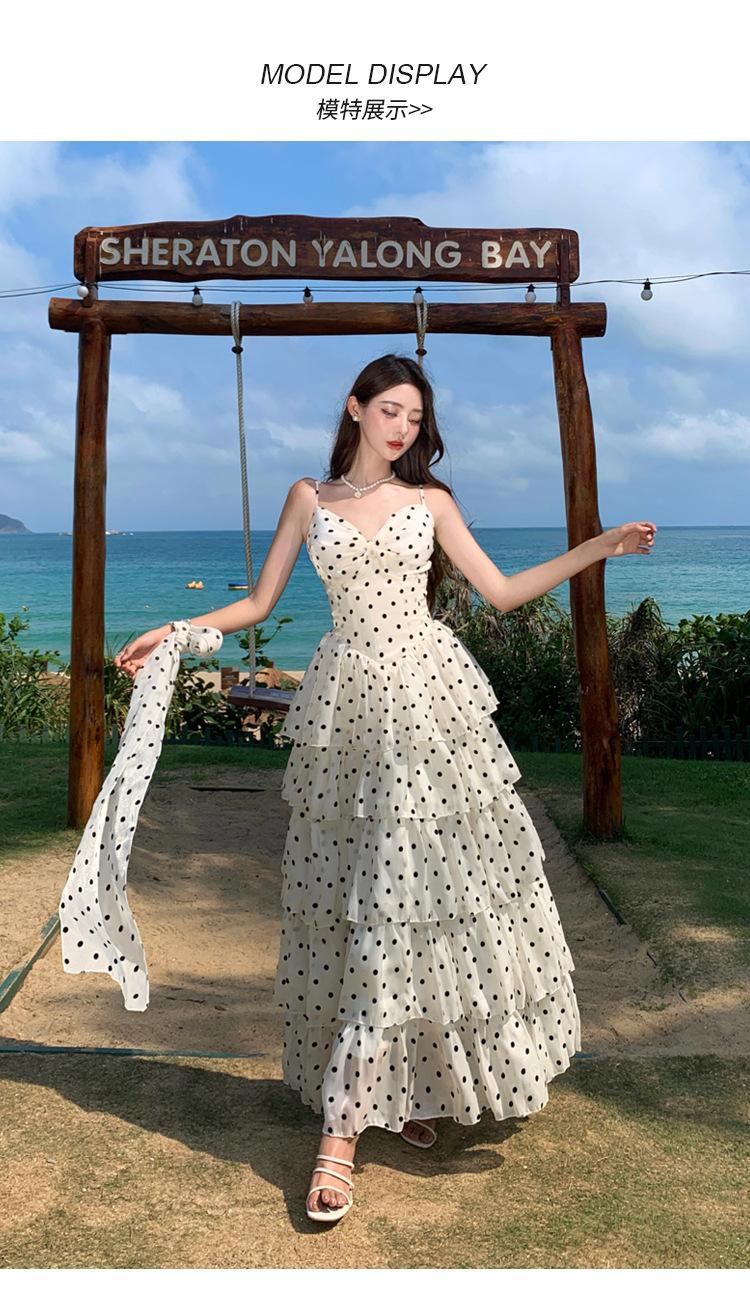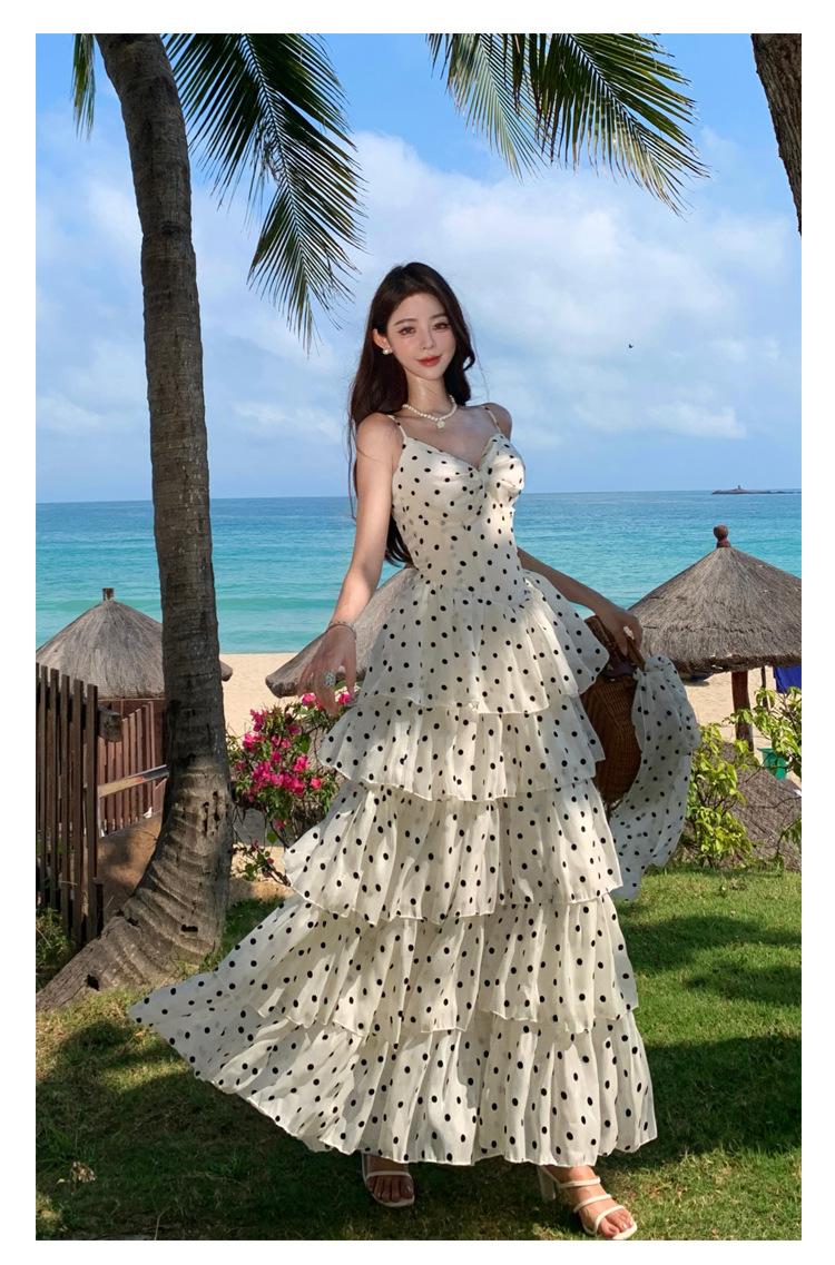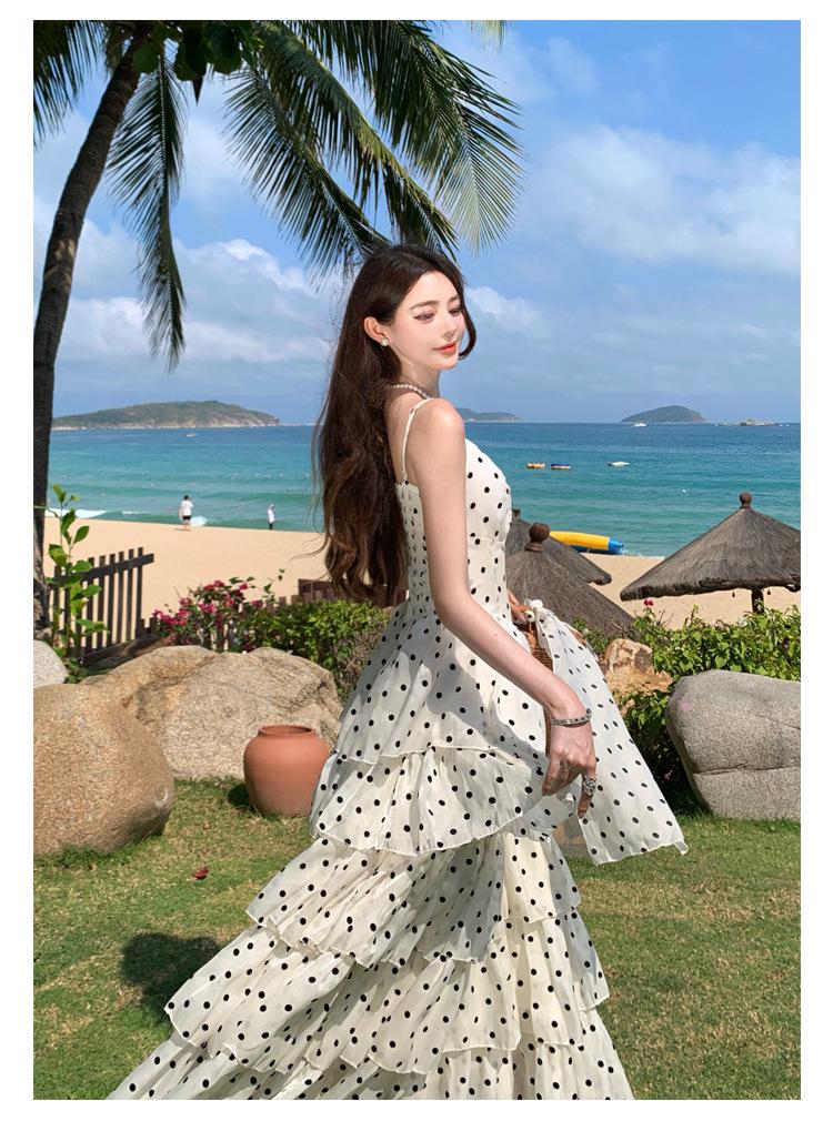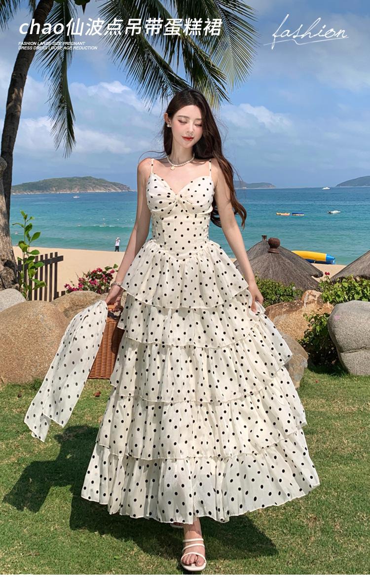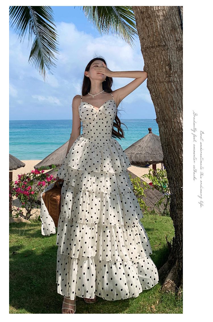 Vestido de Tirantes de Lunares Suaves Estilo Resort Costero Francés para Mujer Verano Cintura Adelgazante Vestido de Cumpleaños Falda Larga