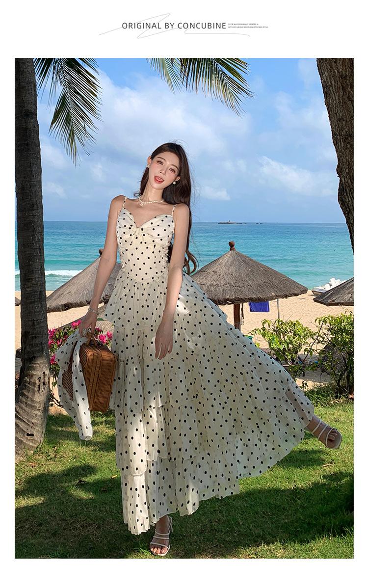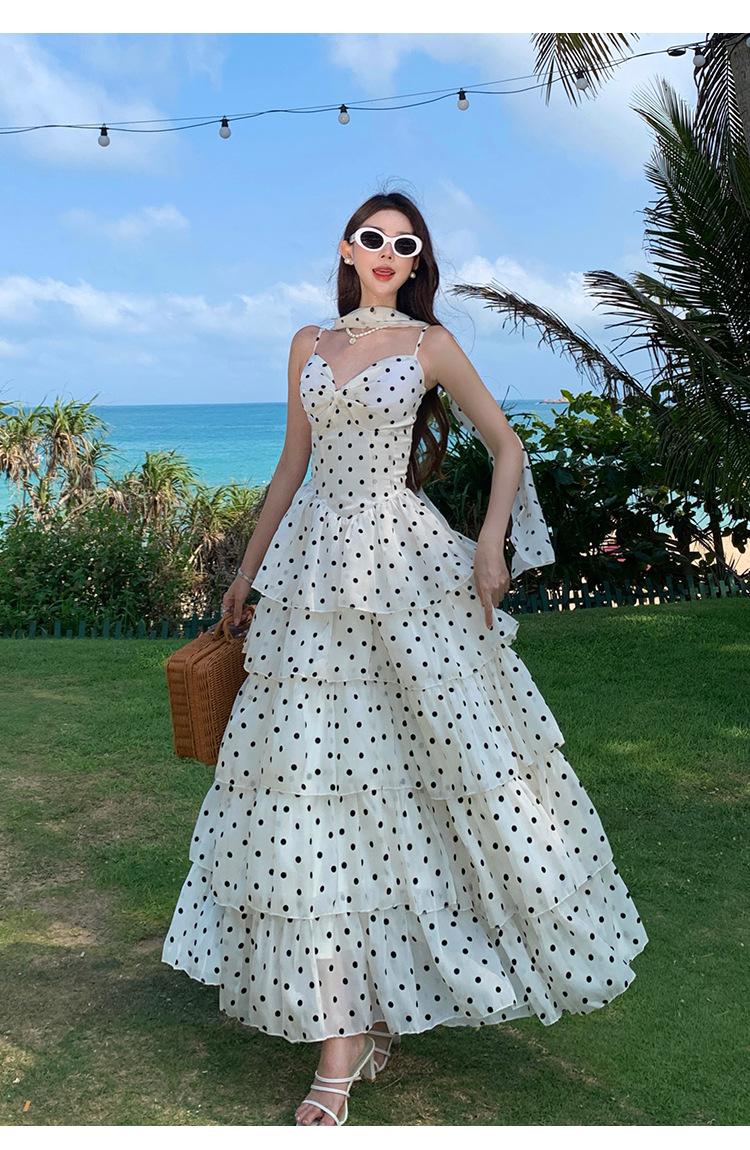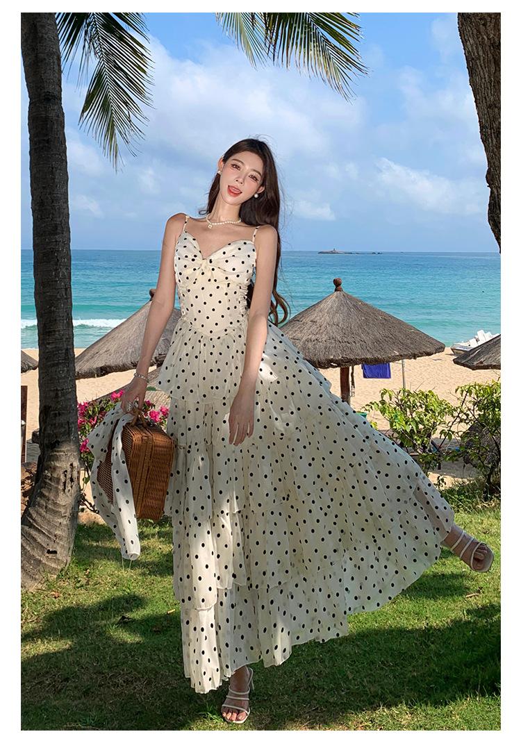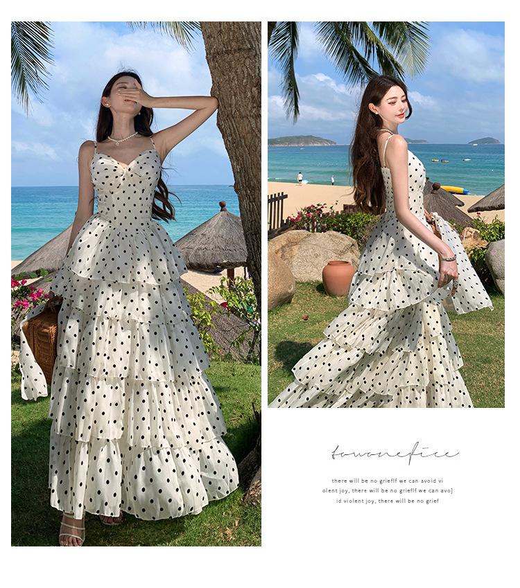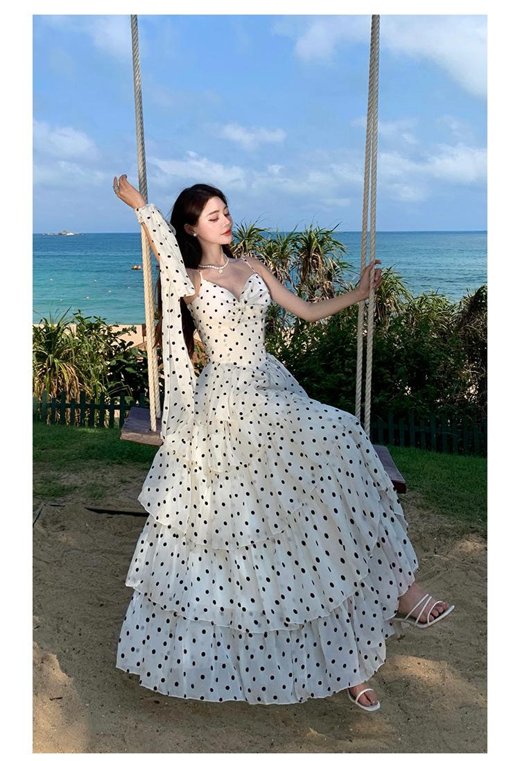 Vestido de Tirantes de Lunares Suaves Estilo Resort Costero Francés para Mujer Verano Cintura Adelgazante Vestido de Cumpleaños Falda Larga