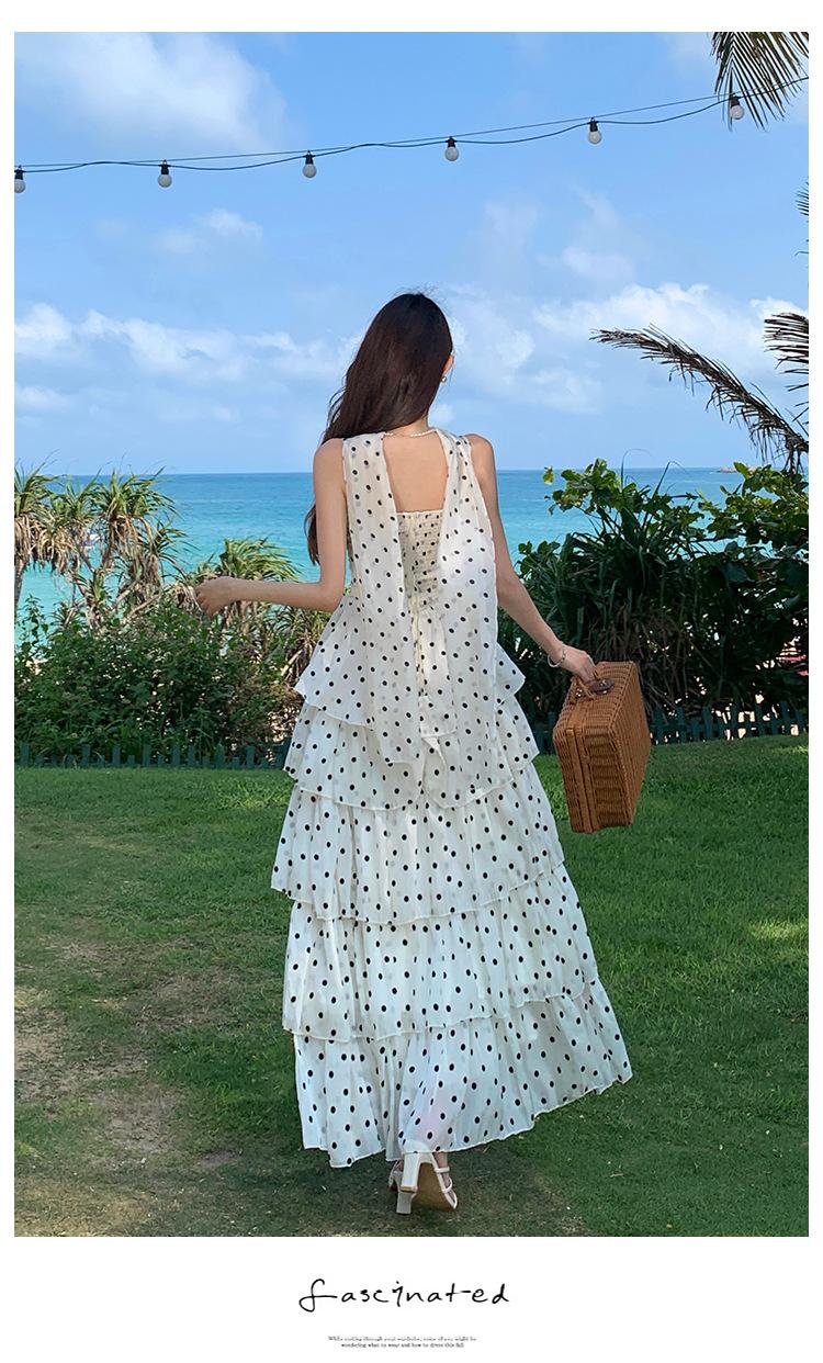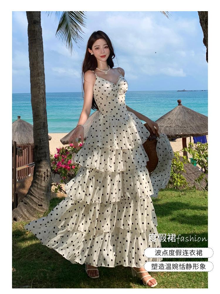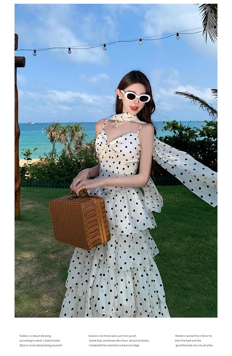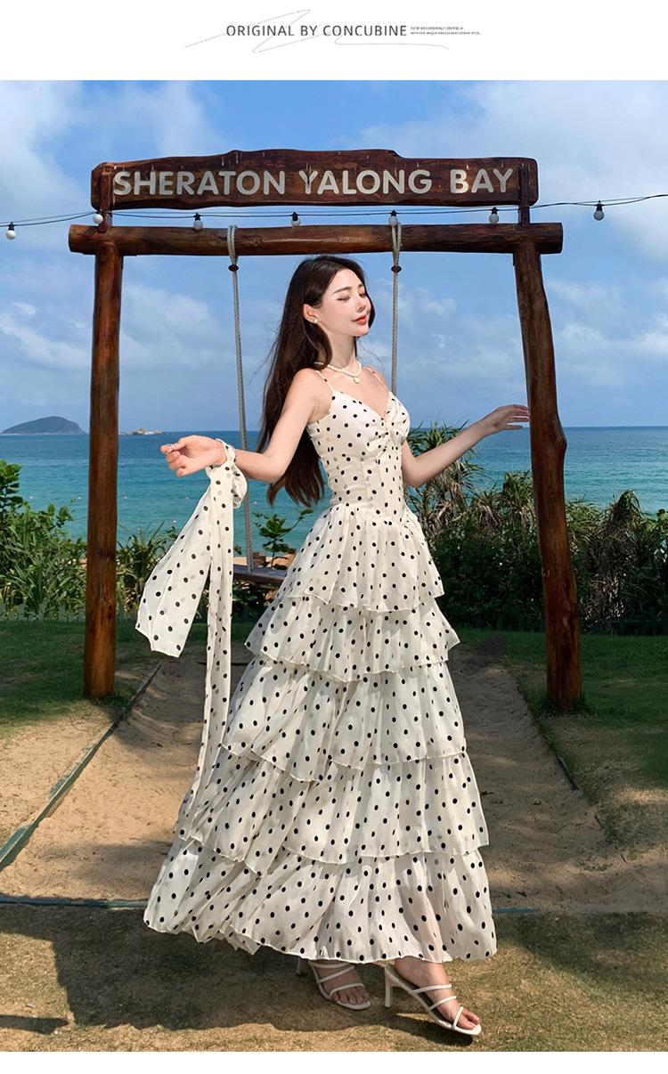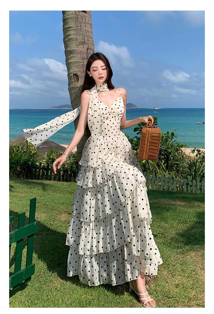 Vestido de Tirantes de Lunares Suaves Estilo Resort Costero Francés para Mujer Verano Cintura Adelgazante Vestido de Cumpleaños Falda Larga