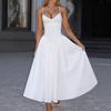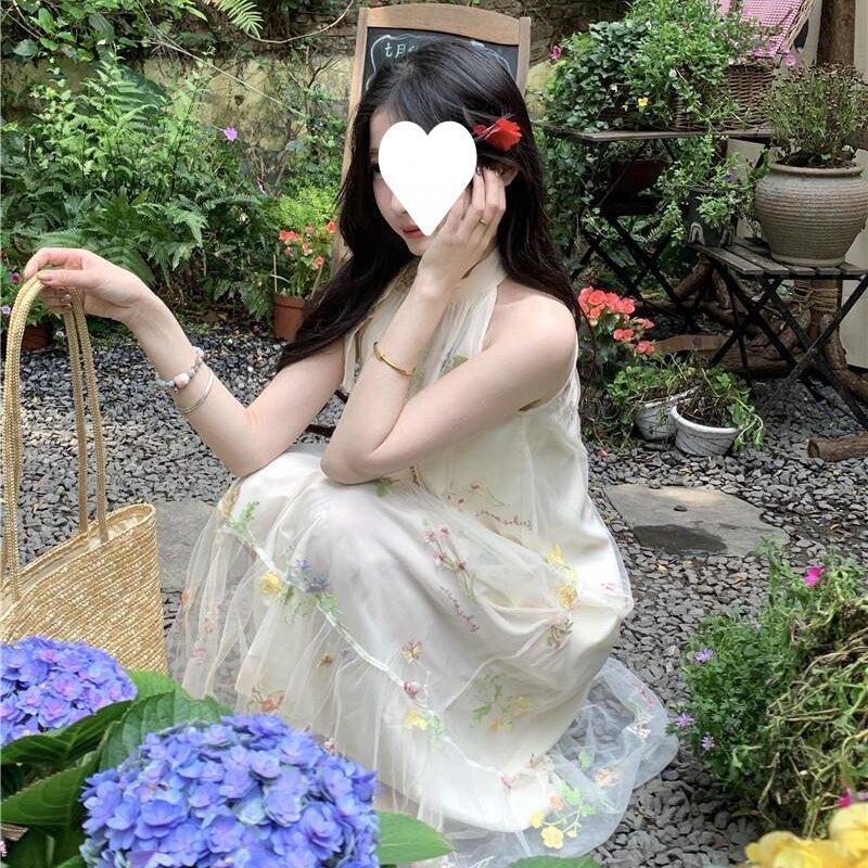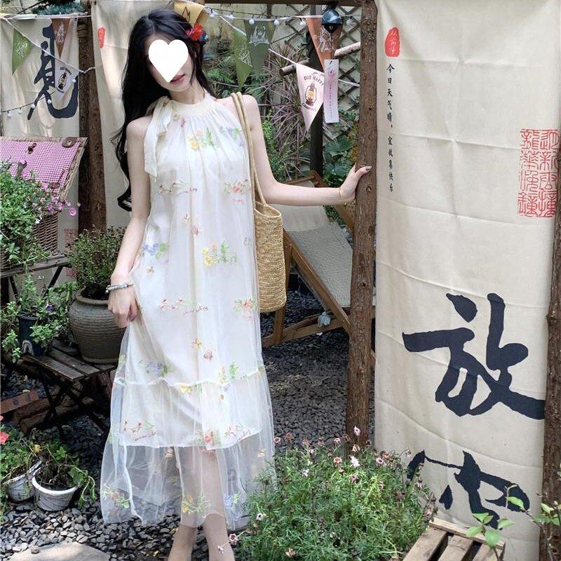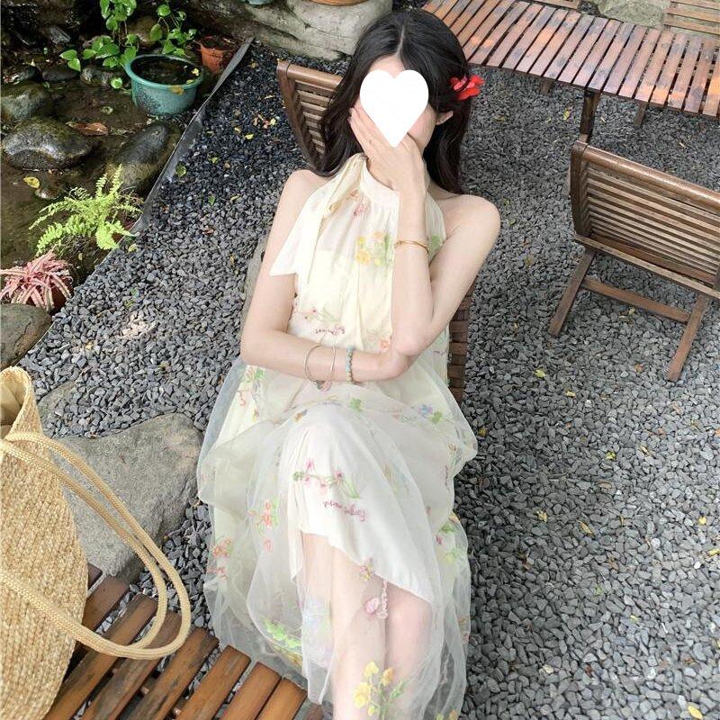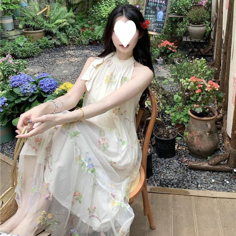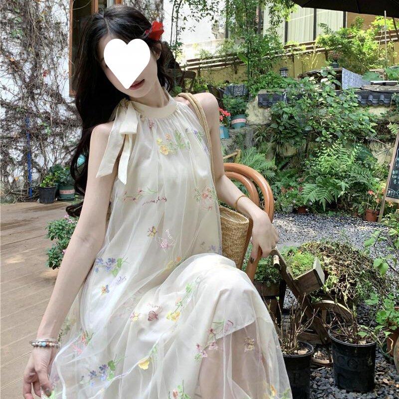 Vestido de verano con cuello halter, sin mangas, con lazo floral bordado de malla para mujer, falda larga francesa.