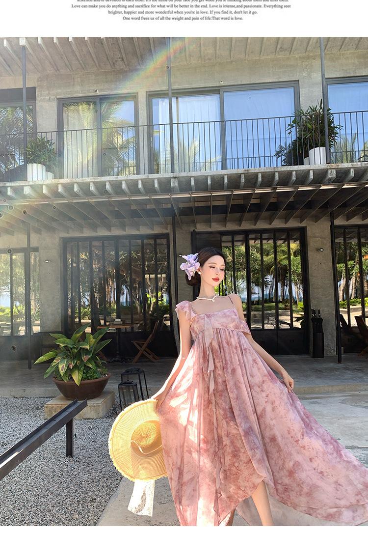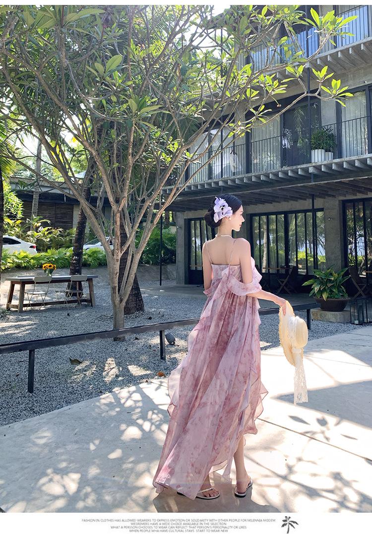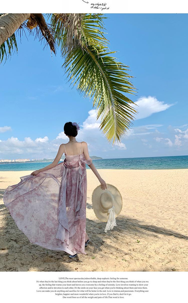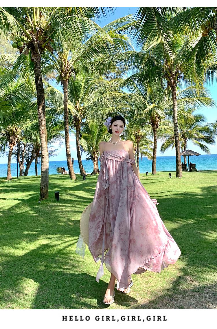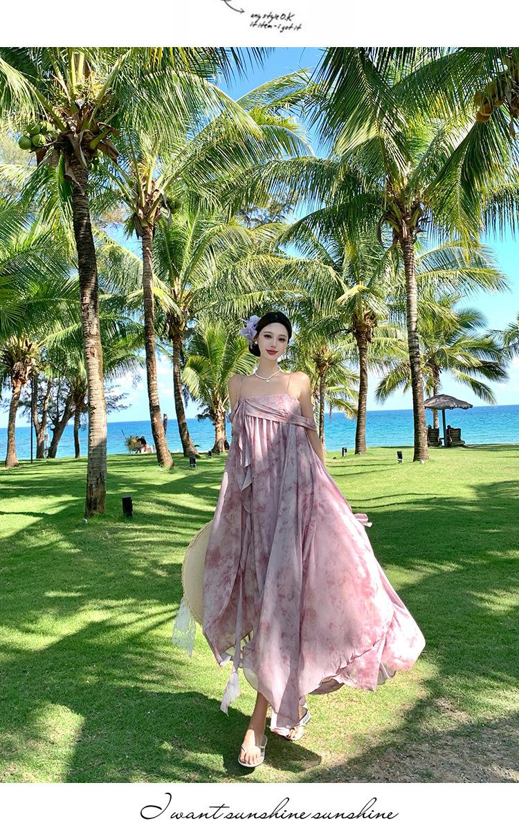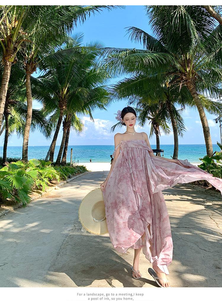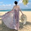 Vestido de Tirantes de Chifón Estampado Super Hada para Mujer Verano Francés Retro Línea A Falda Larga Vacaciones Junto al Mar Falda con Serpentinas