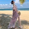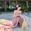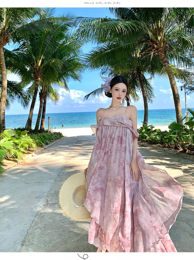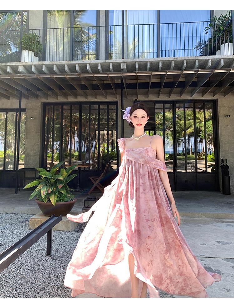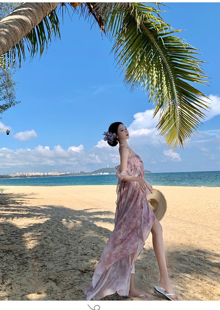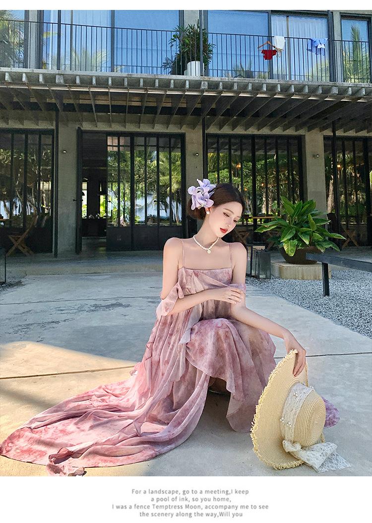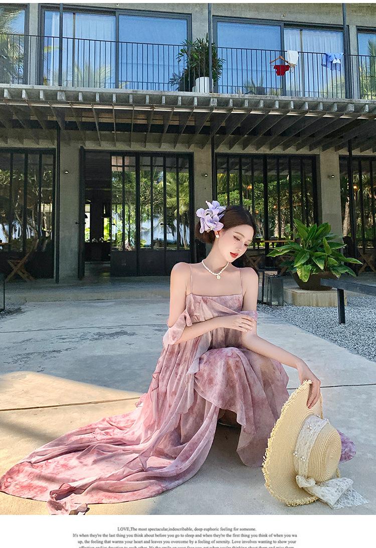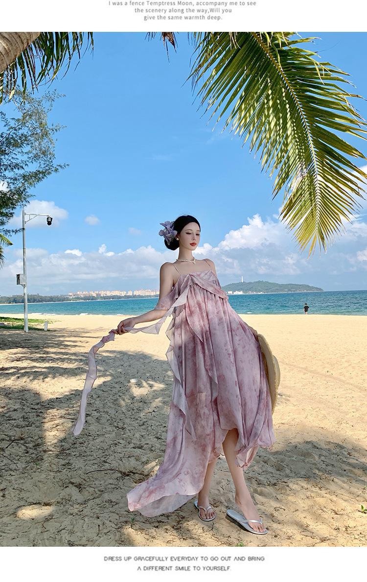Vestido de Tirantes de Chifón Estampado Super Hada para Mujer Verano Francés Retro Línea A Falda Larga Vacaciones Junto al Mar Falda con Serpentinas