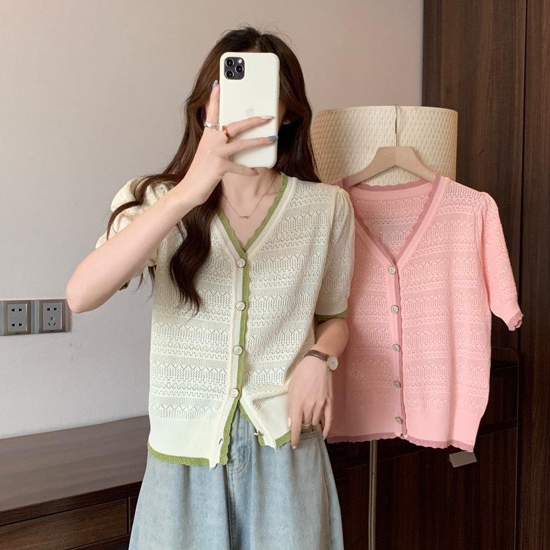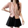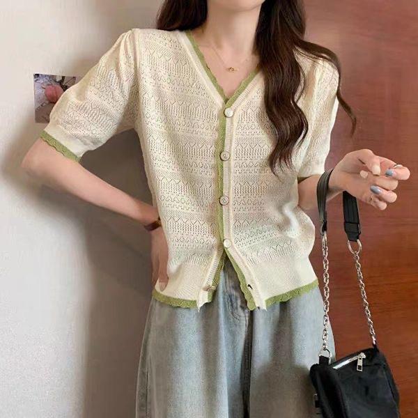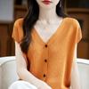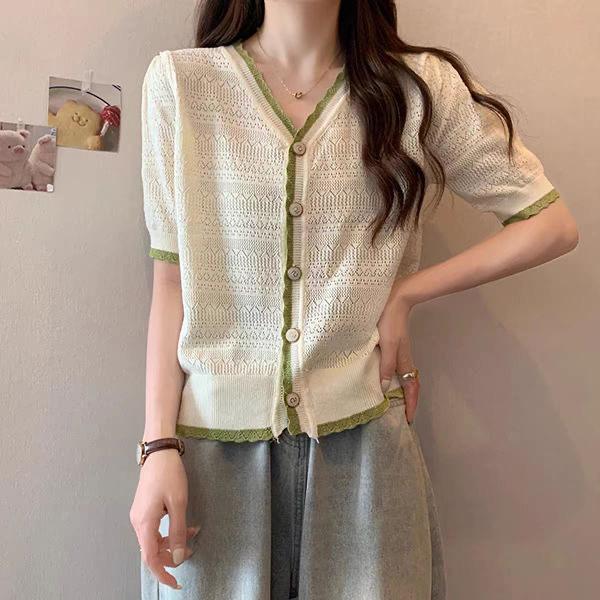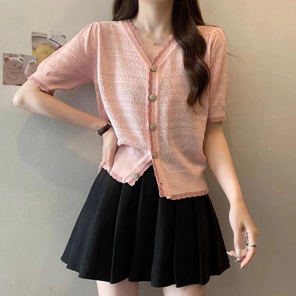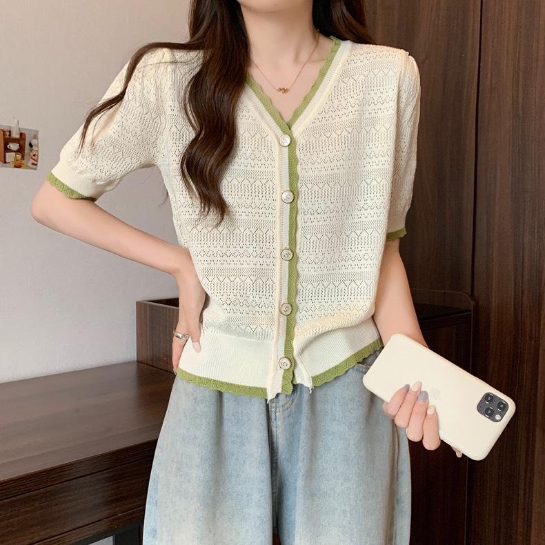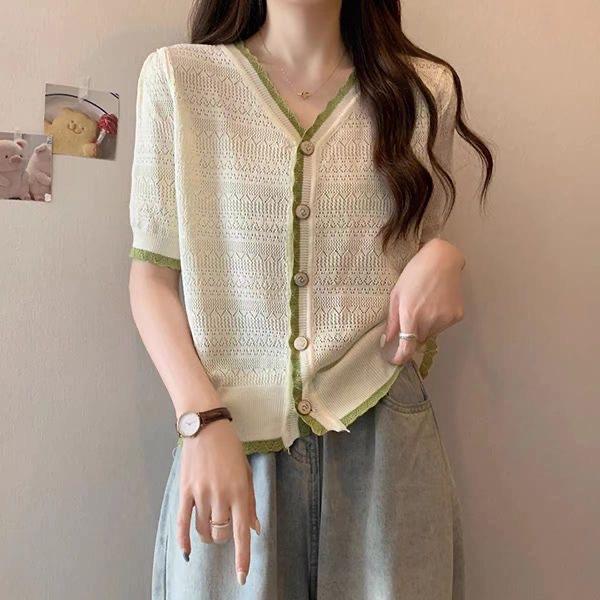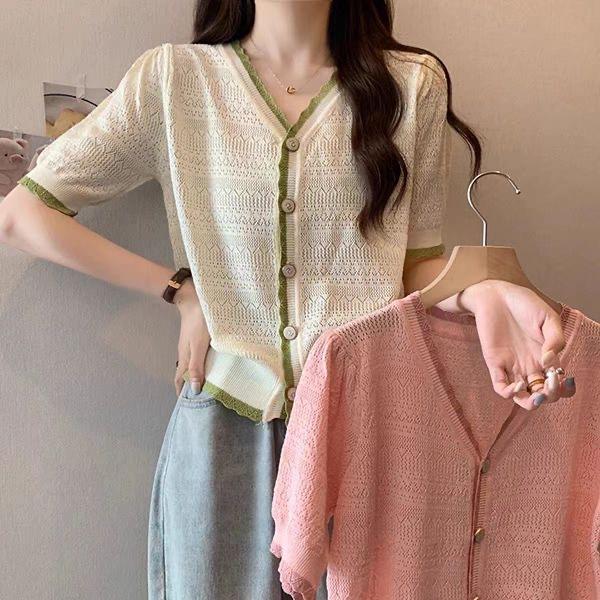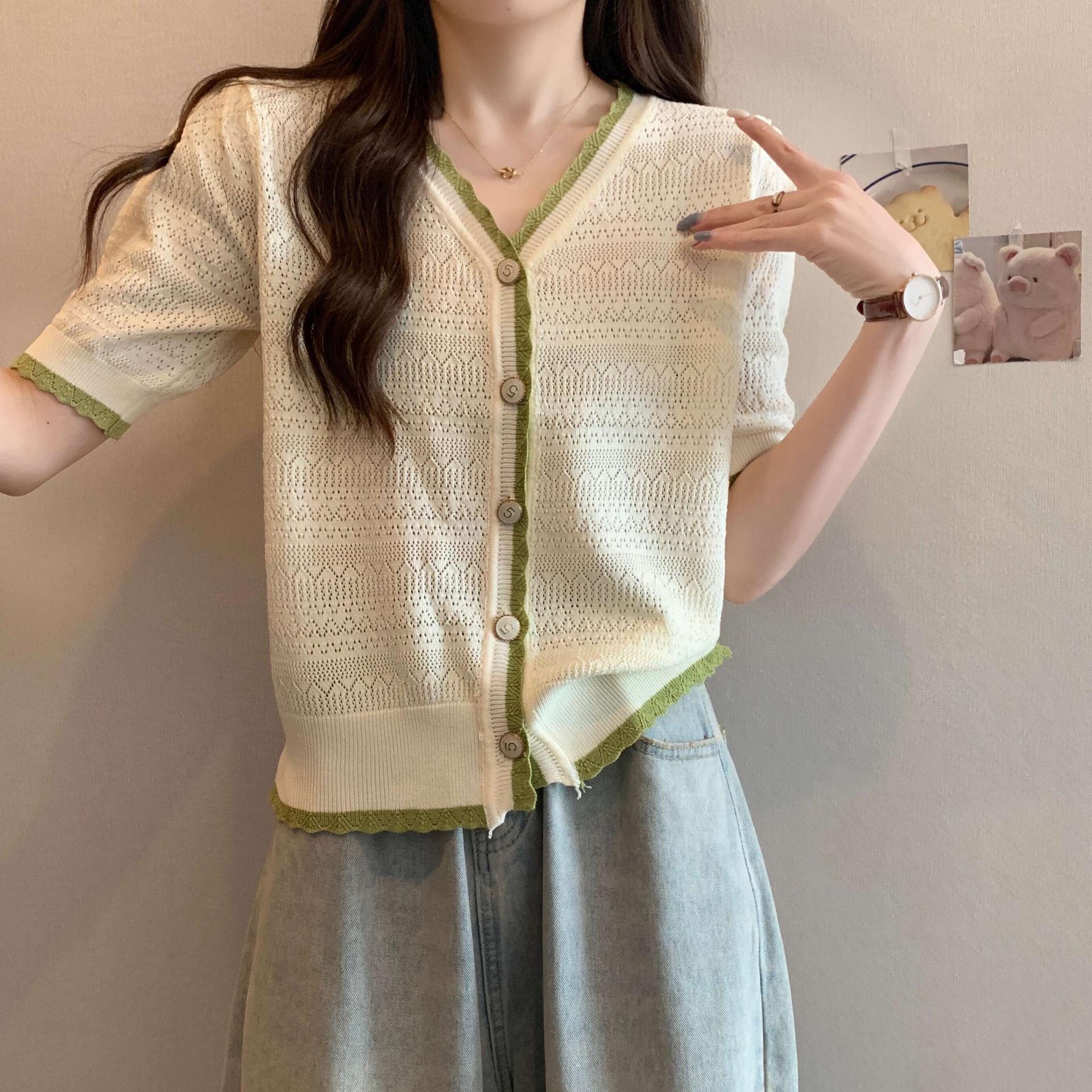 Camiseta de manga corta de seda de hielo fina para mujer, verano, diseño de nicho con sentido del diseño, estilo occidental, cuello en V, adelgazante, top chic, cárdigan de punto