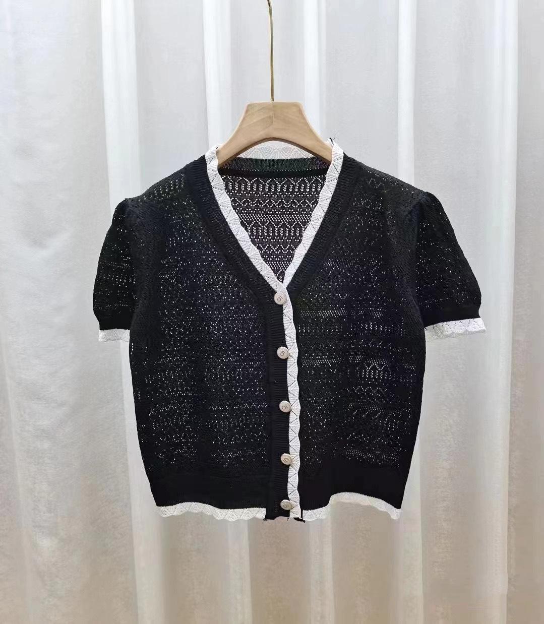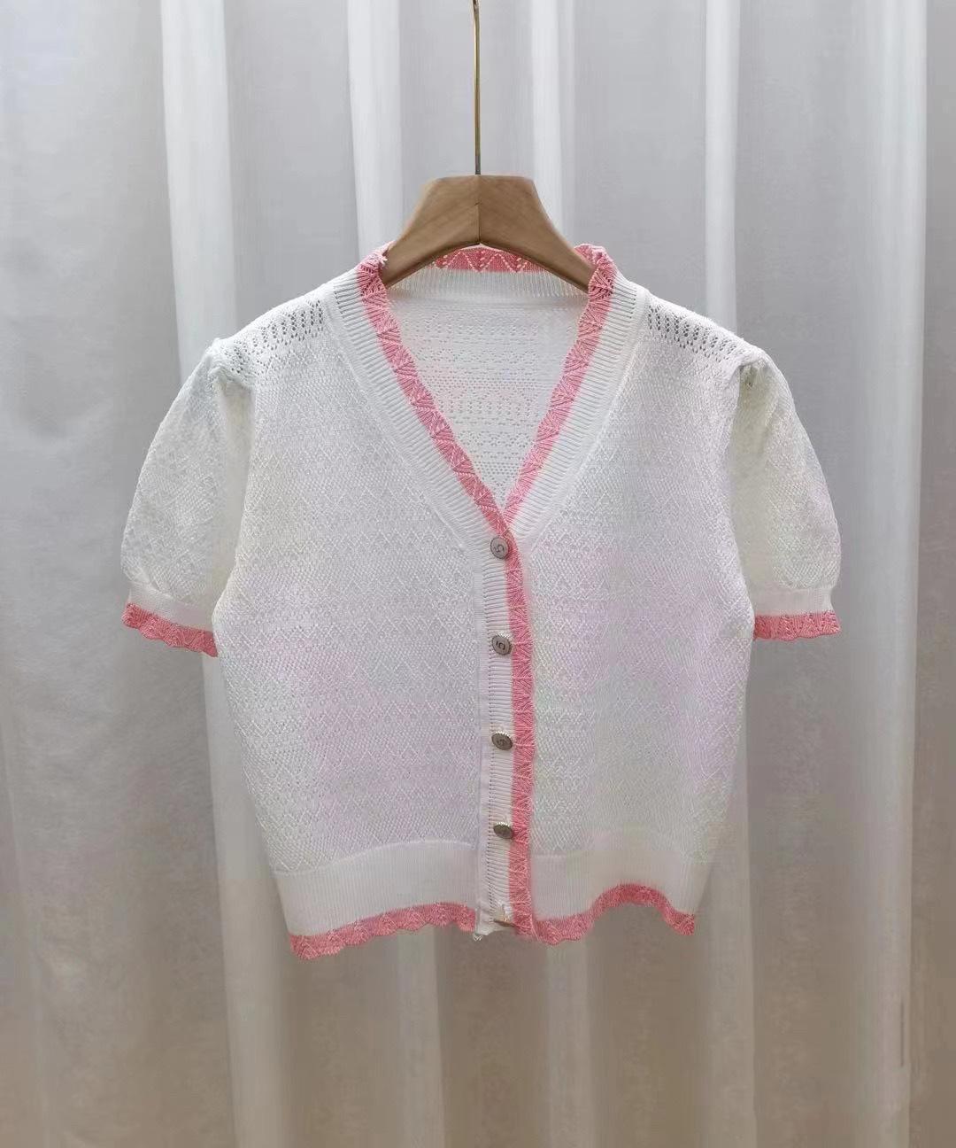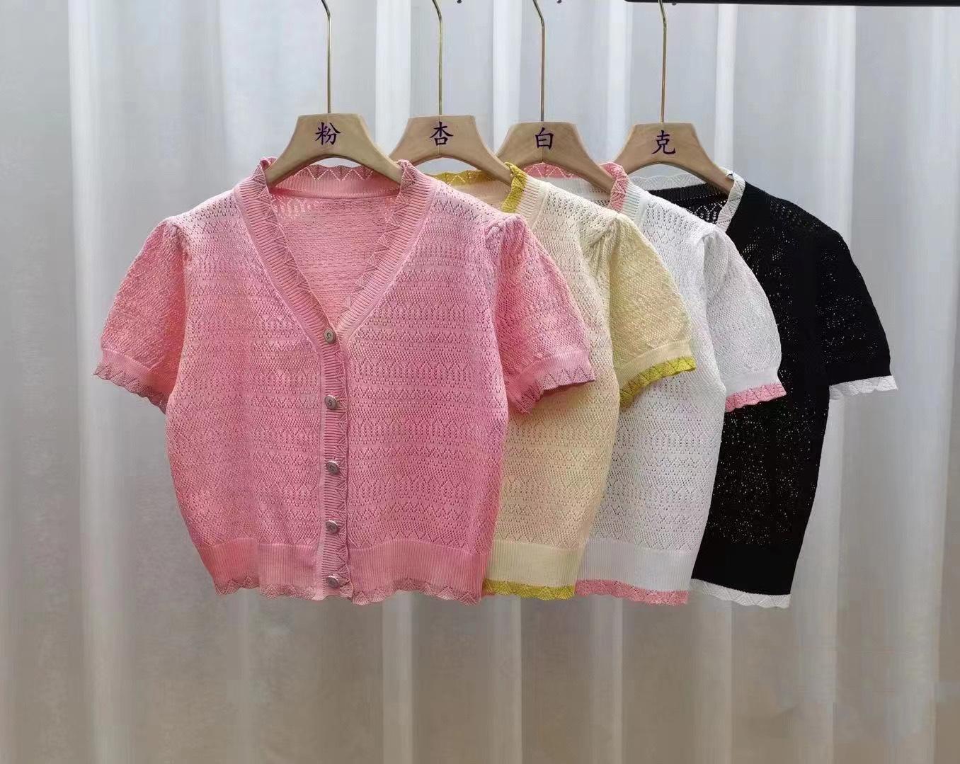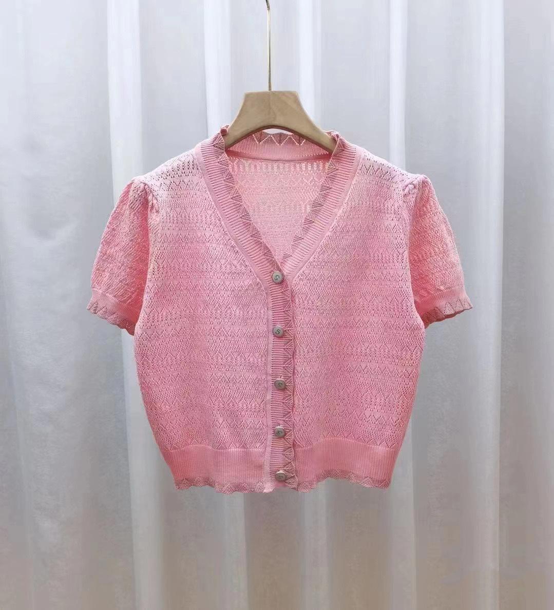 Camiseta de manga corta de seda de hielo fina para mujer, verano, diseño de nicho con sentido del diseño, estilo occidental, cuello en V, adelgazante, top chic, cárdigan de punto