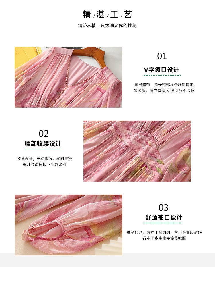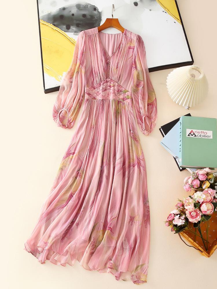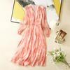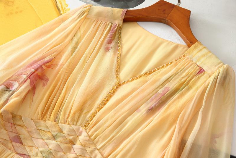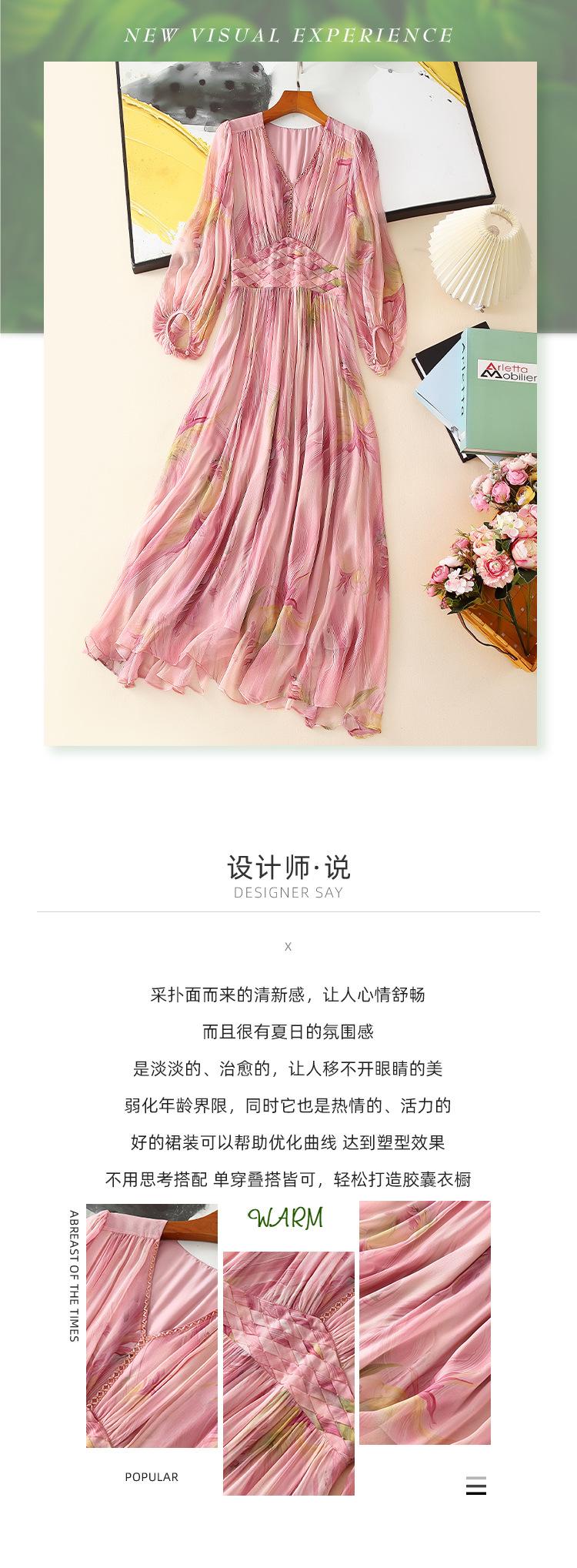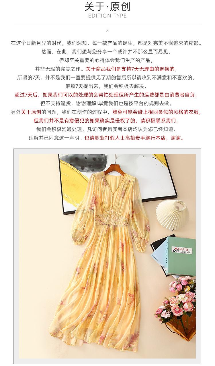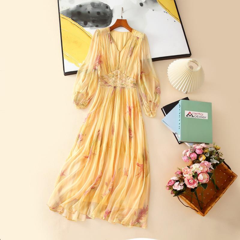 2025 Nuevo Estilo de Verano Moda Francesa Elegante Look Adelgazante de Cintura Cuello en V con Cuentas Vestido Midi de Manga Larga de Seda de Morera