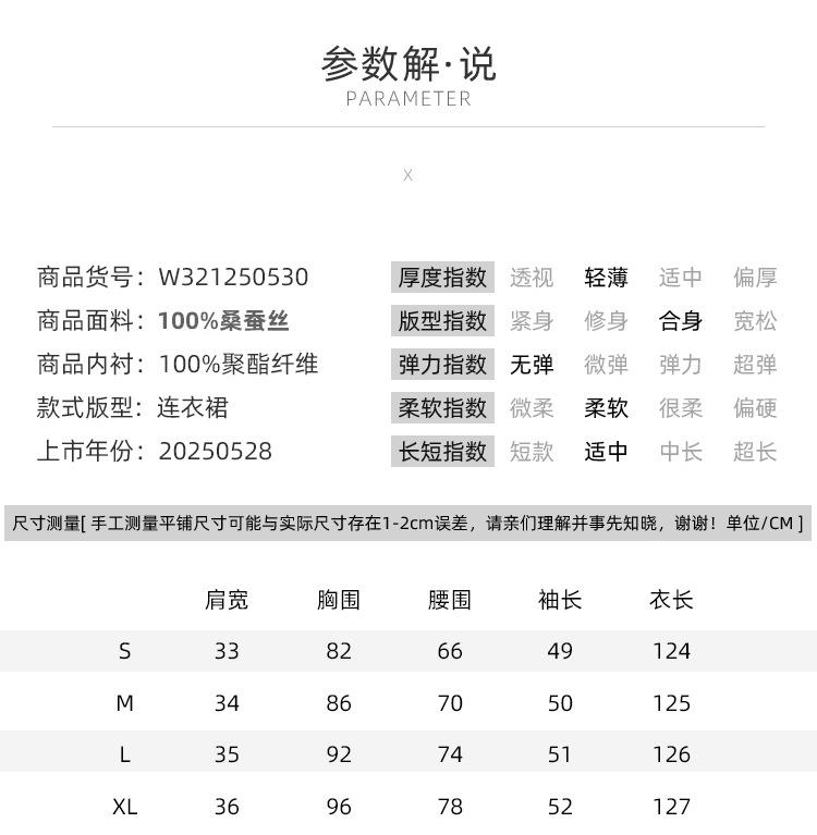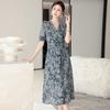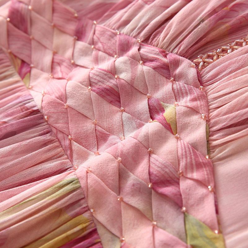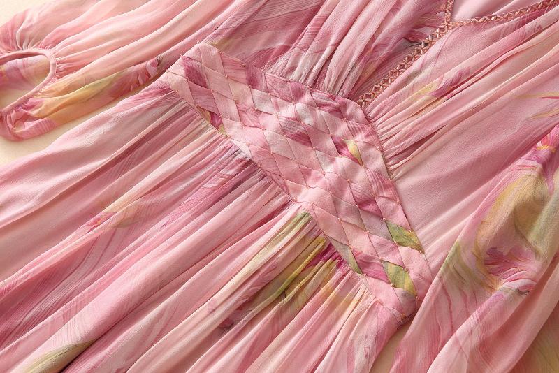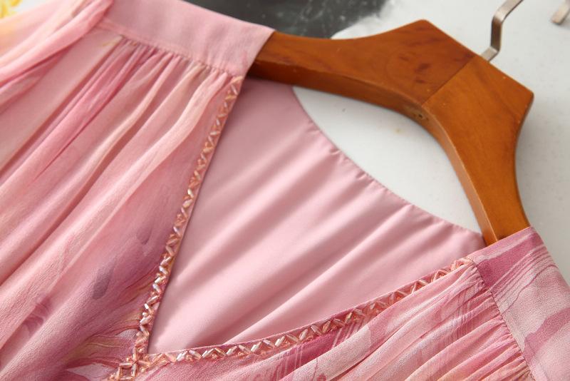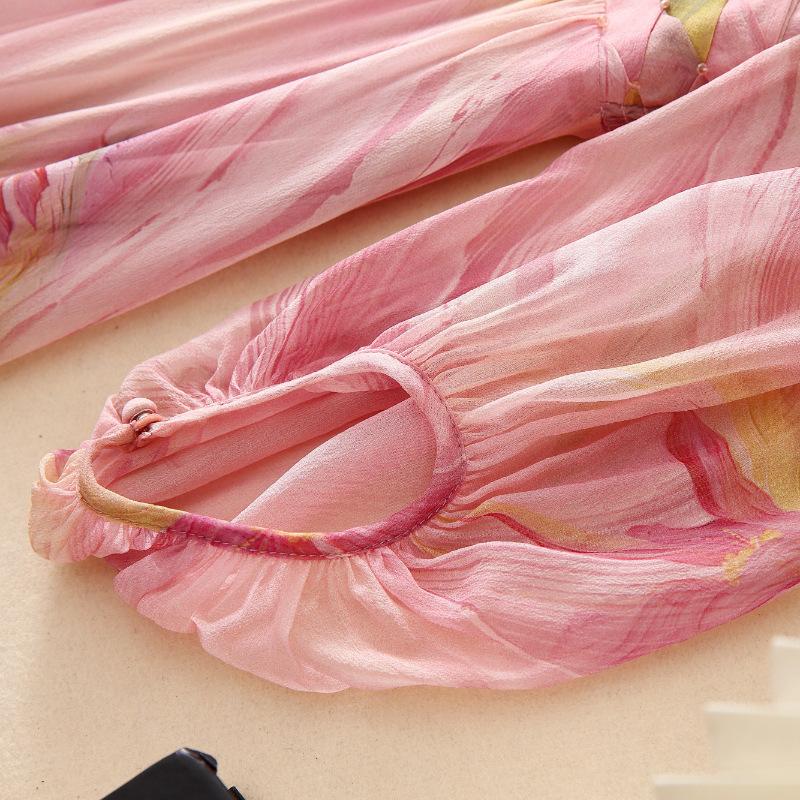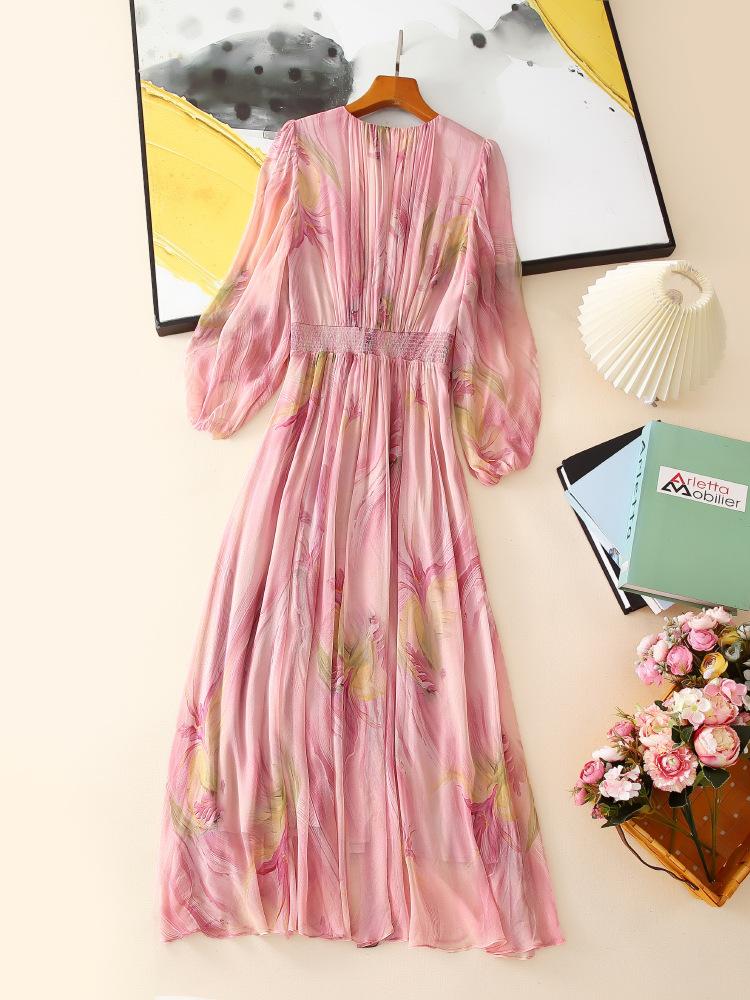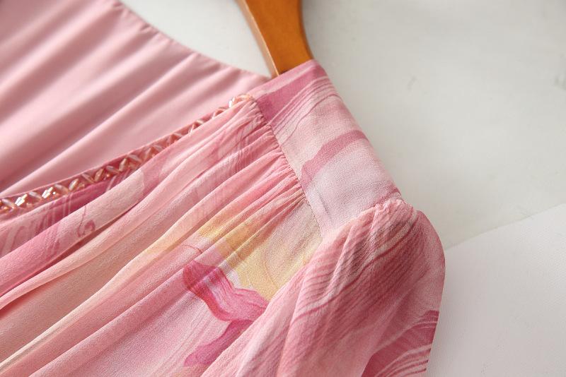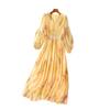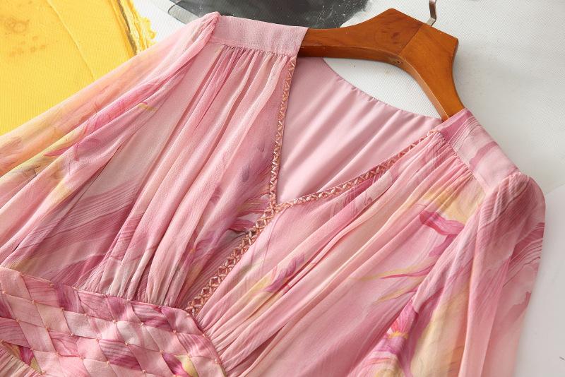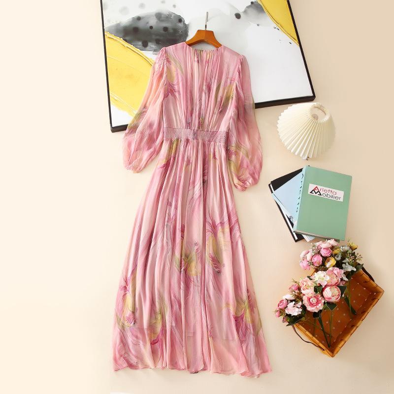 2025 Nuevo Estilo de Verano Moda Francesa Elegante Look Adelgazante de Cintura Cuello en V con Cuentas Vestido Midi de Manga Larga de Seda de Morera