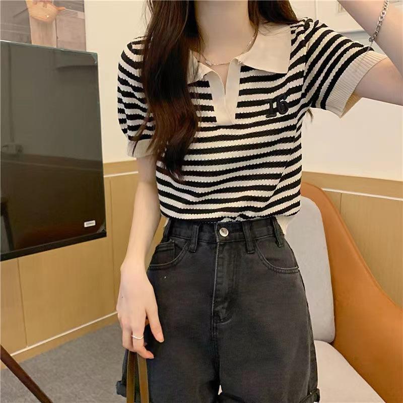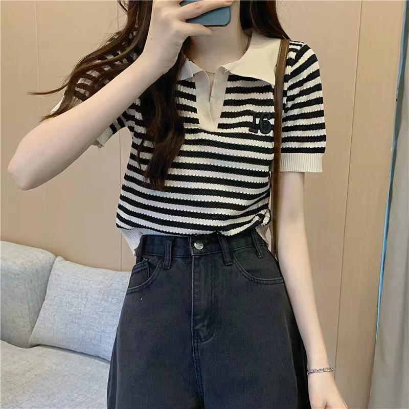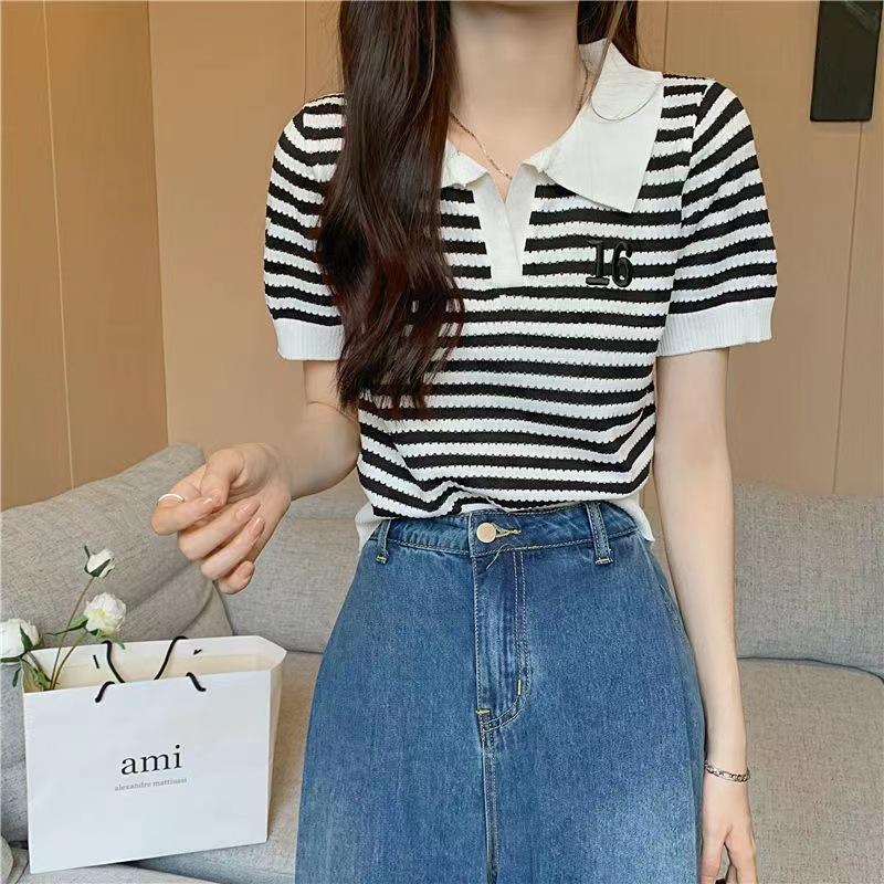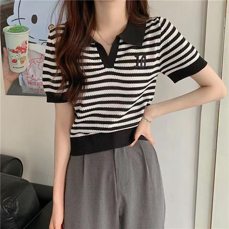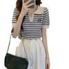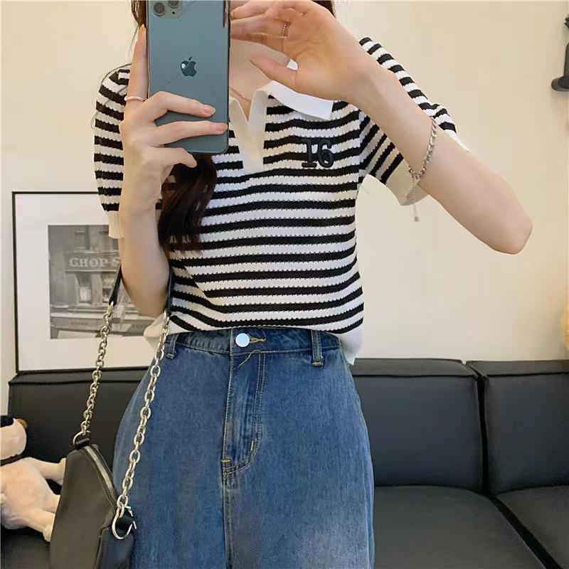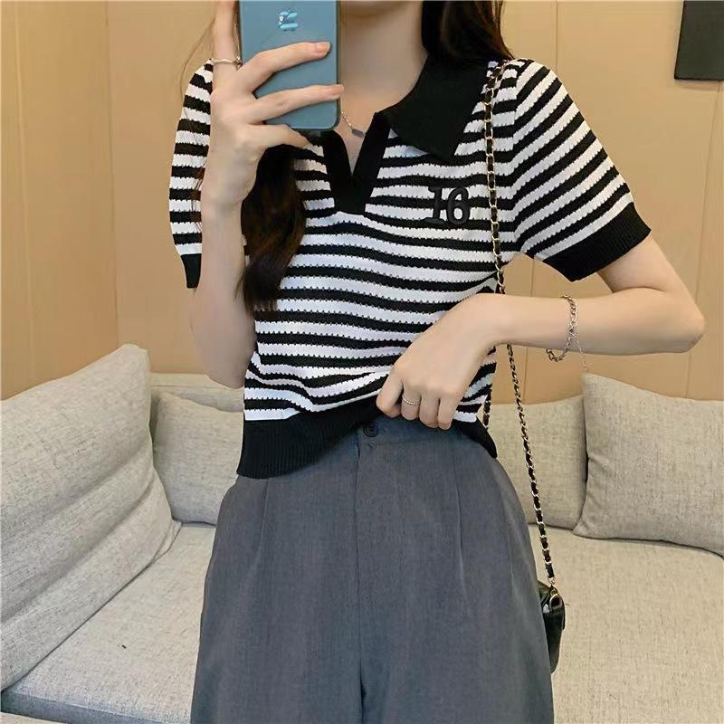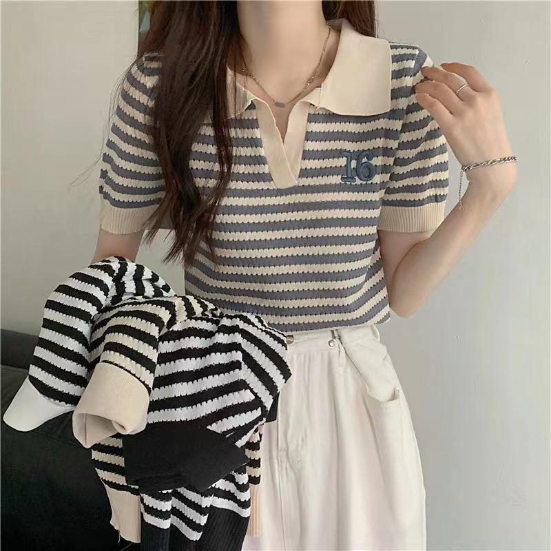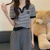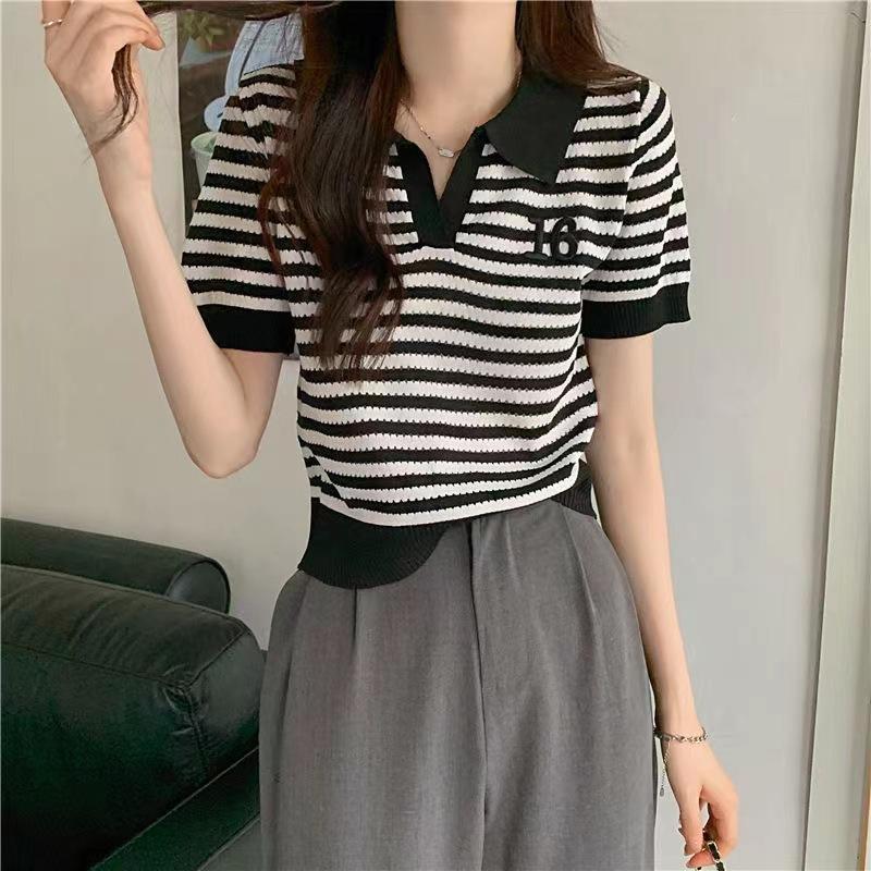 Suéter de solapa a rayas de manga corta para mujer, verano delgado, nuevo estilo coreano, dulce, lindo, top pequeño para mujer, camisa pequeña para mujer