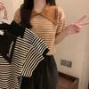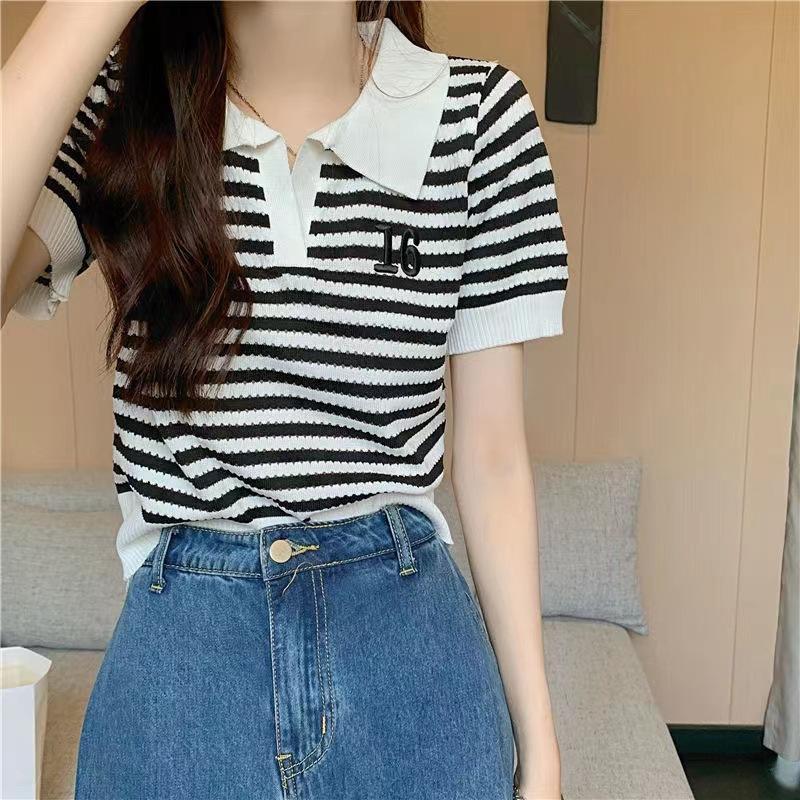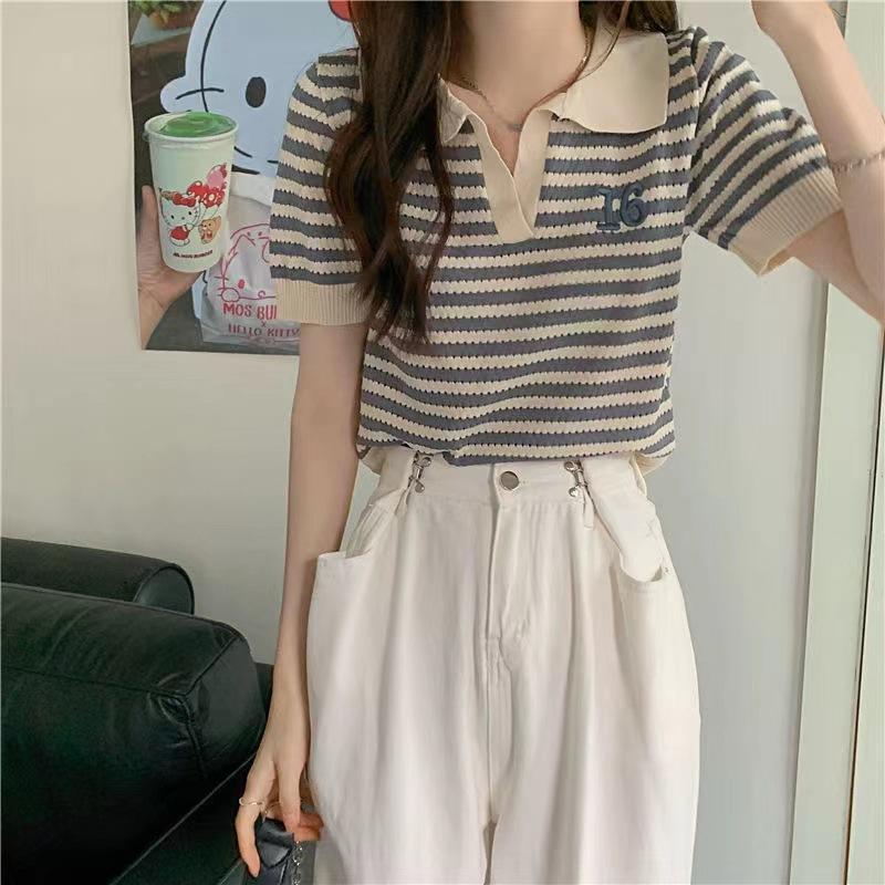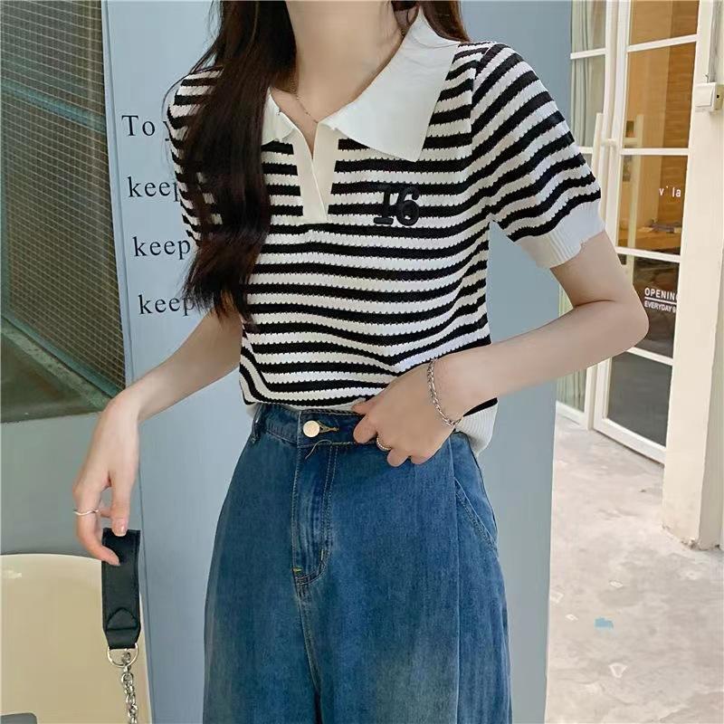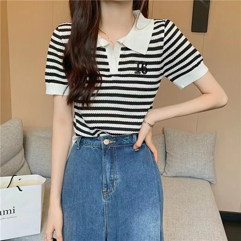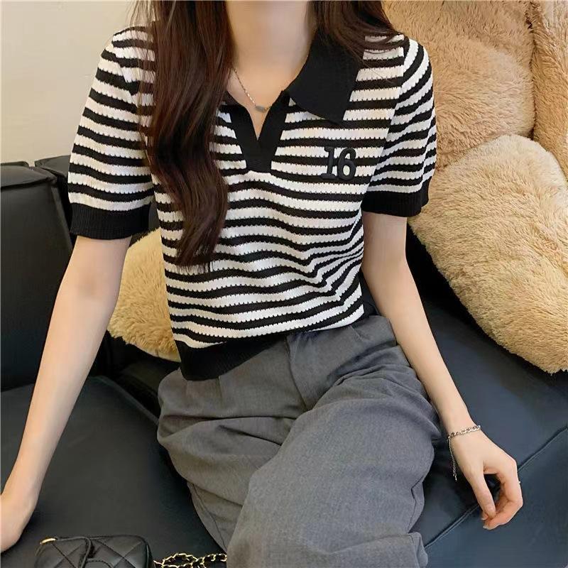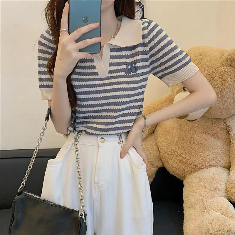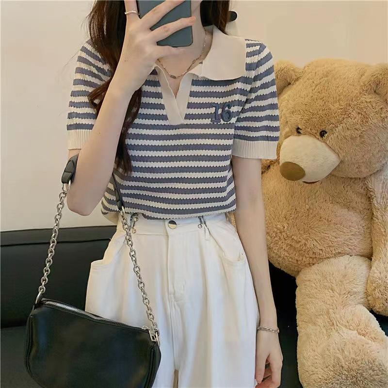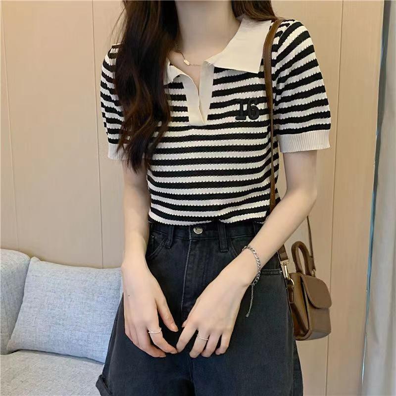 Suéter de solapa a rayas de manga corta para mujer, verano delgado, nuevo estilo coreano, dulce, lindo, top pequeño para mujer, camisa pequeña para mujer