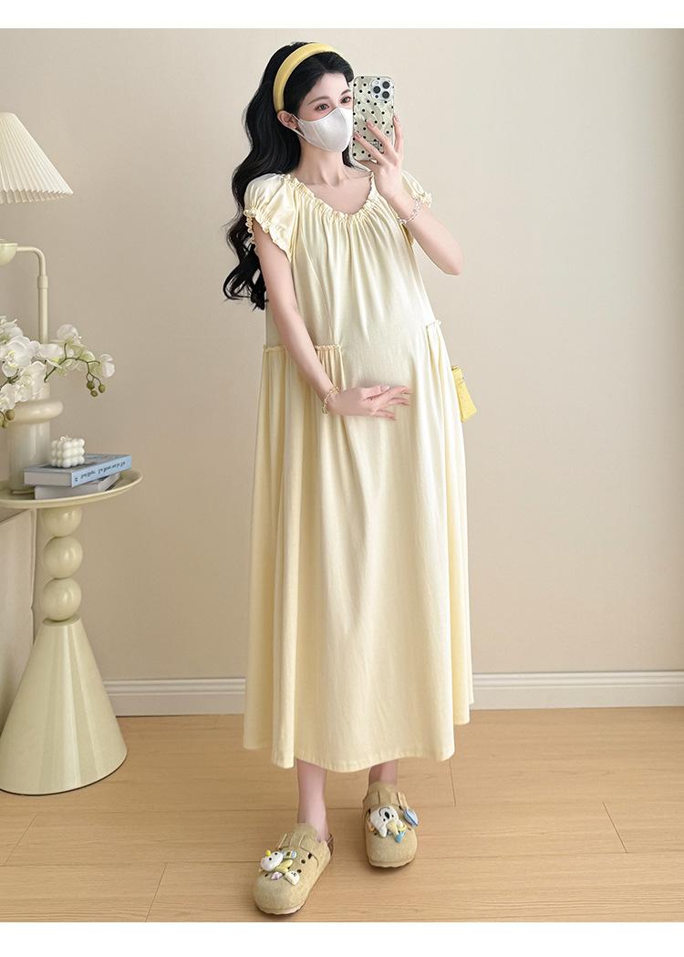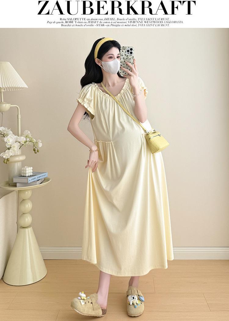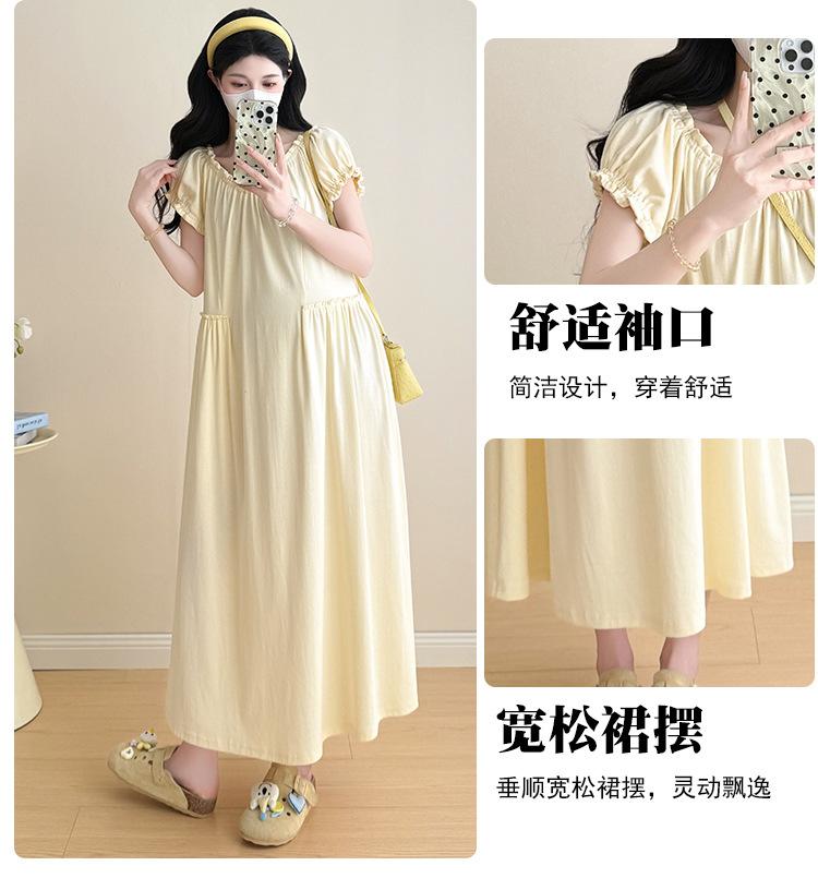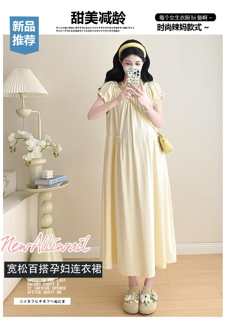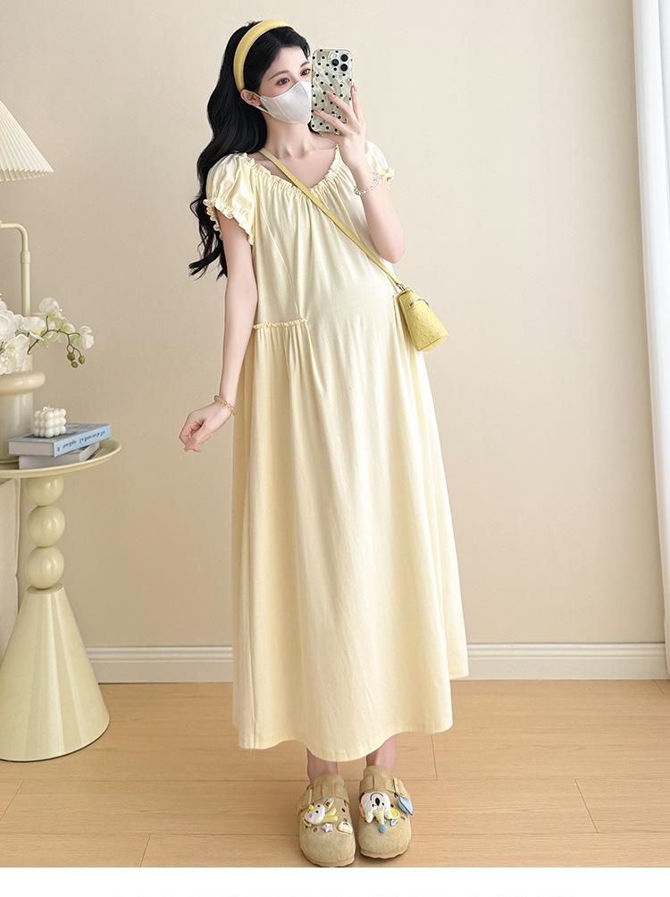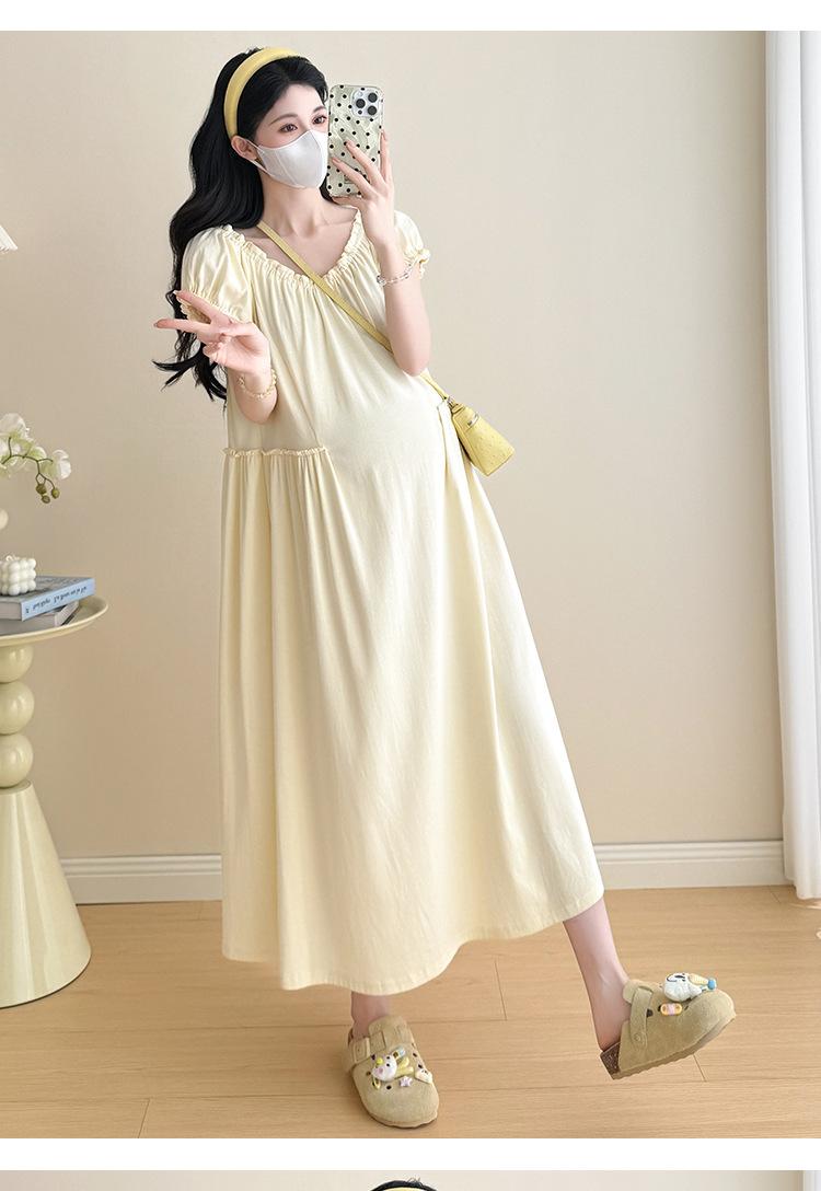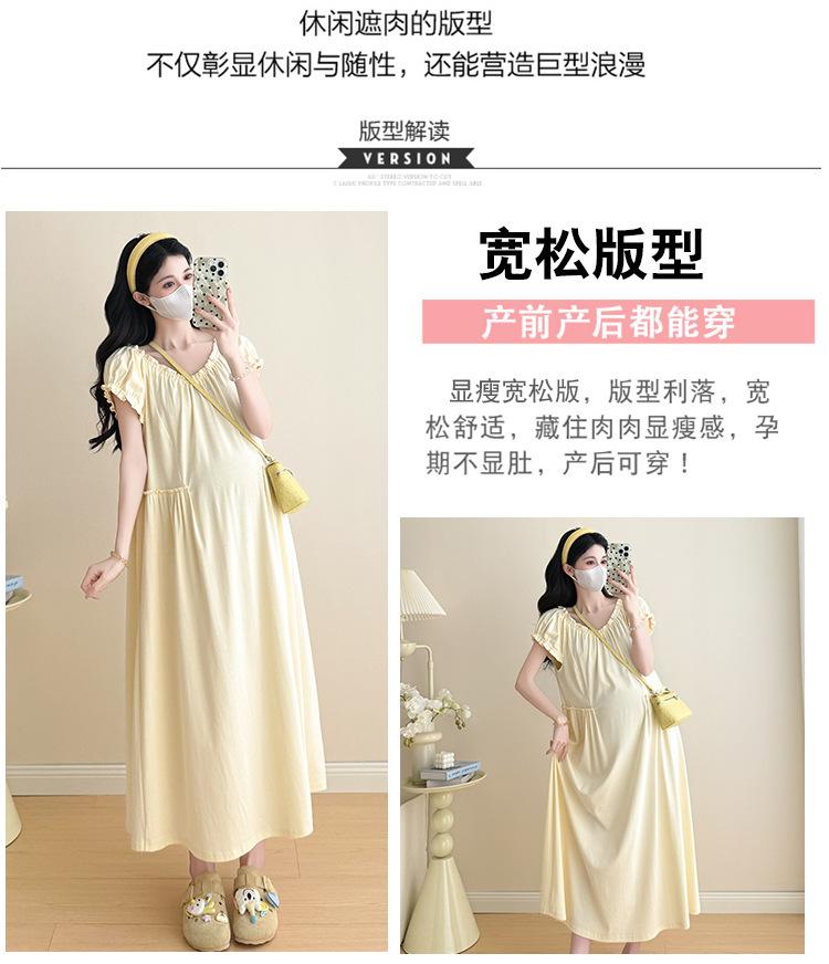 2025 Nuevo Vestido de Maternidad de Verano Coreano de Encaje de Manga Corta Holgado Casual Cuello en V Look Adelgazante Vestido Largo de Maternidad
