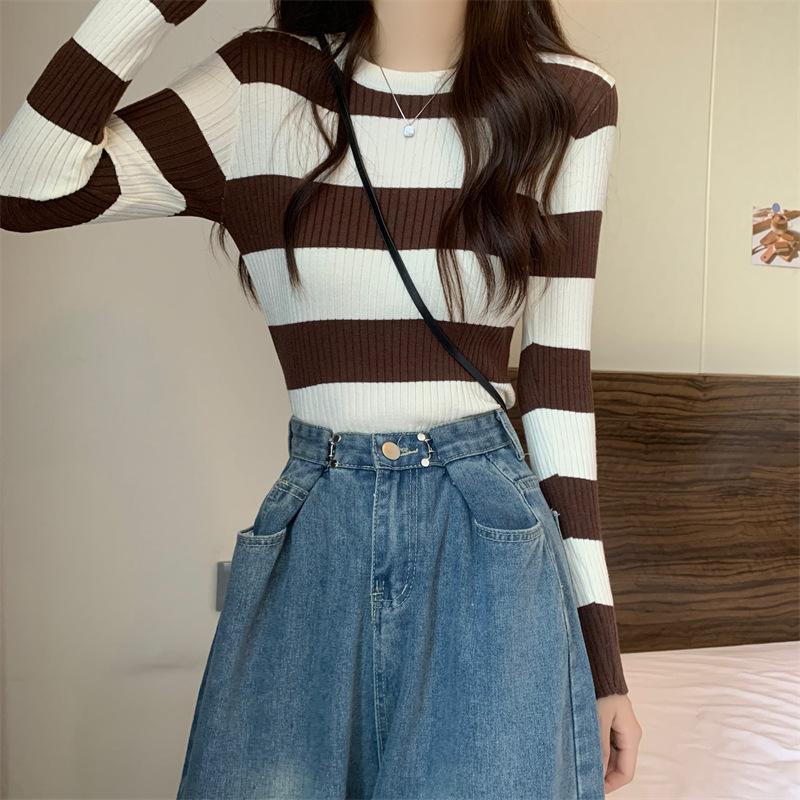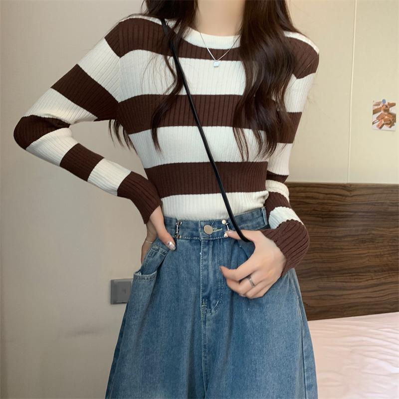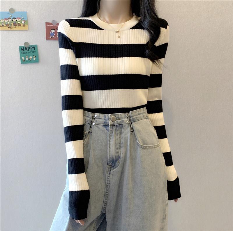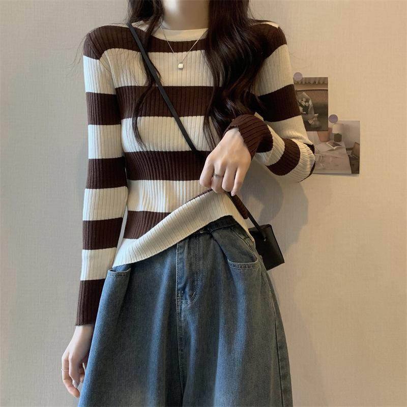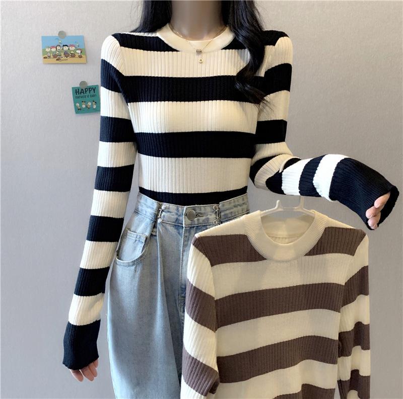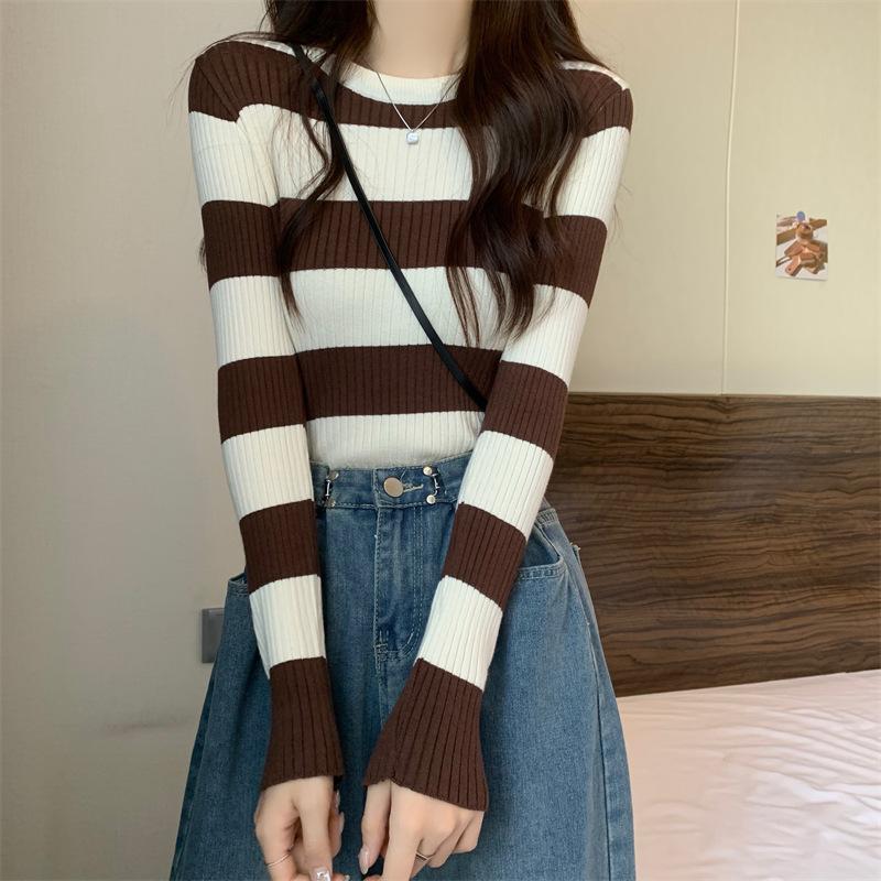 2024 primavera y otoño a rayas tejido manga larga camiseta básica top nuevo delgado adelgazante suéter versátil moderno simple