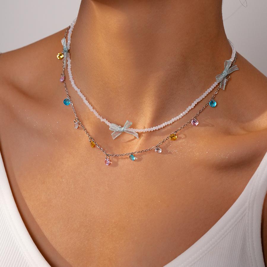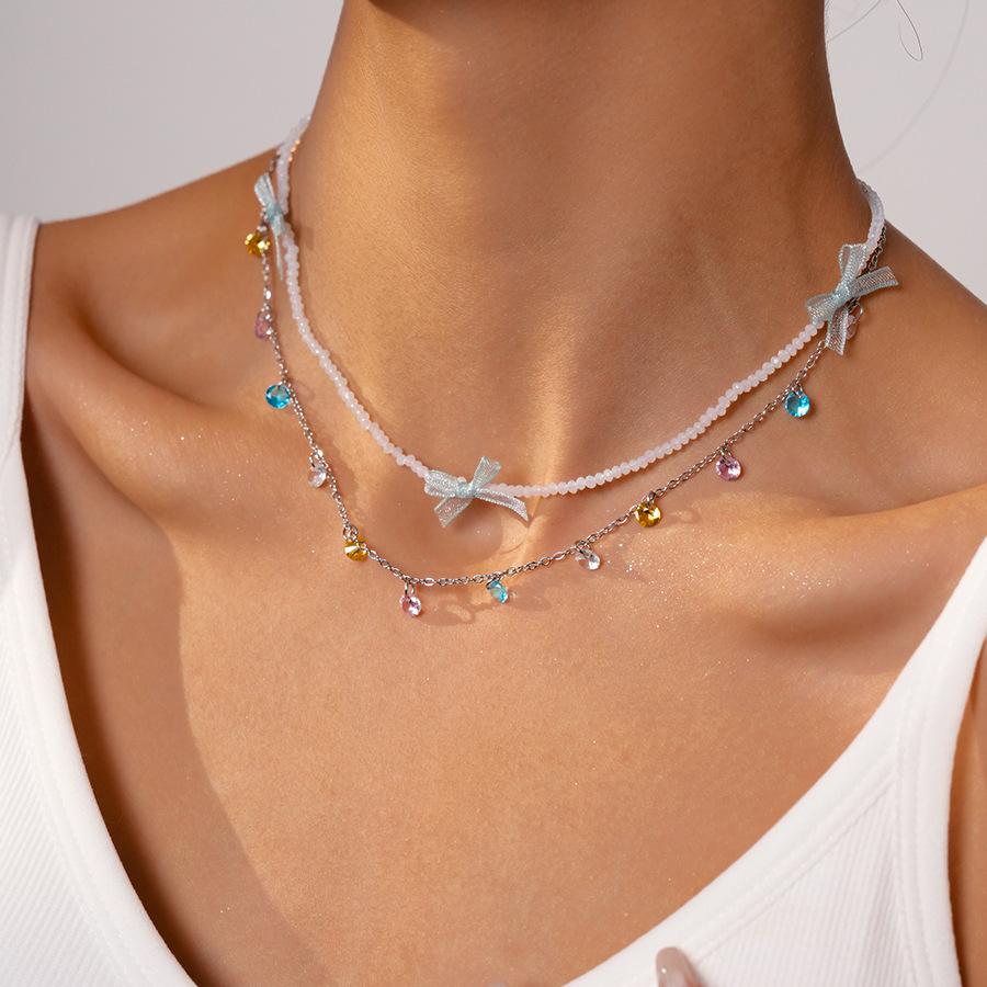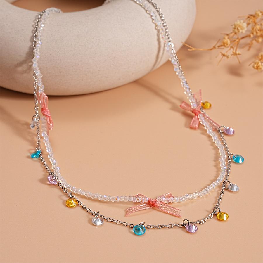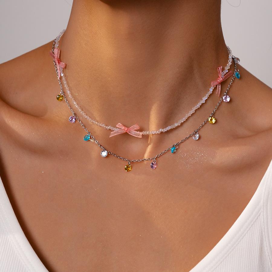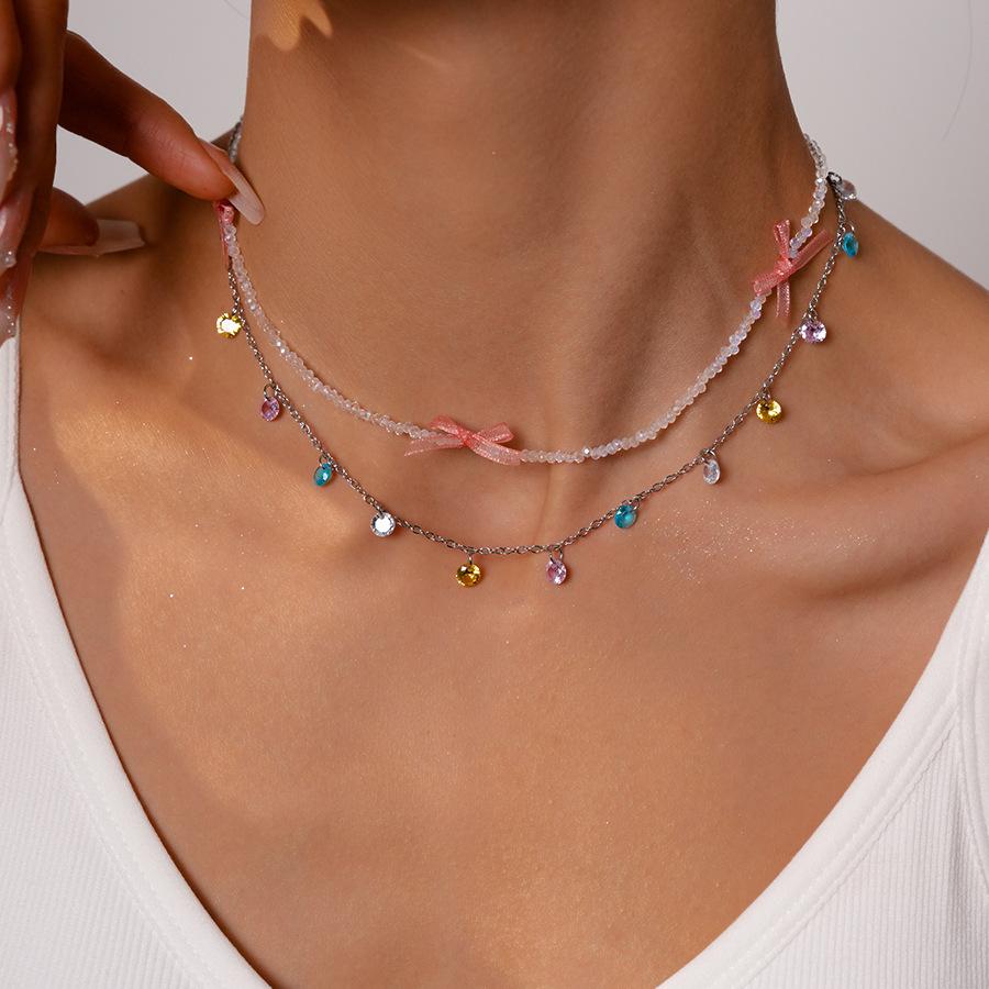 Set de Dos Piezas de Dulce Collar de Cuentas de Acero de Titanio con Circonita y Cristal Artificial con Lazo, Nicho Elegante de Alta Gama para Mujer