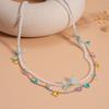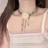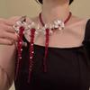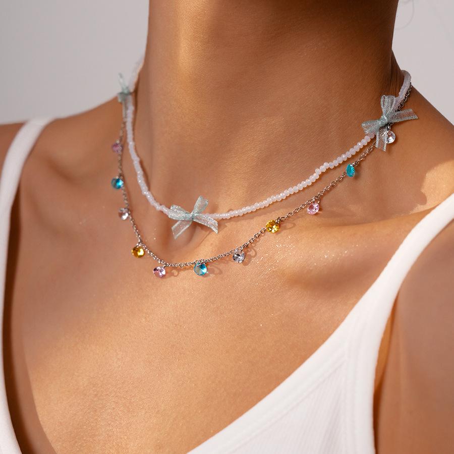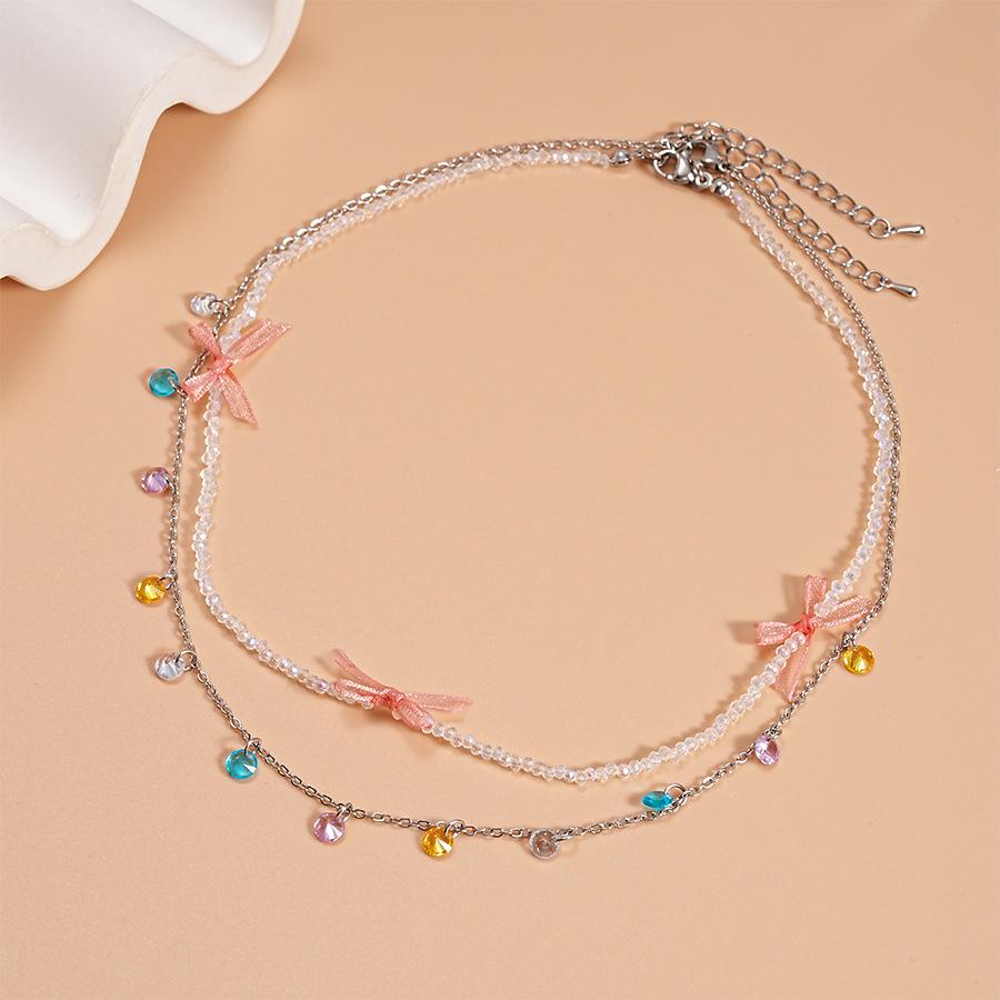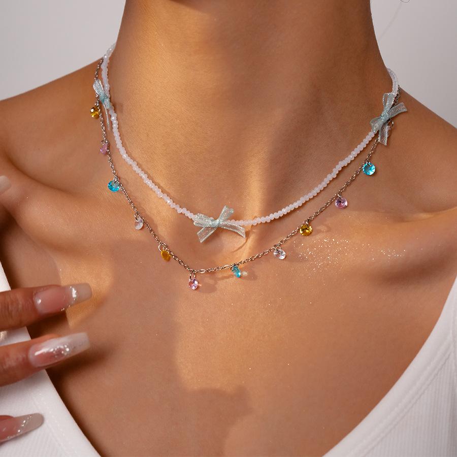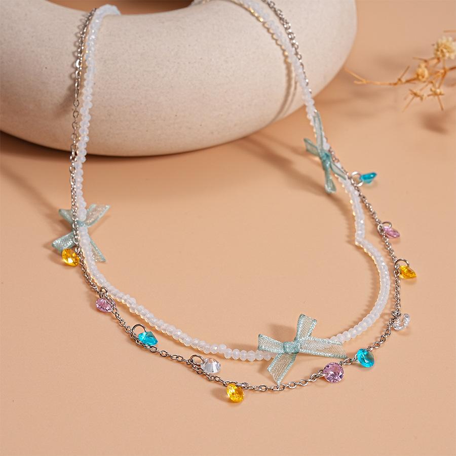 Set de Dos Piezas de Dulce Collar de Cuentas de Acero de Titanio con Circonita y Cristal Artificial con Lazo, Nicho Elegante de Alta Gama para Mujer