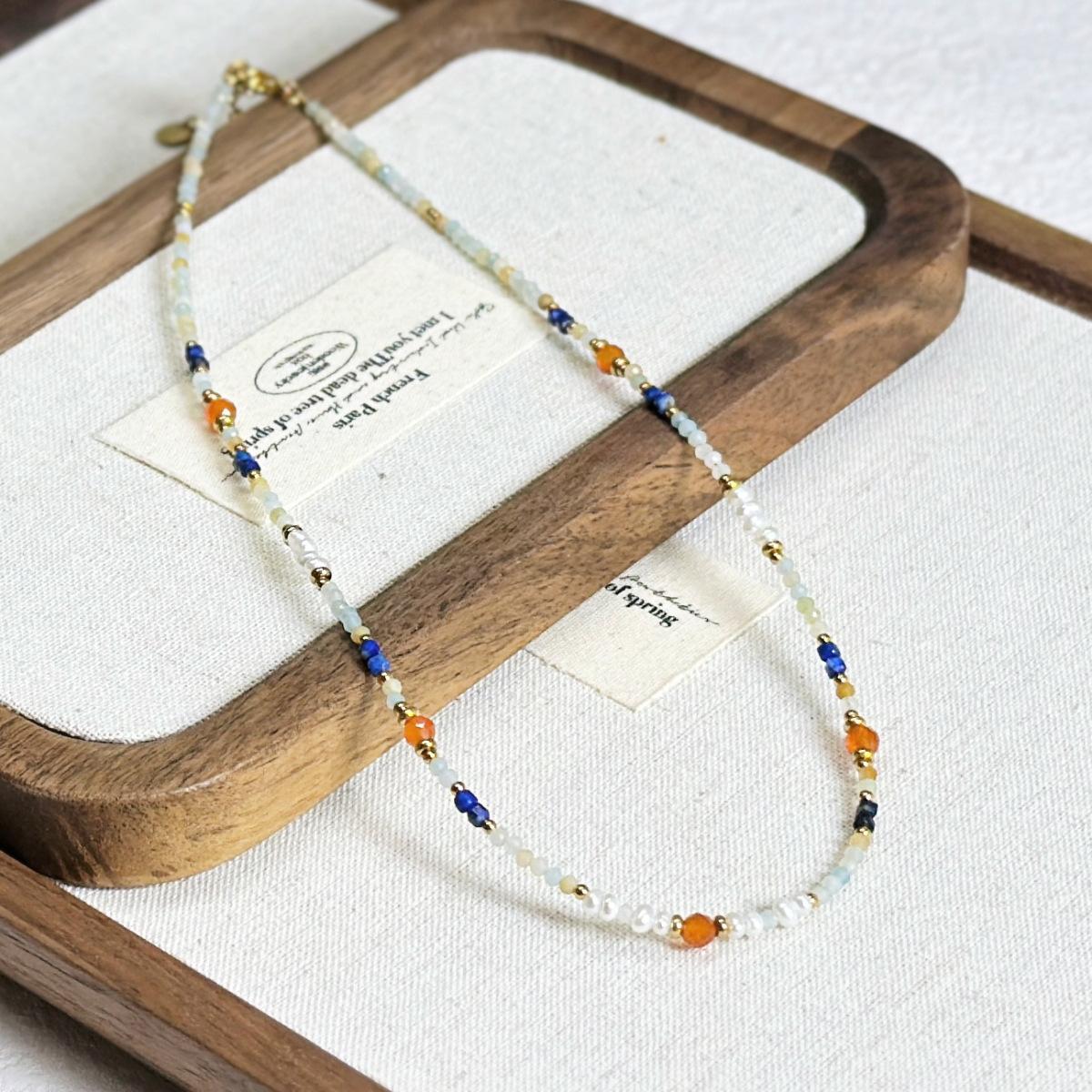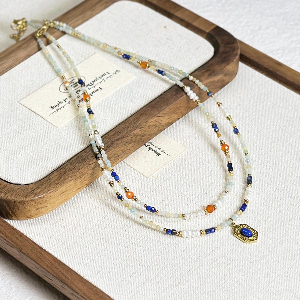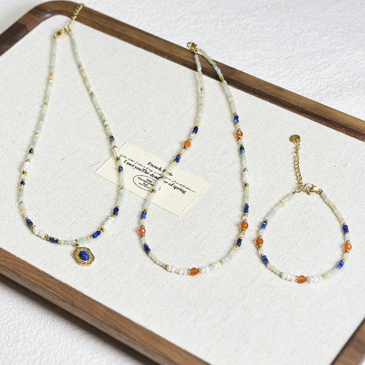 Amazonite red agate lapis lazuli freshwater pearl necklace - titanium steel