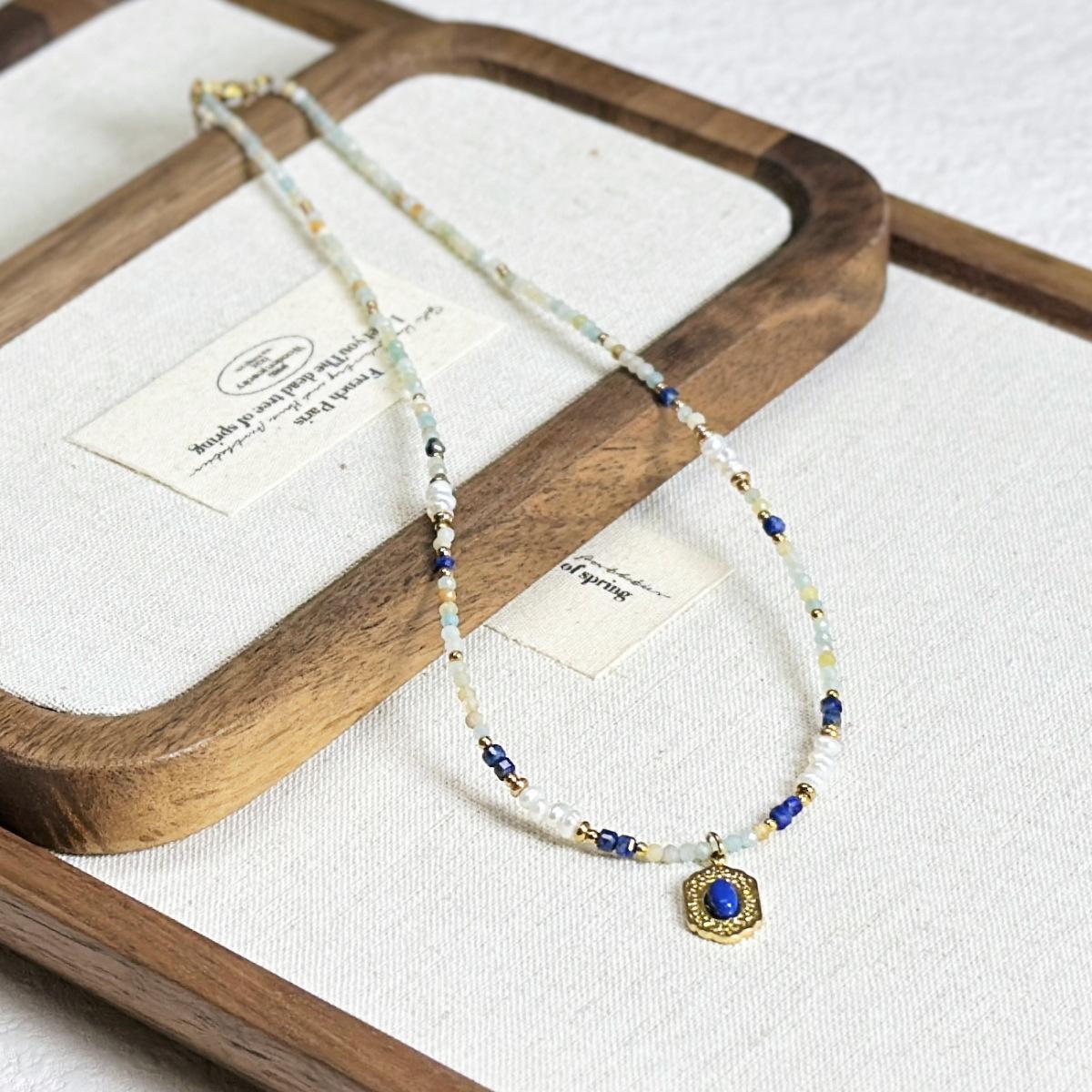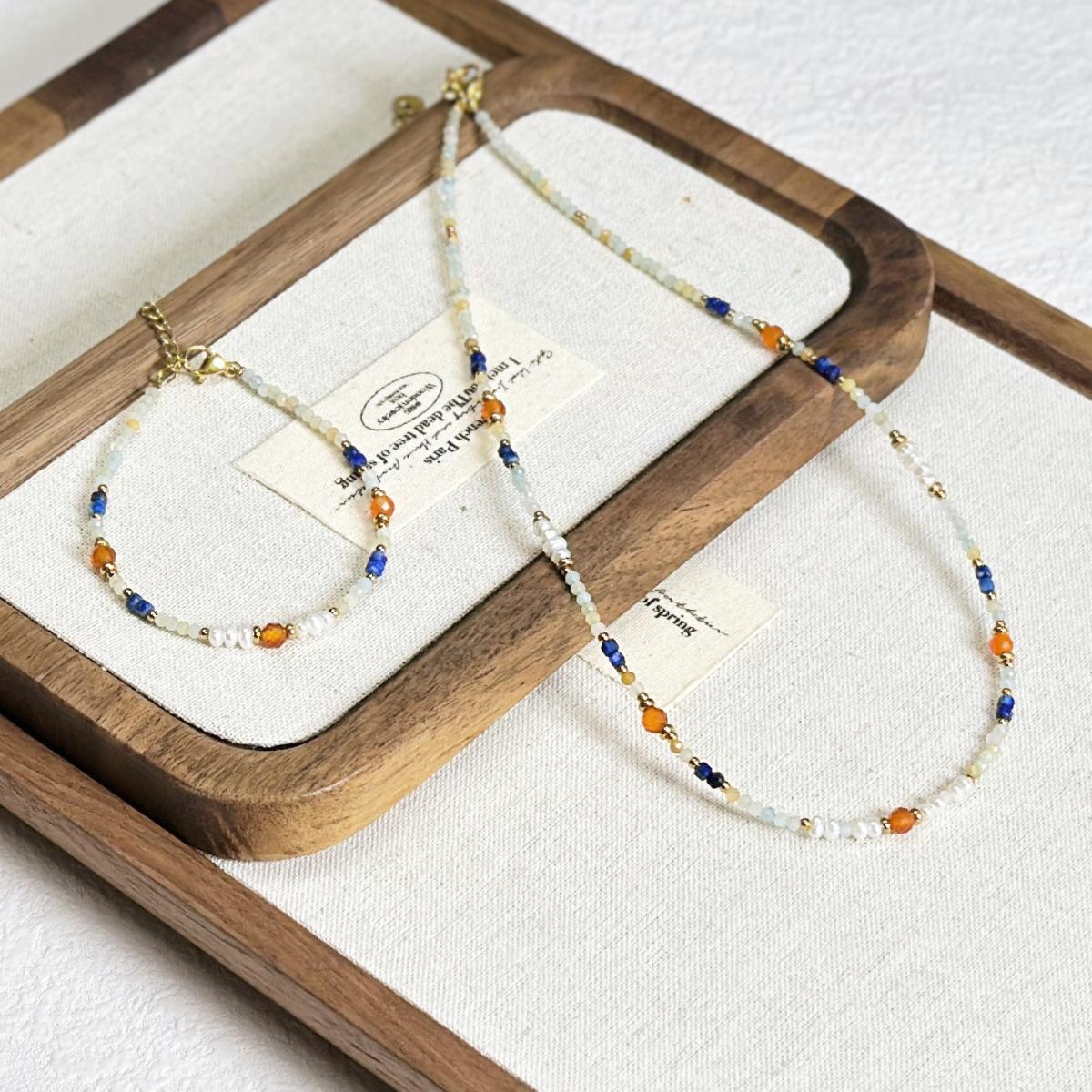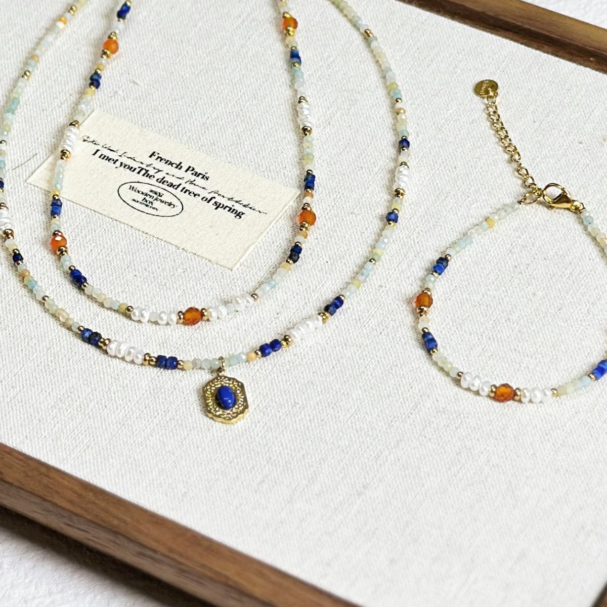 Amazonite red agate lapis lazuli freshwater pearl necklace - titanium steel