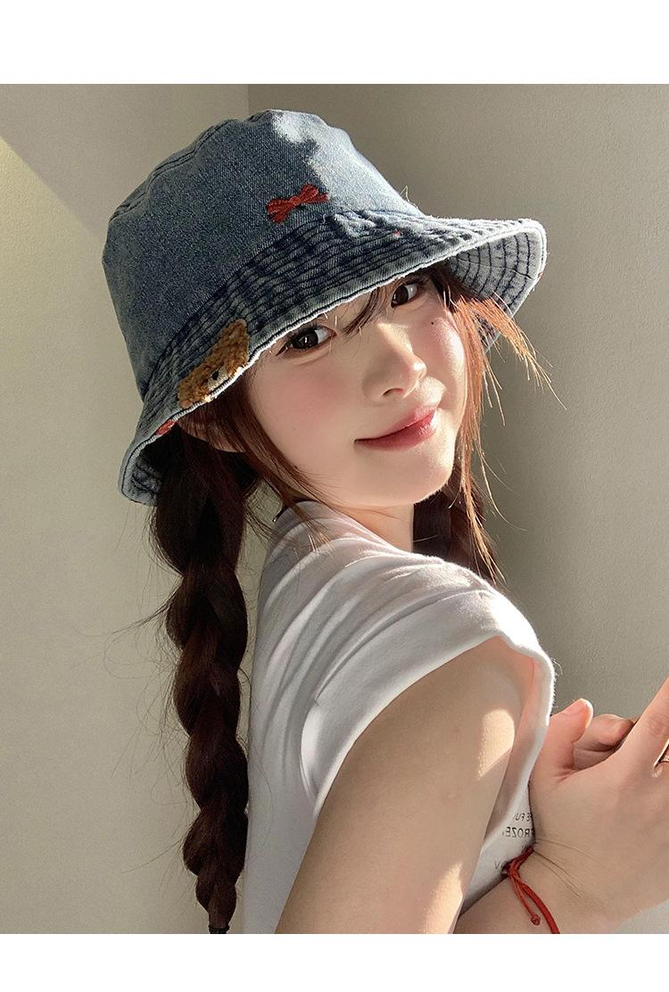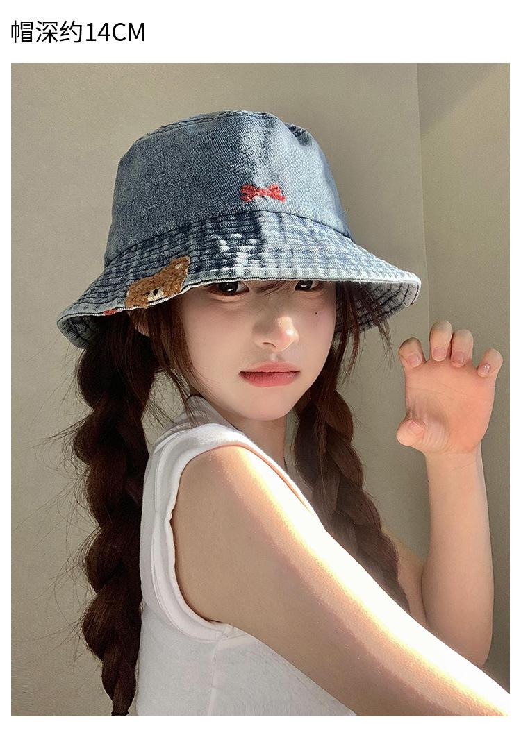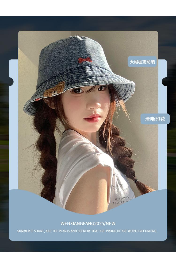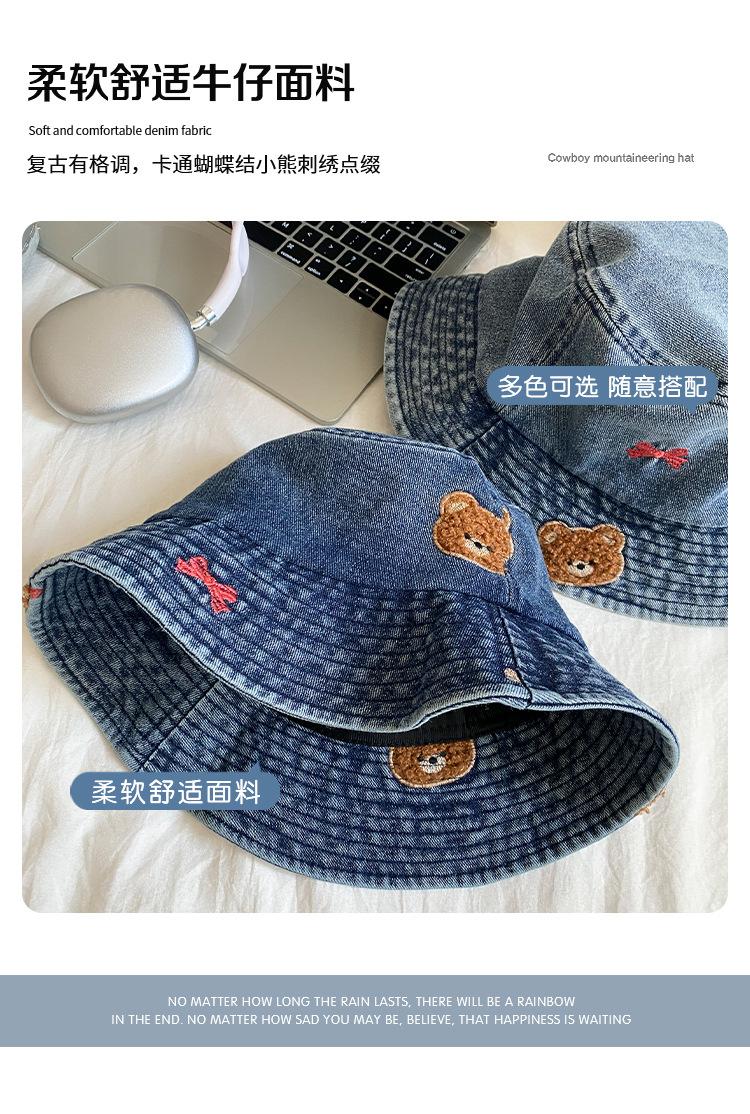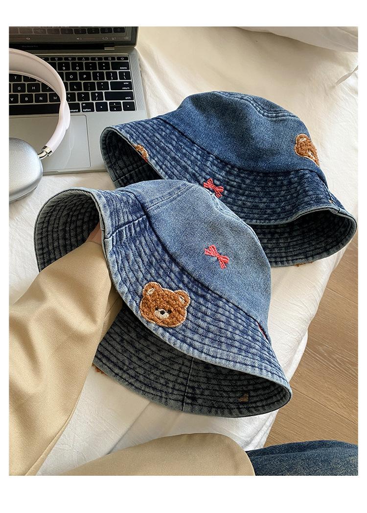 Sombrero de Pescador de Mezclilla Bordado con Oso Lindo Japonés para Mujer 2025 Nuevo Cara de Cabeza Grande Pequeña Versátil Sombrero de Cubeta