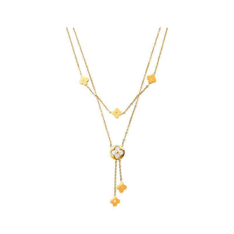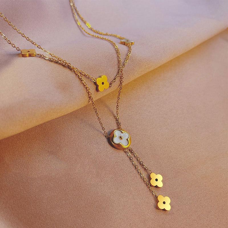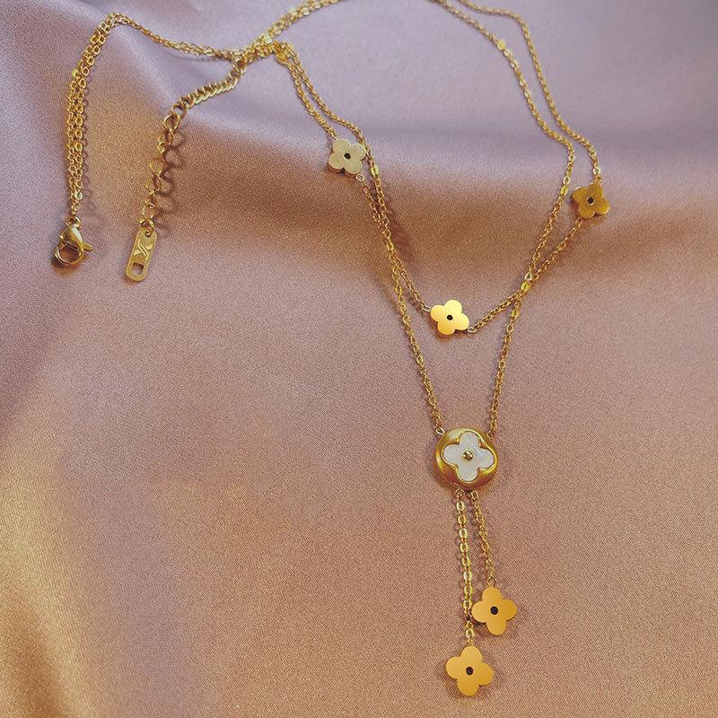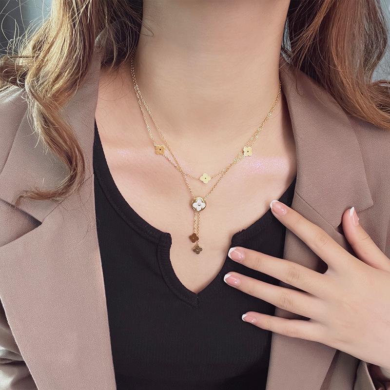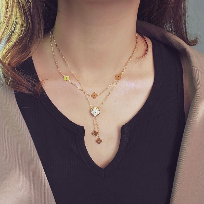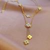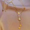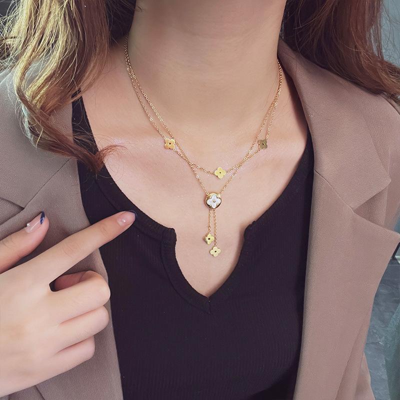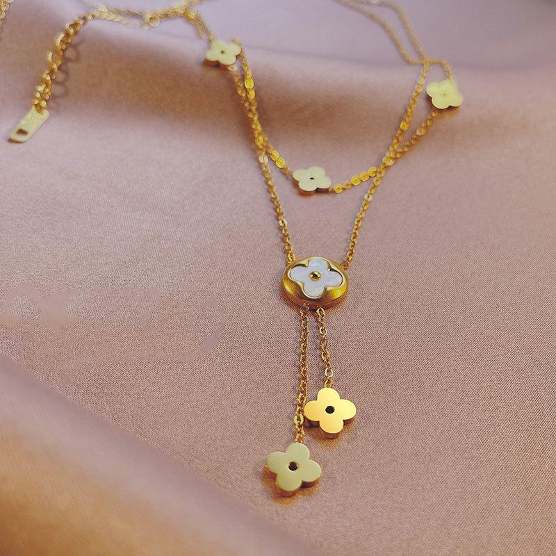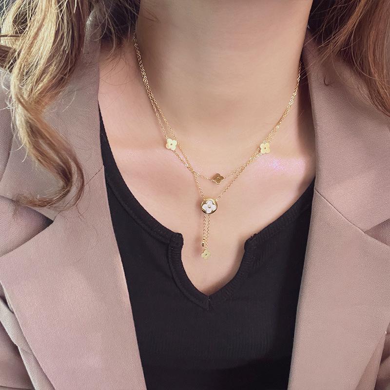 Collar de Alta Gama 2025 Nuevo para Mujer Acero de Titanio Doble Capa Flor de Cuatro Hojas Cadena Clavícula Colgante con Borla Joyería Popular