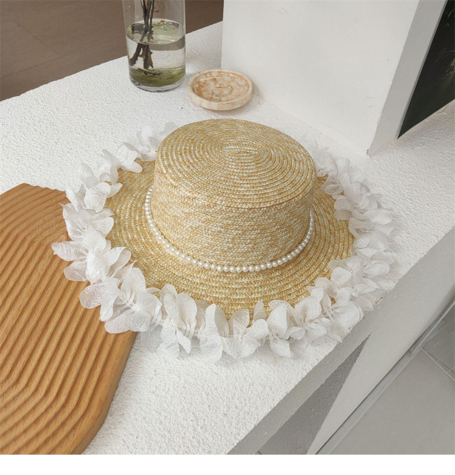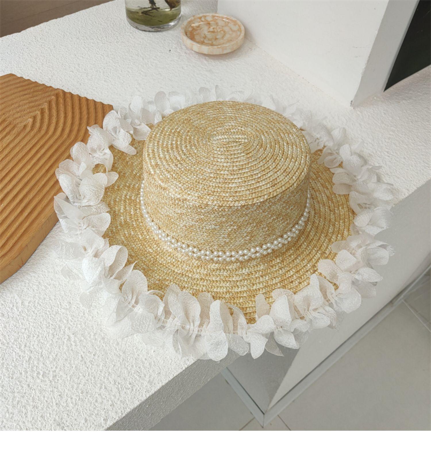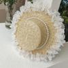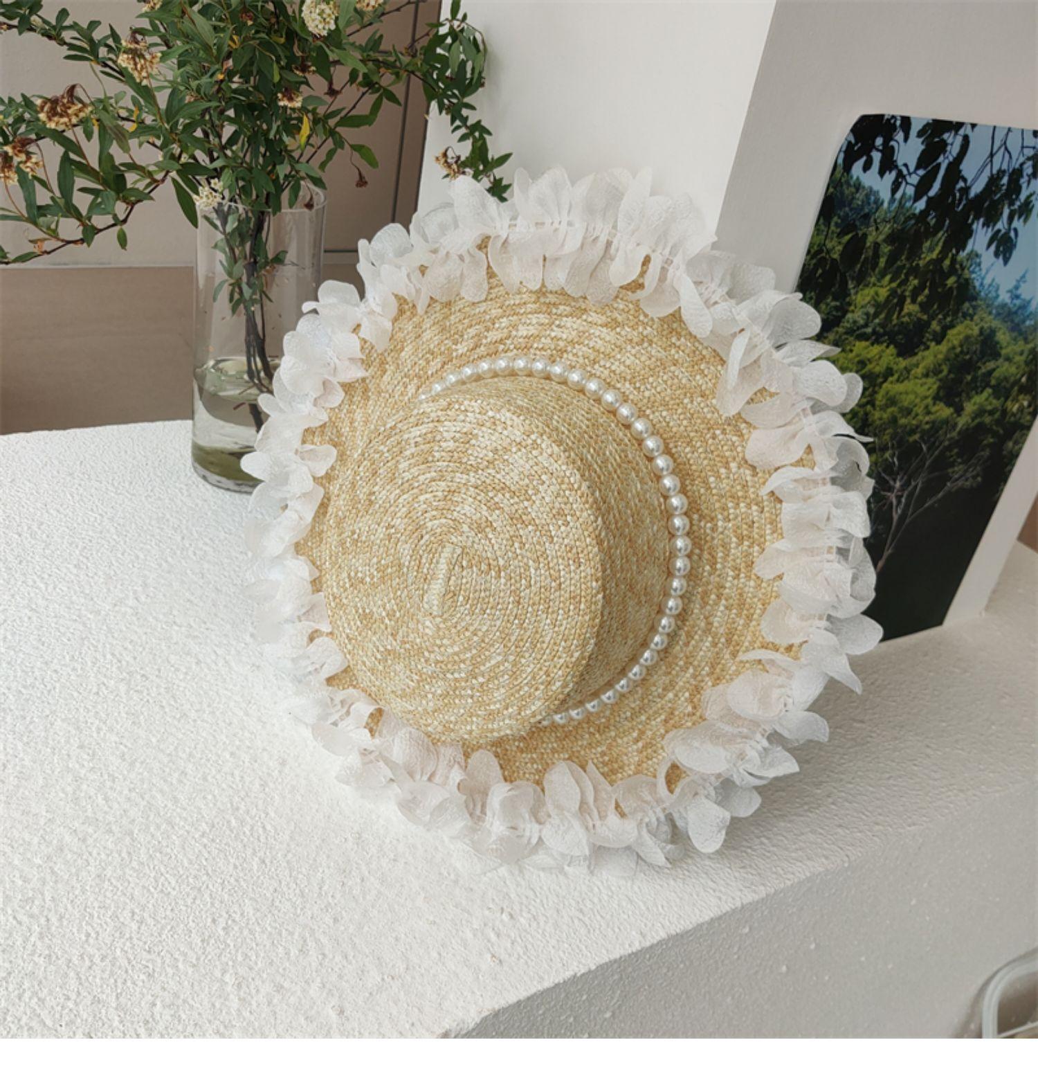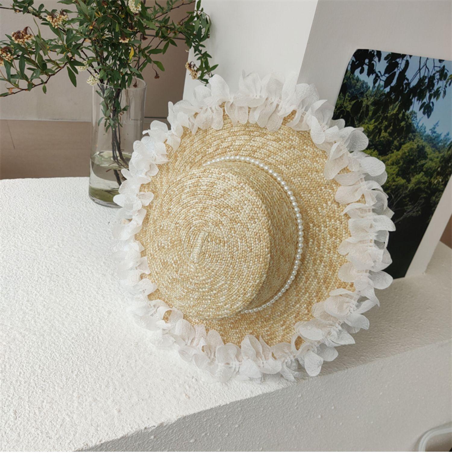 Sombrero de Paja de Copa Plana con Encaje de Perlas para Mujer Verano Viaje Foto Sombrero de Hada Sombrero para el Sol Protección Solar Sombrero para el Sol
