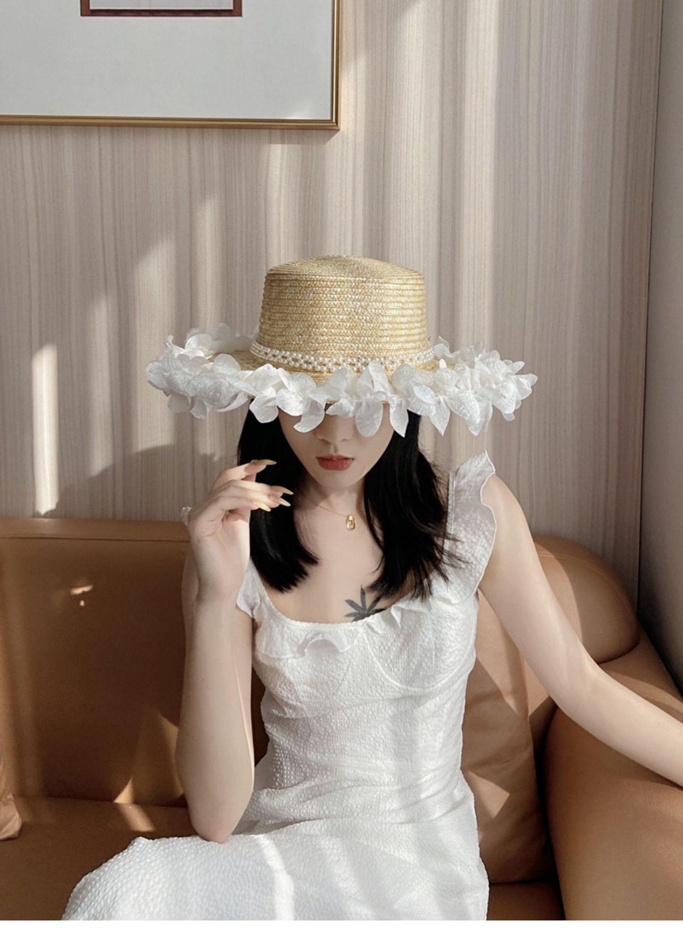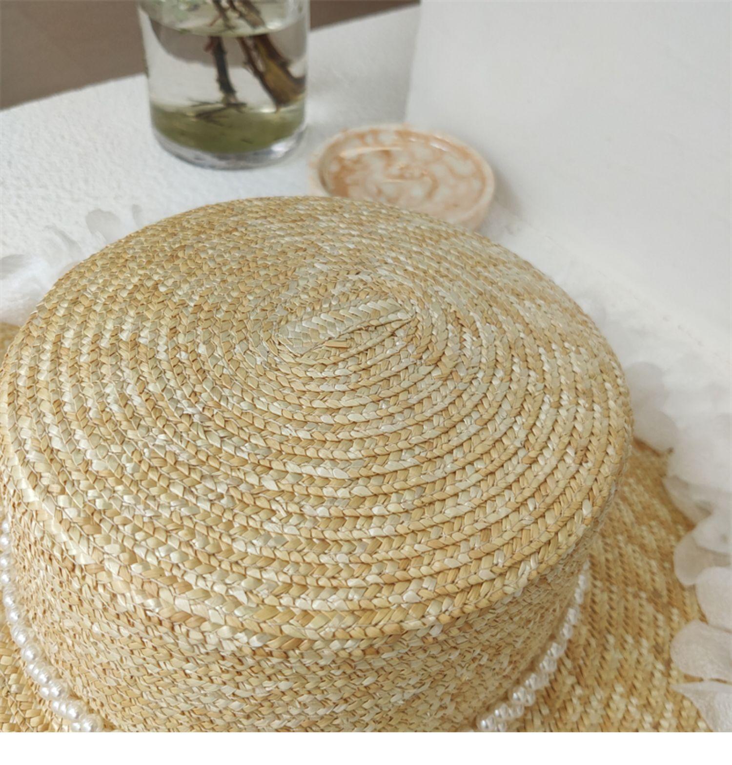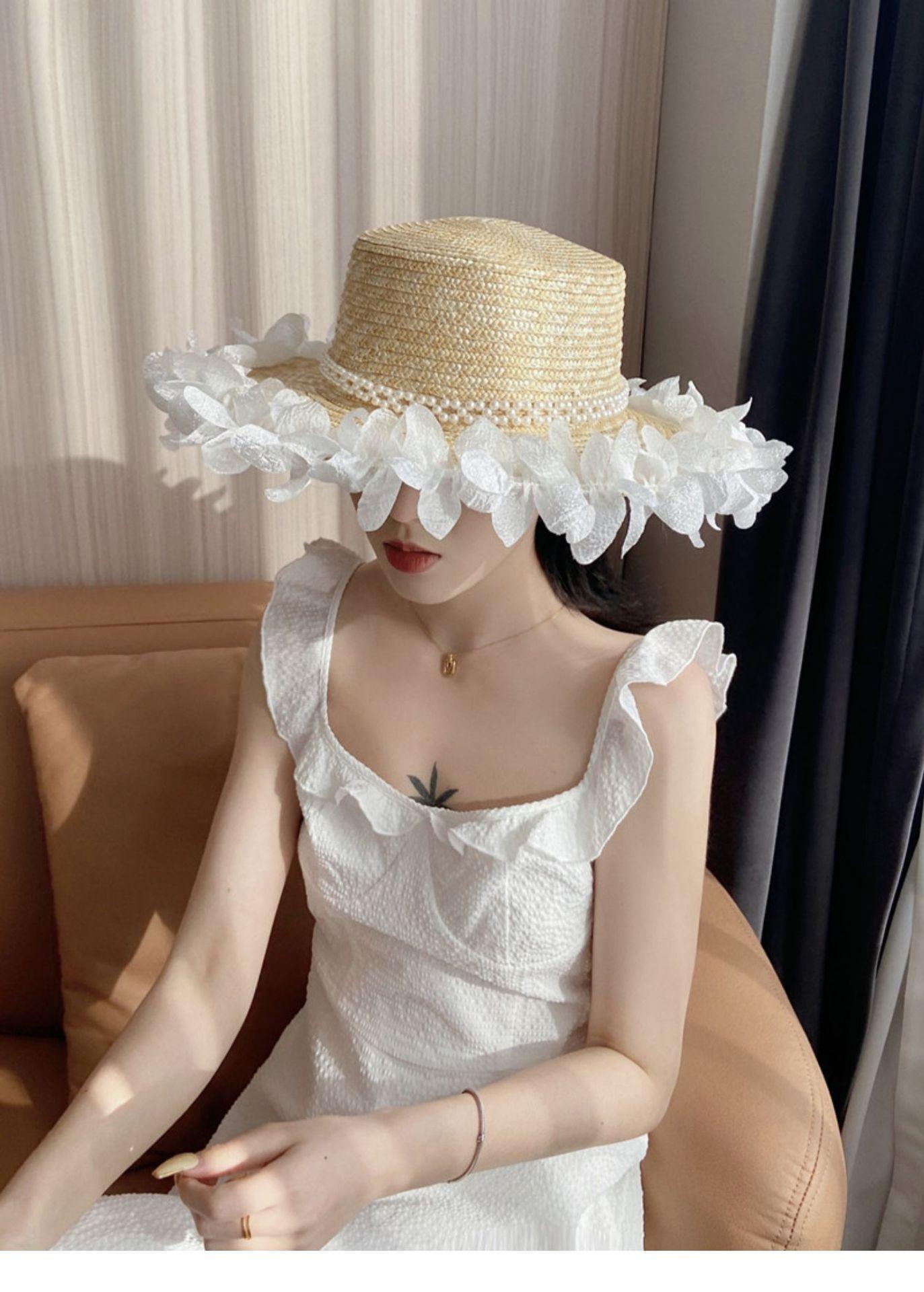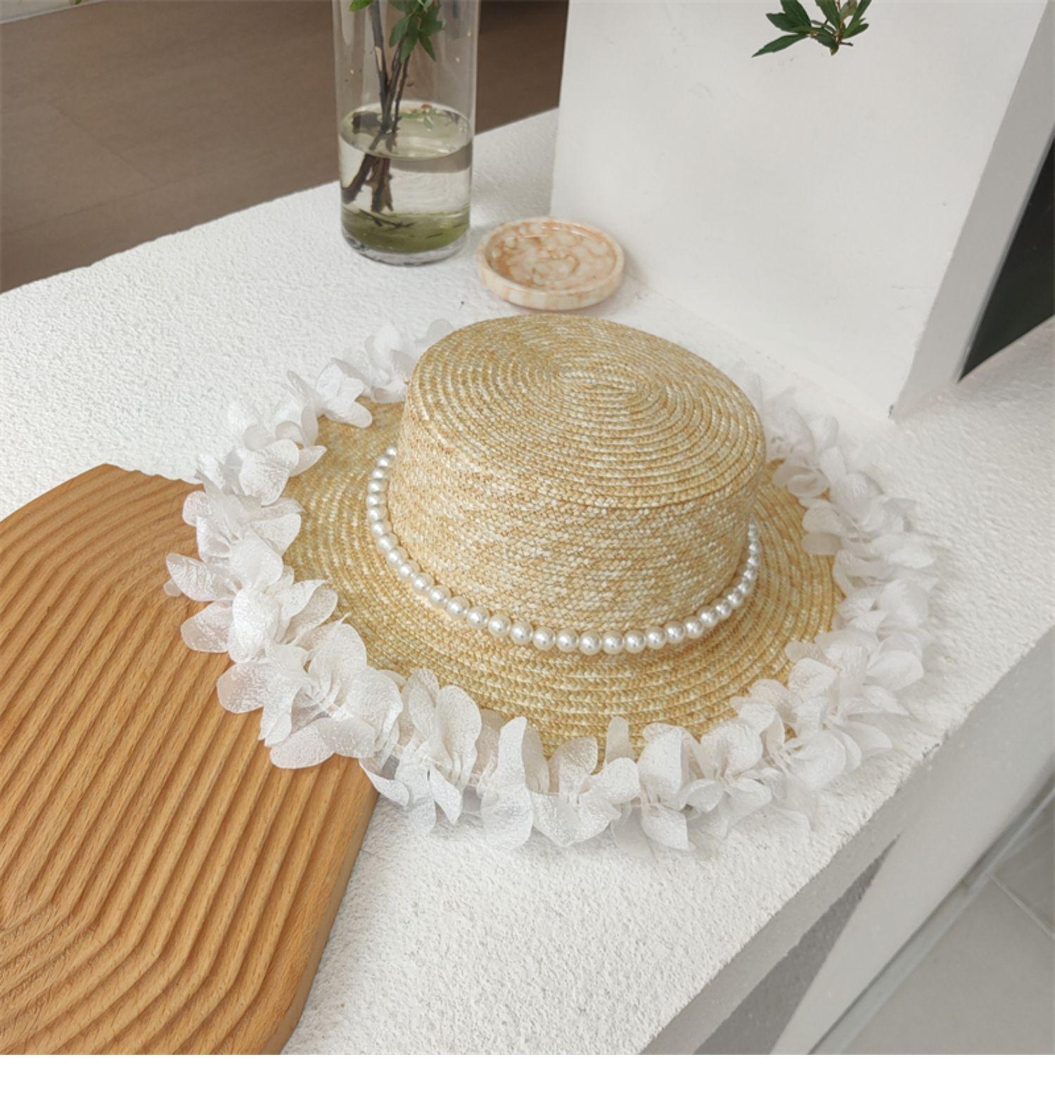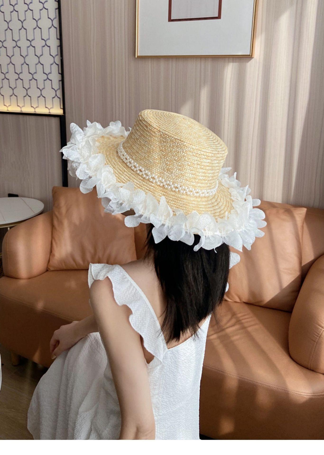 Sombrero de Paja de Copa Plana con Encaje de Perlas para Mujer Verano Viaje Foto Sombrero de Hada Sombrero para el Sol Protección Solar Sombrero para el Sol