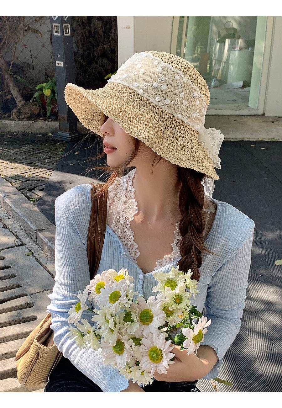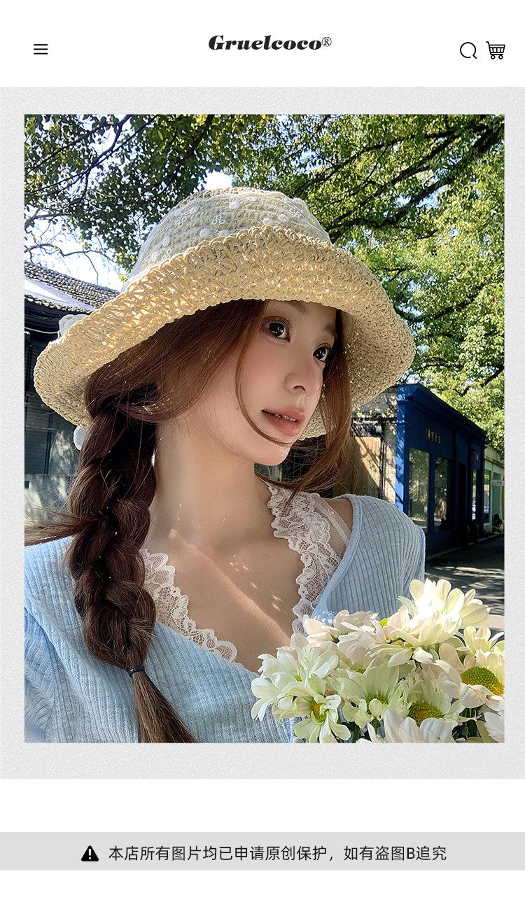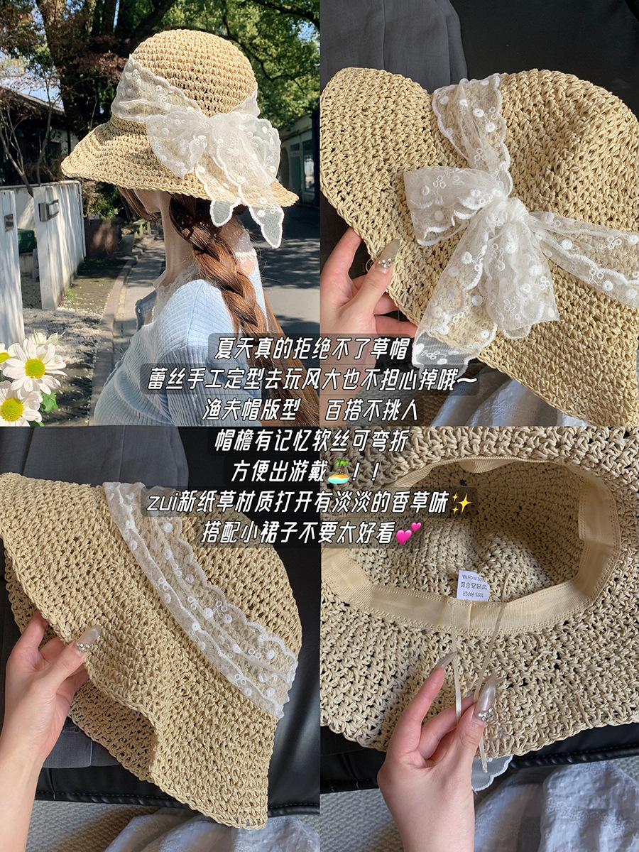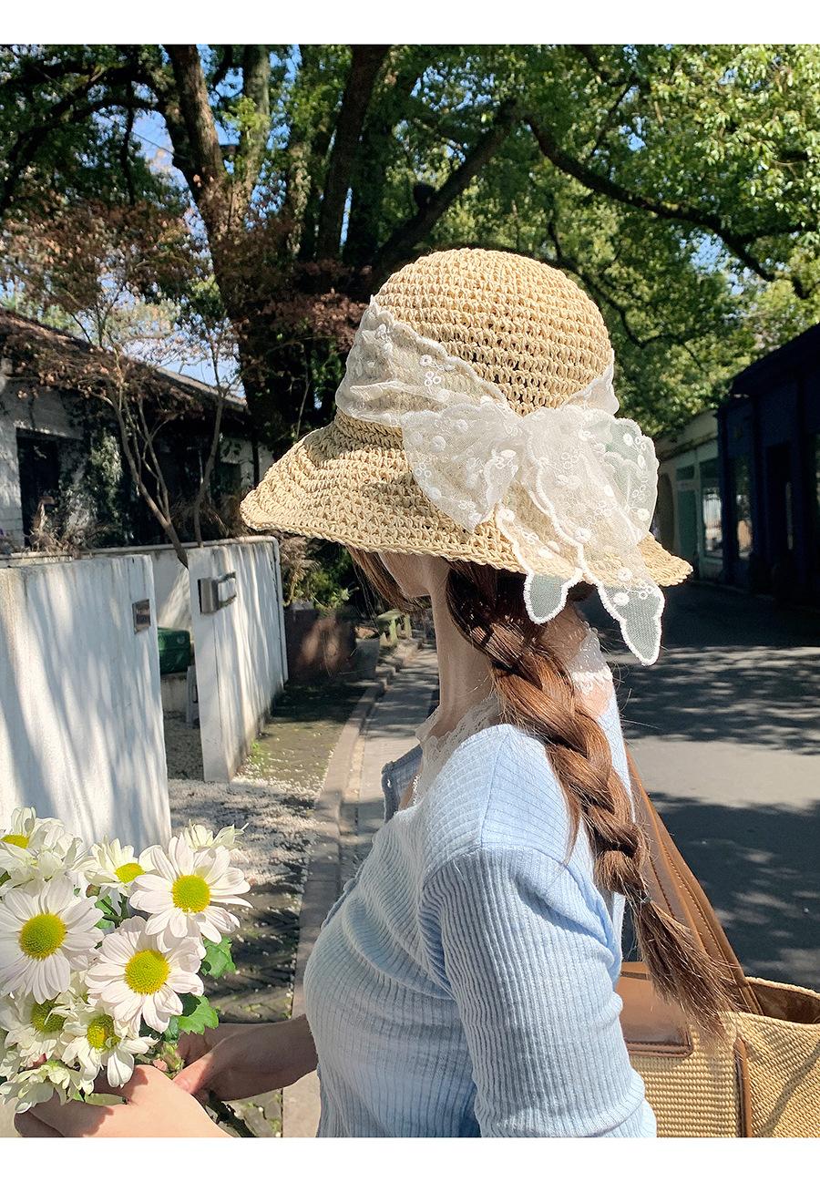 Sombrero de Paja con Lazo de Encaje Francés y Dulce Calado para Mujer 2025 Nuevo Primavera y Verano Estilo Resort Costero Sombrilla Sombrero de Pescador