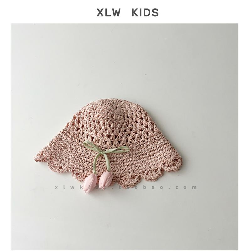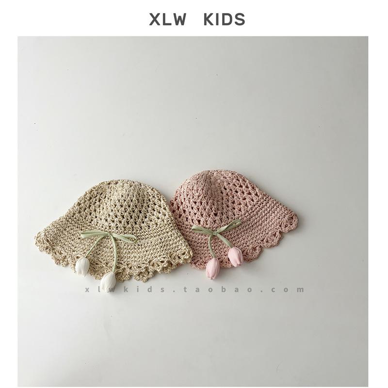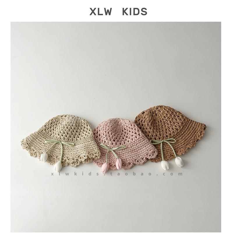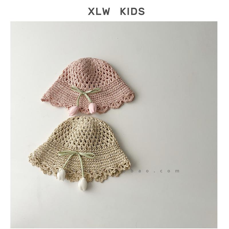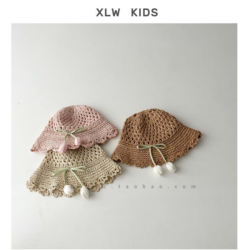 Sombrero de Pescador Infantil de Verano Estilo Ins Tulipán para Niña Bebé Protección Solar Sombrero de Paja Tejido Calado Hecho a Mano
