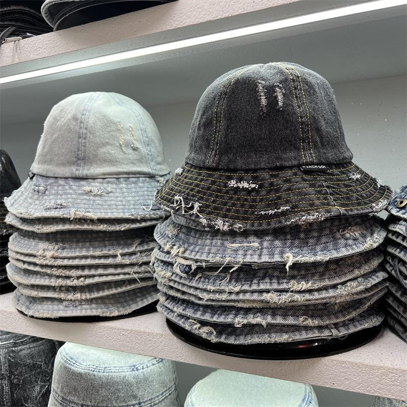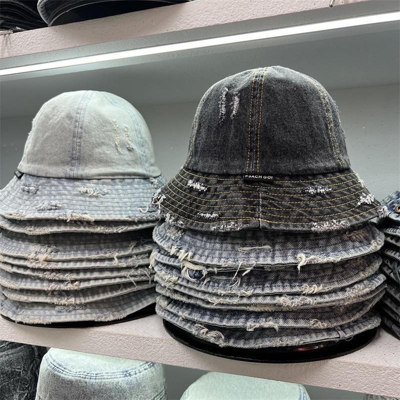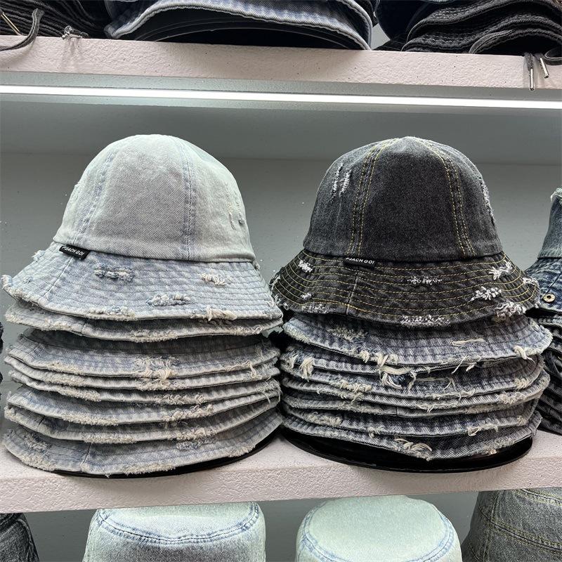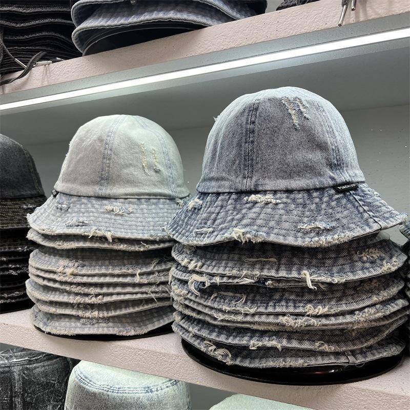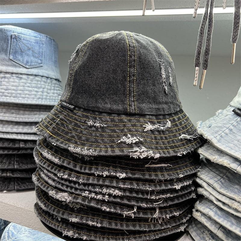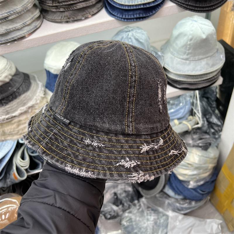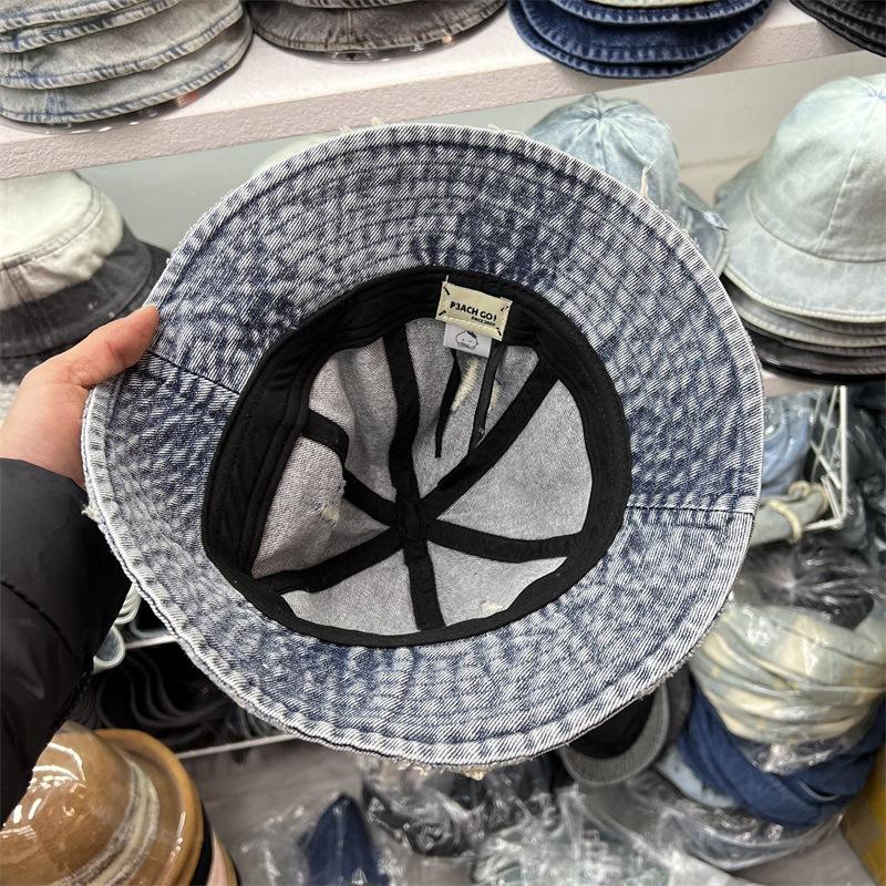 Sombrero de Pescador de Mezclilla Roto Nuevo de Primavera y Verano para Mujer, Estilo Japonés Vintage Versátil Protección Solar Sombrero para el Sol, Sombrero Pequeño Adelgazante para el Rostro