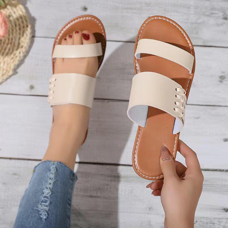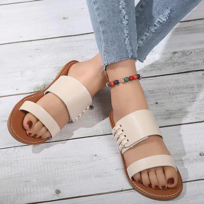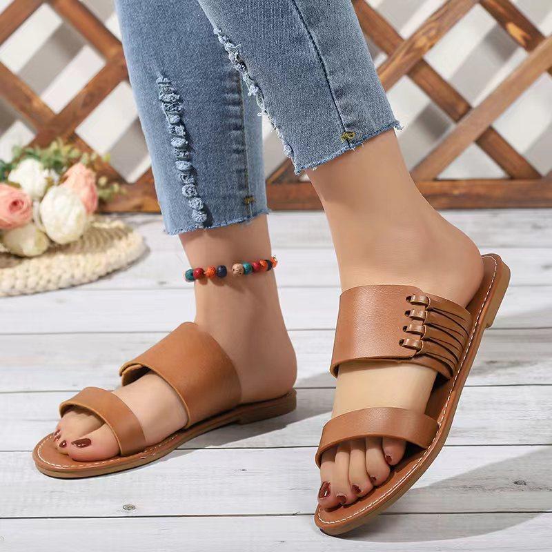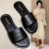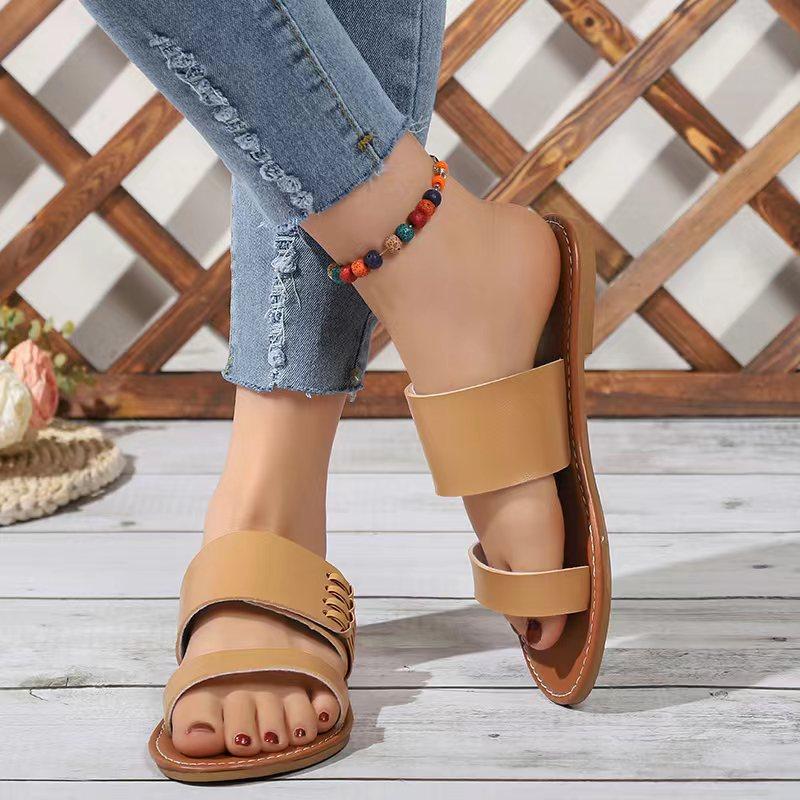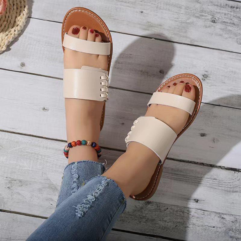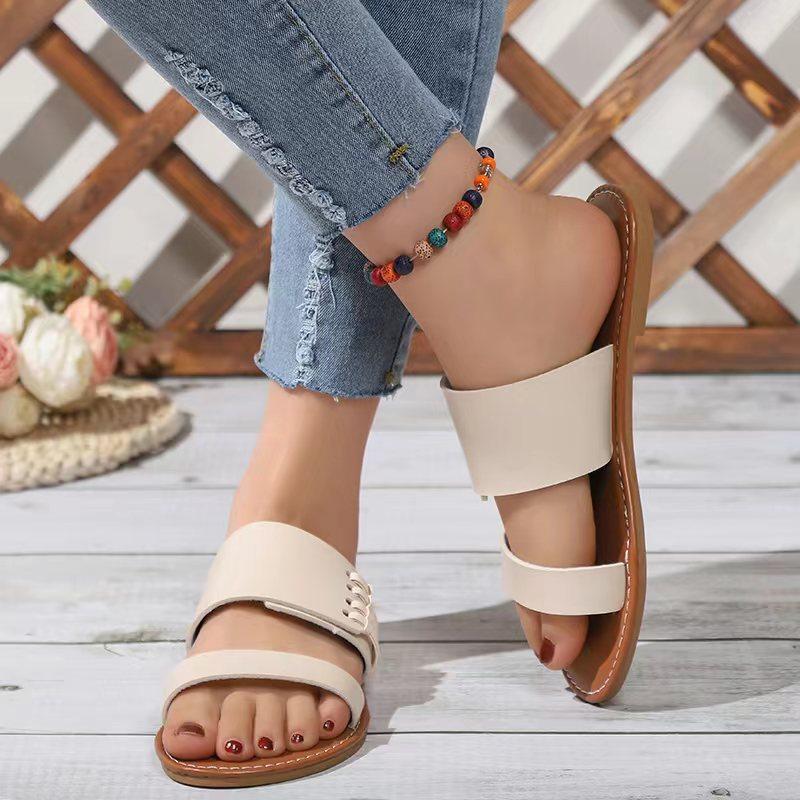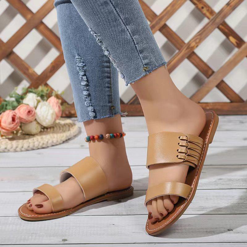 Pantuflas de Talla Grande para Mujer de Comercio Exterior 2025 Verano Europeo y Americano Nuevo Color Puro Punta Redonda Punta Uso Exterior Casual Sandalias Planas