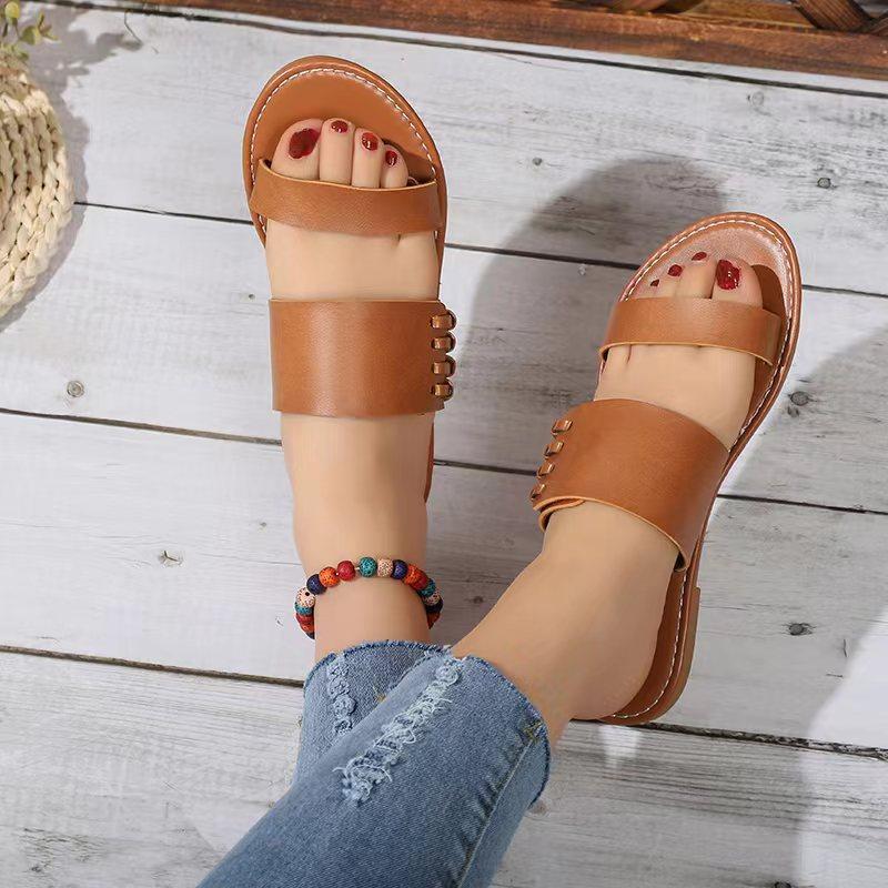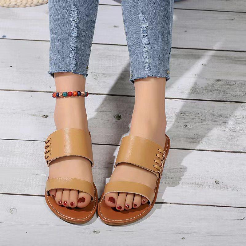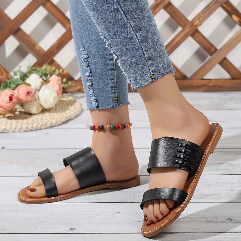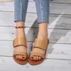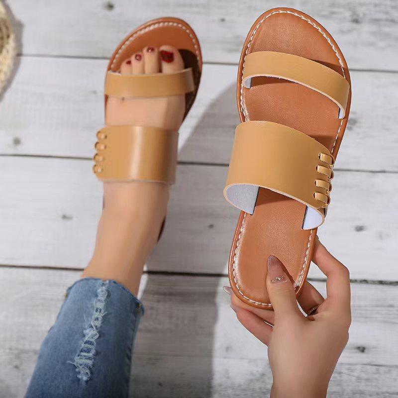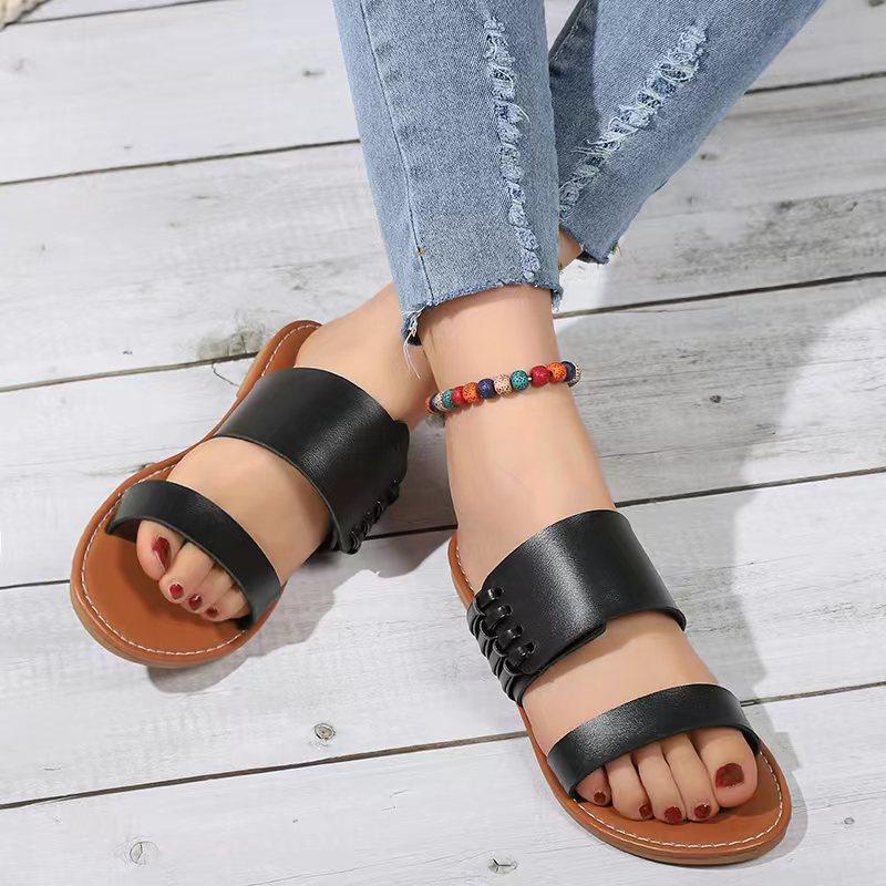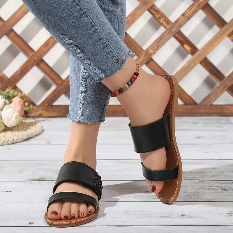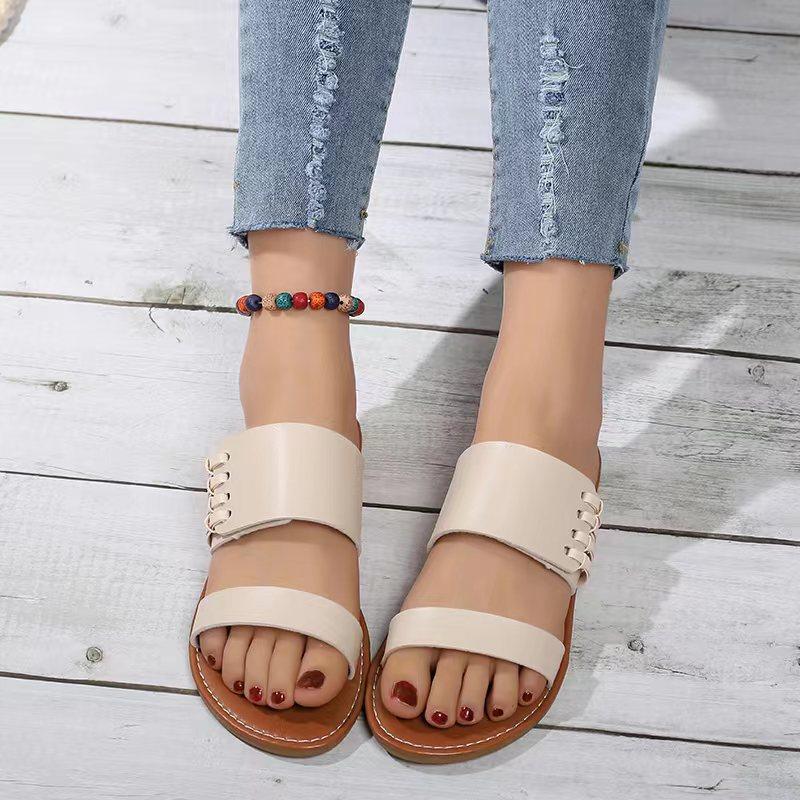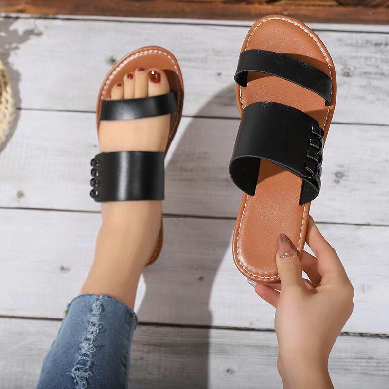 Pantuflas de Talla Grande para Mujer de Comercio Exterior 2025 Verano Europeo y Americano Nuevo Color Puro Punta Redonda Punta Uso Exterior Casual Sandalias Planas