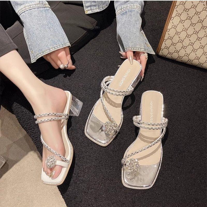 Sandalias de Tanga con Pedrería Dos Usos Sandalias de Playa Zapatillas de Tacón Grueso Francés Ropa Exterior para Mujer Otoño 2025 Nuevo Huevo de Paloma