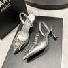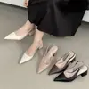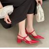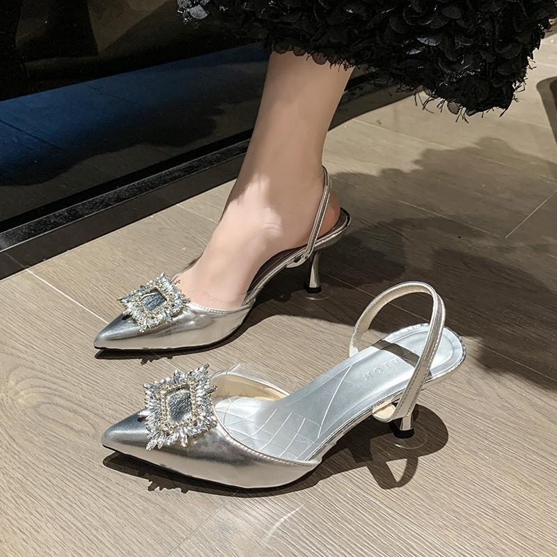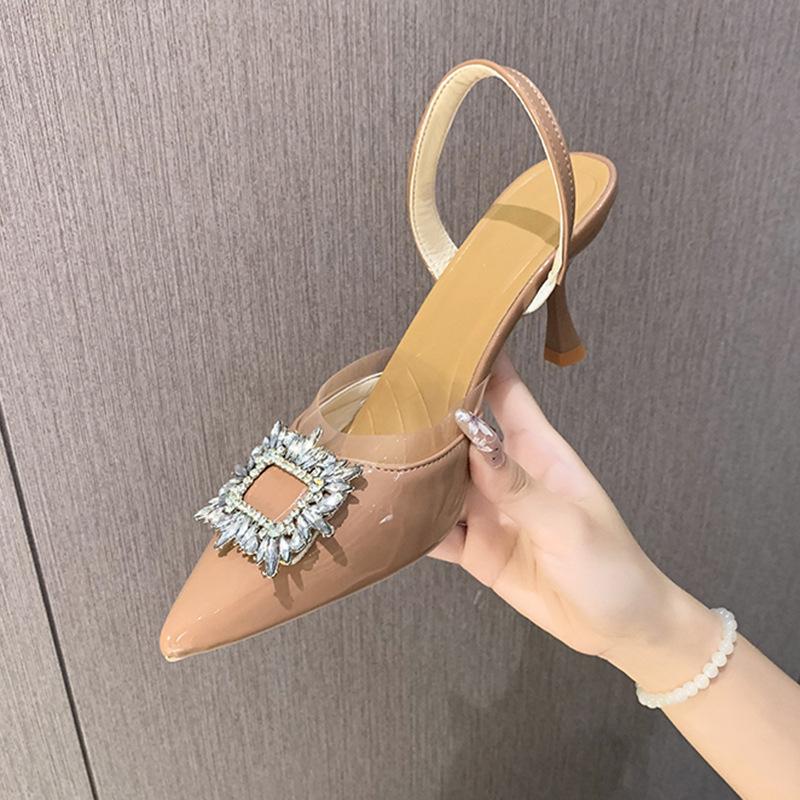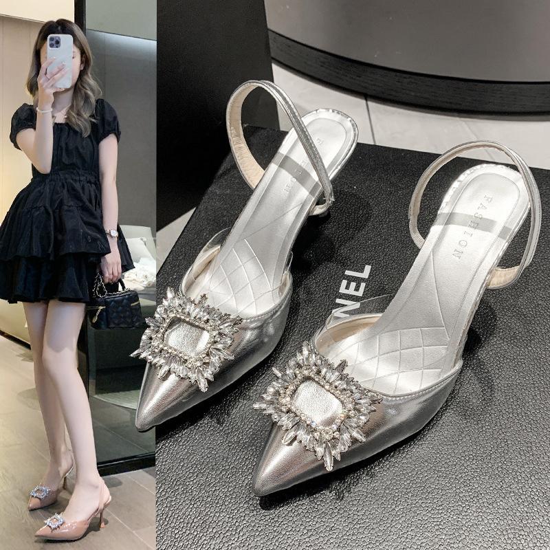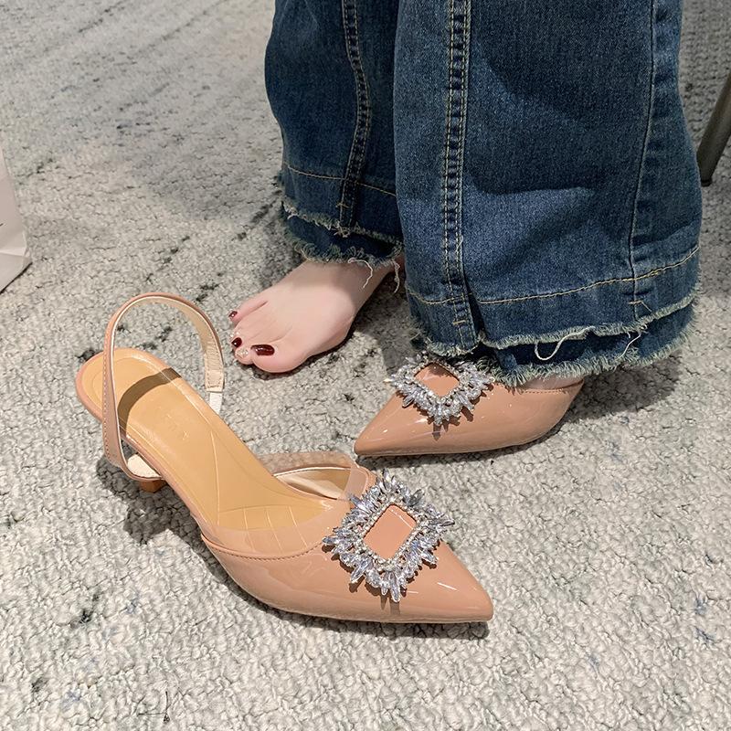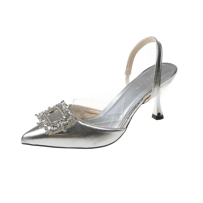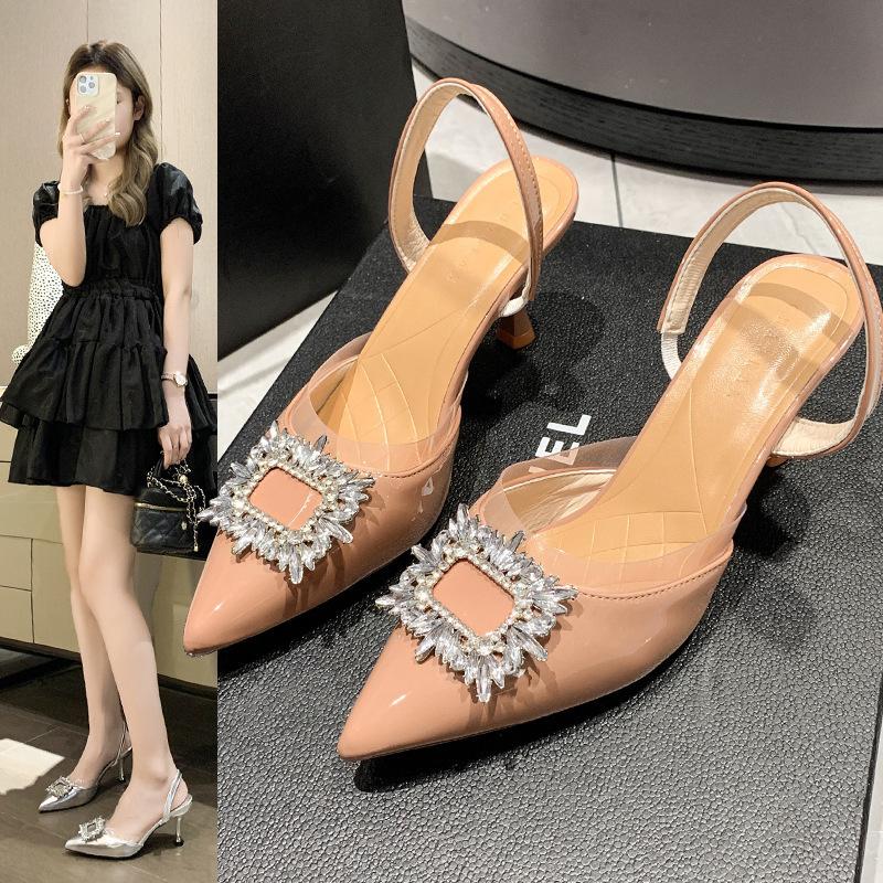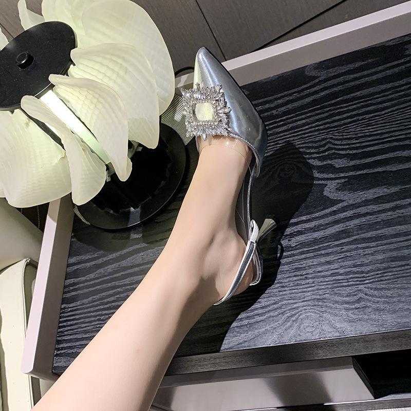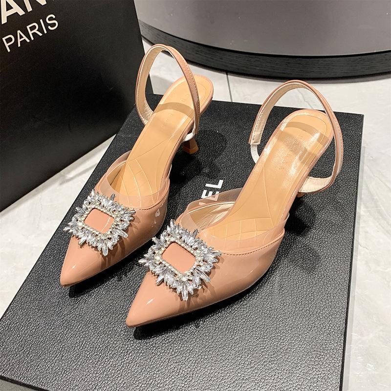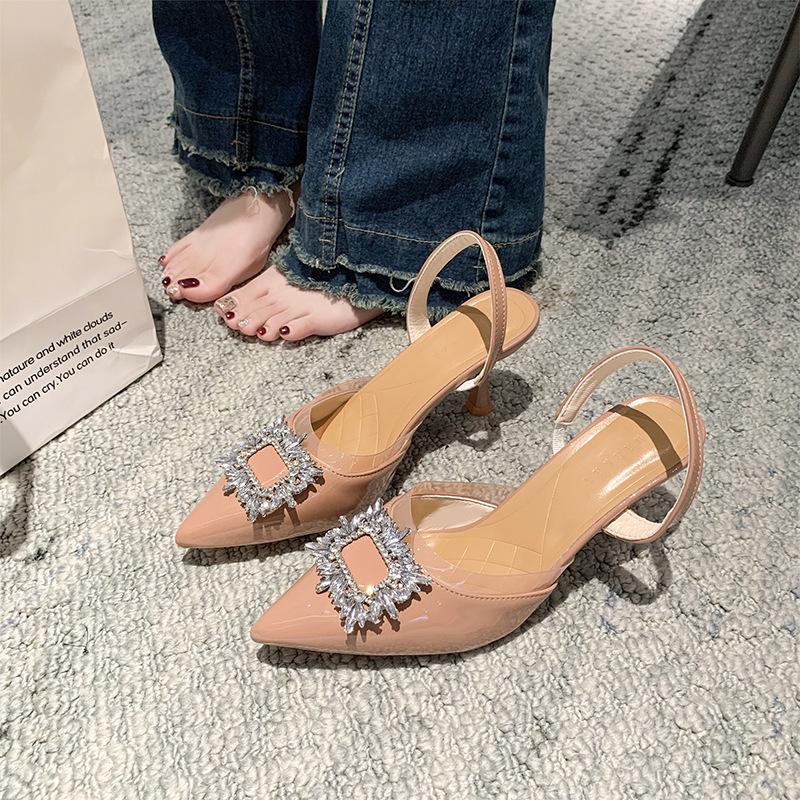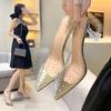 Primavera 2025 nueva moda tacón medio descubierto tacón delgado tacón alto pegamento de vidrio transparente zapatos de tacón para mujer sandalias puntiagudas de pedrería