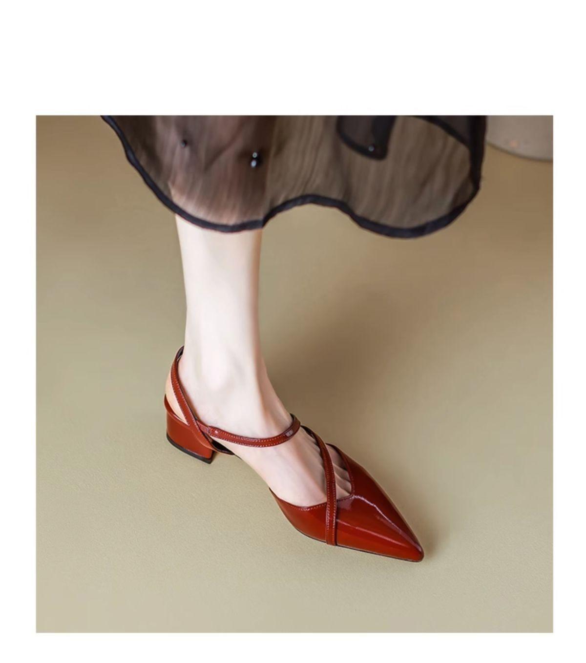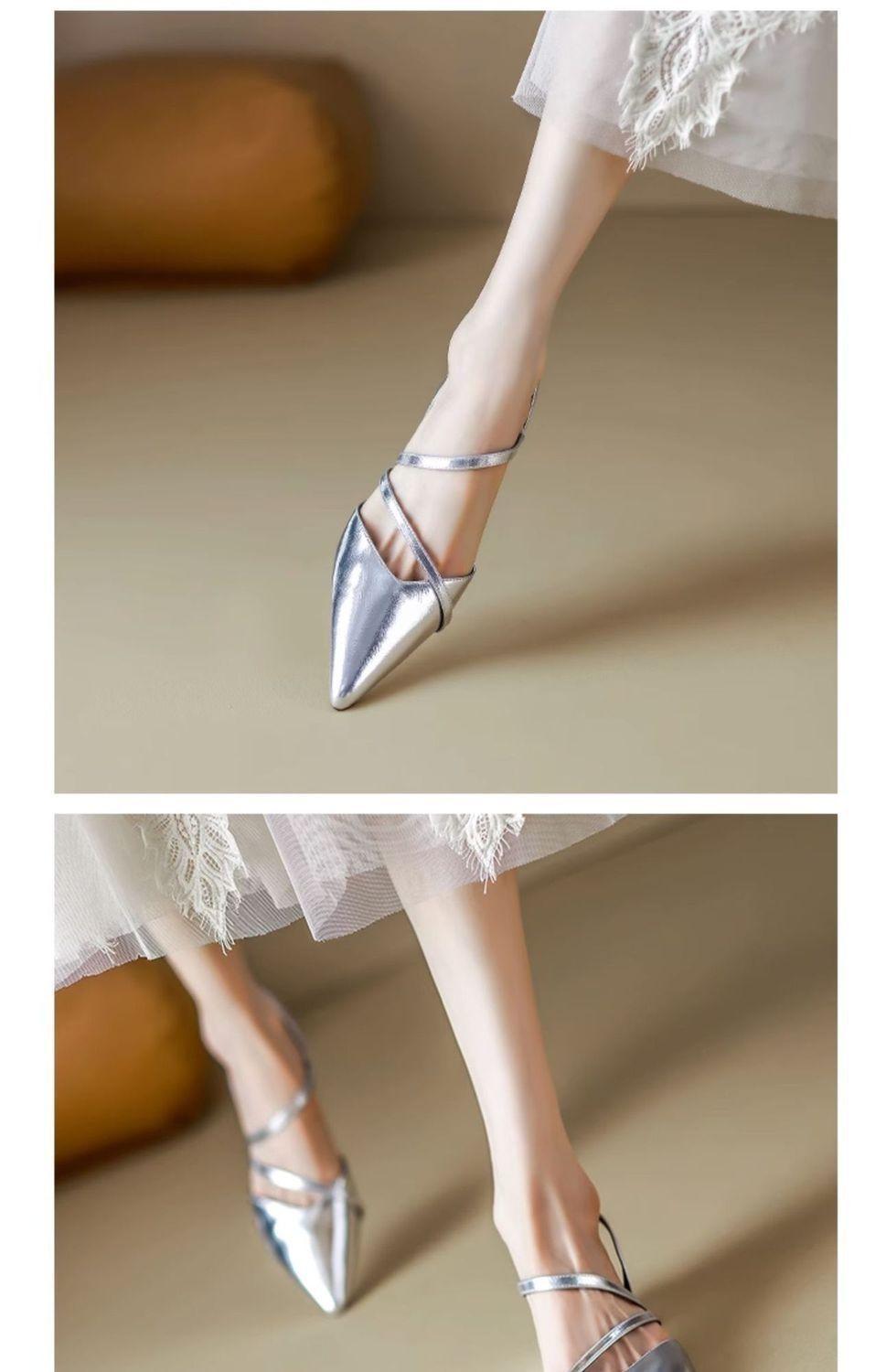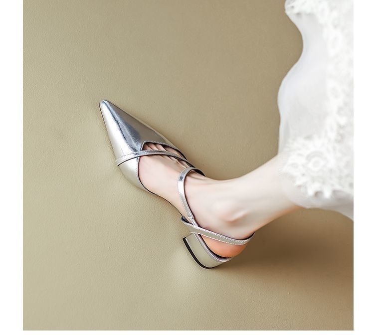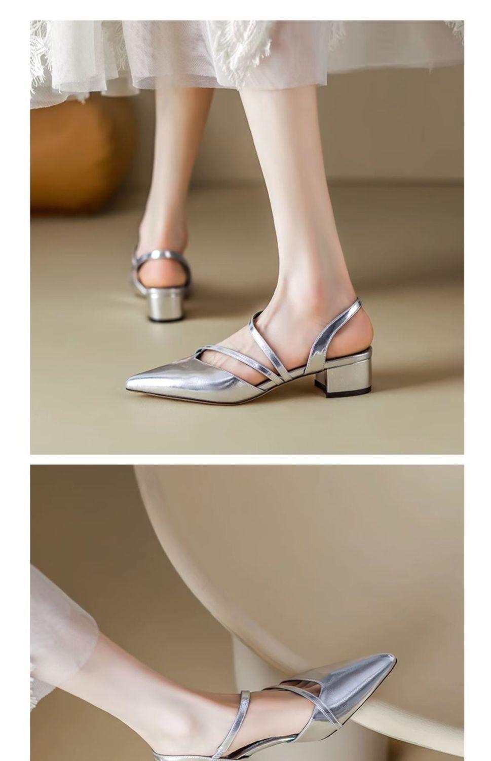 Sandalias plateadas de tacón medio estilo francés con punta hueca 2025 Nuevo retro versátil de punta cerrada tacón grueso bajo espalda abierta zapatos de verano