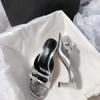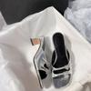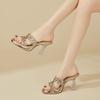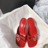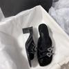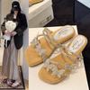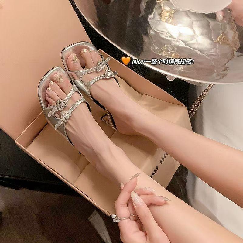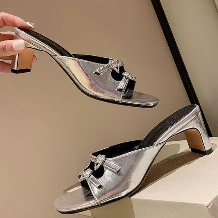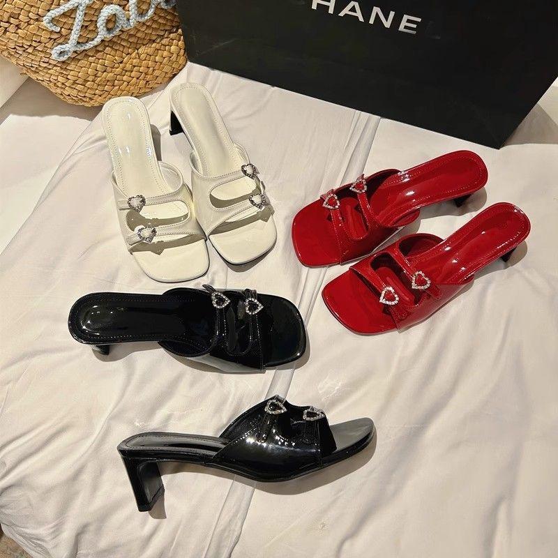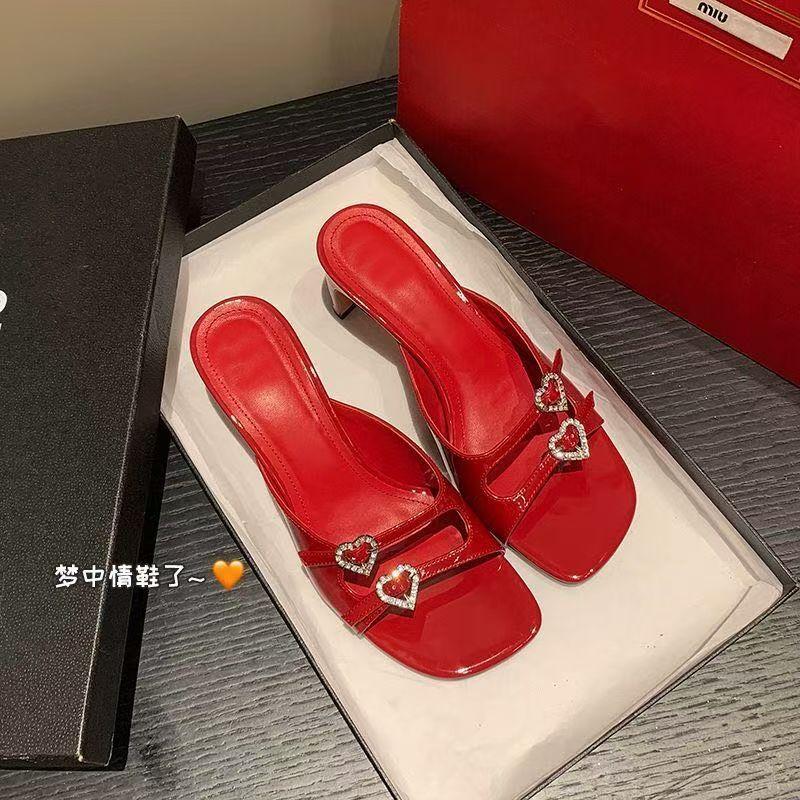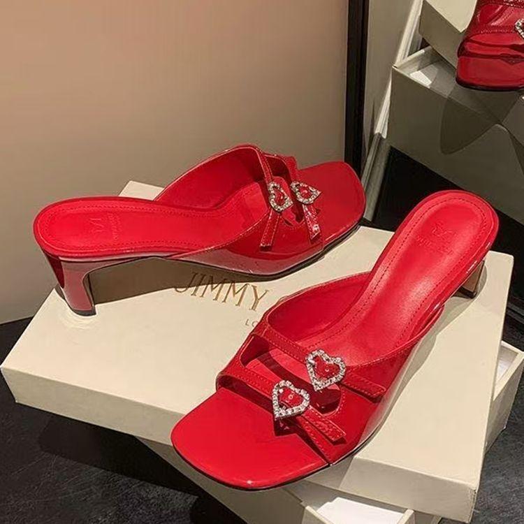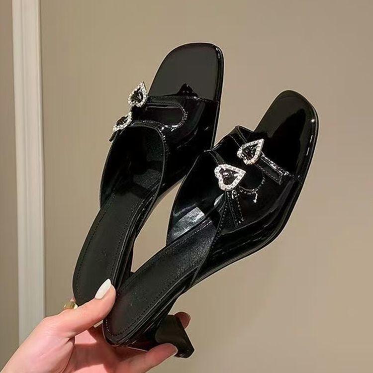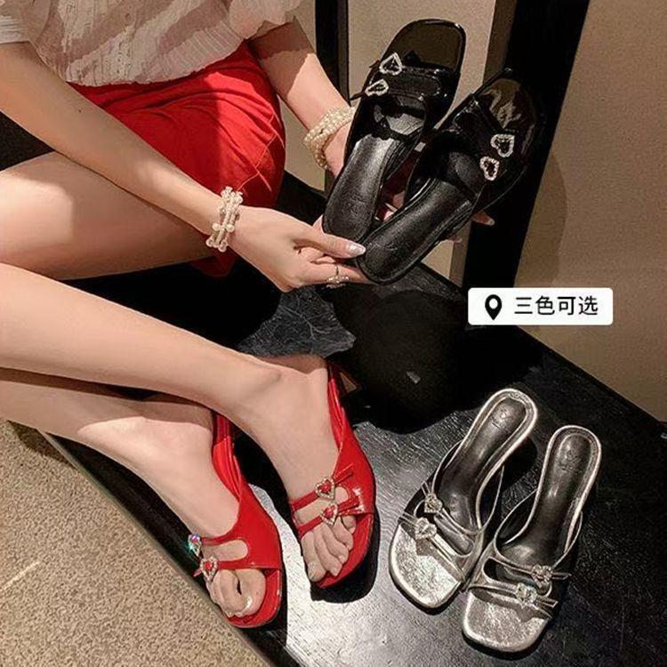 Pantuflas de Punta Cuadrada con Pedrería Love Estilo Hada Femenino Punta Abierta Tacones Altos Elegantes Sandalias Francesas para Mujer Verano 2025