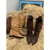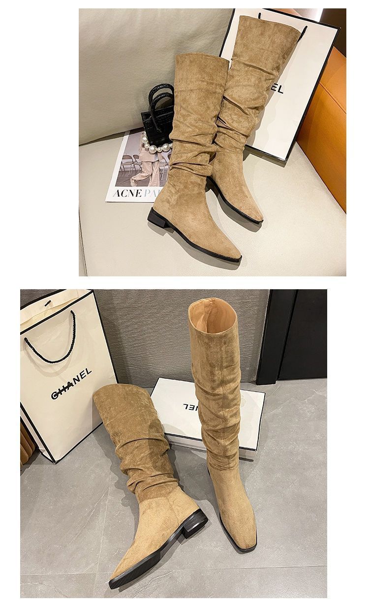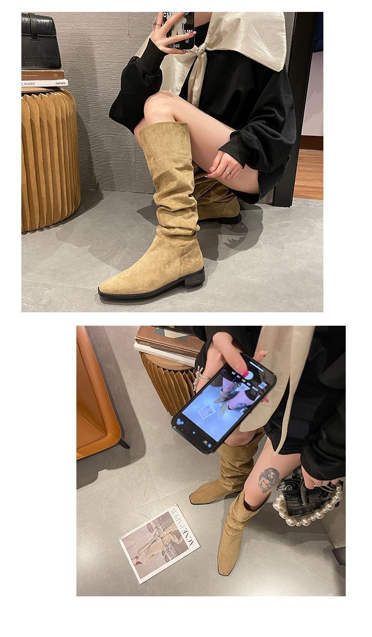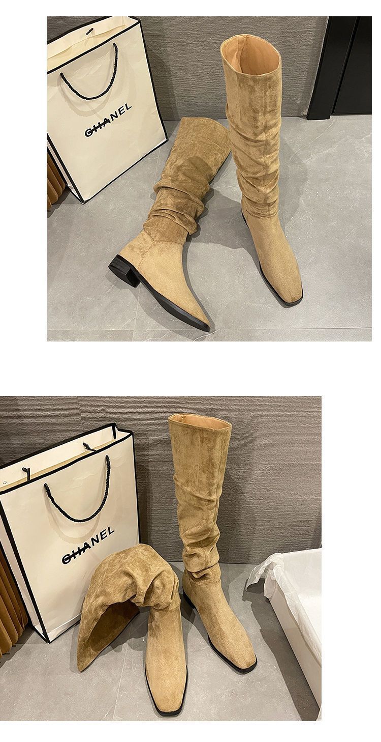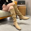 Botas Apiladas Botas de Caballero Femeninas Retro Gamuza Tacón Grueso Punta Afilada Verano 2025 Nuevo Marrón Plisado Botas Altas Otoño