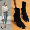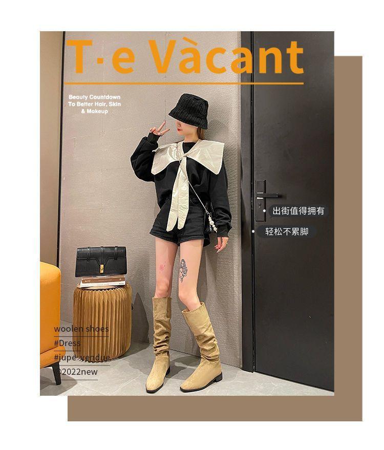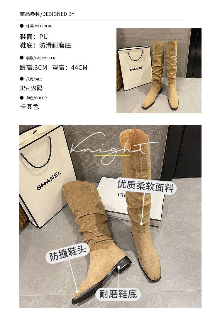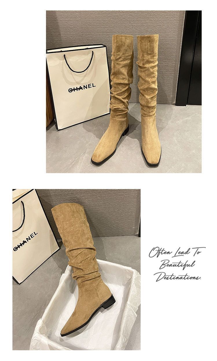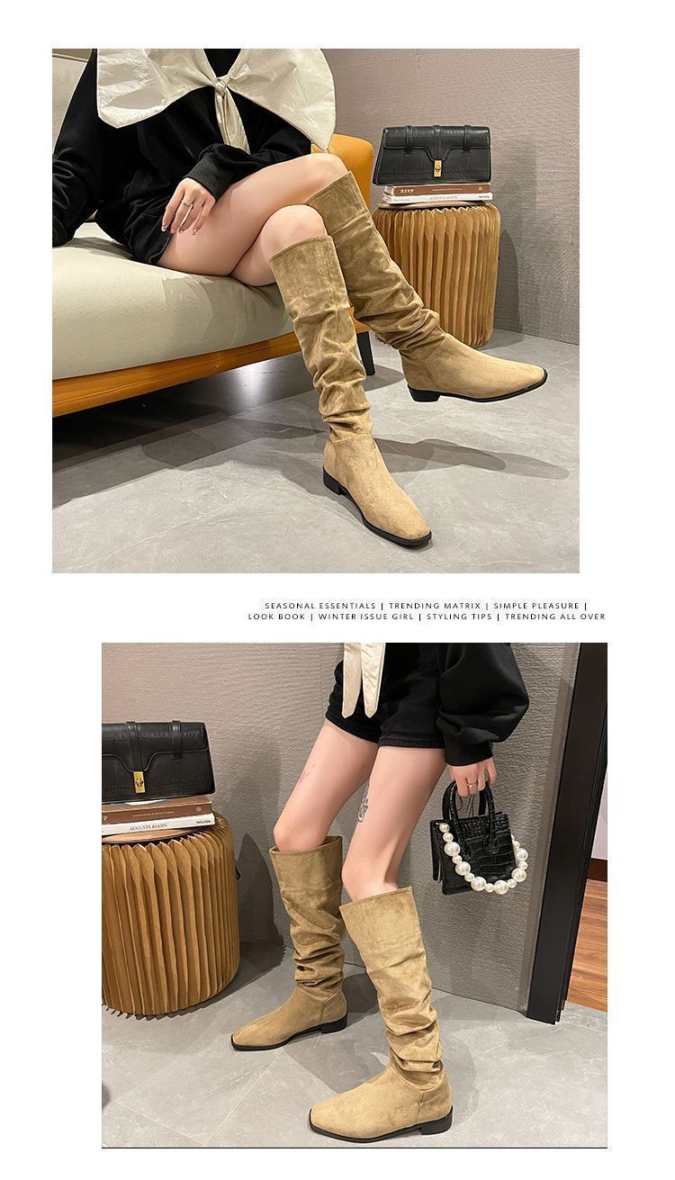 Botas Apiladas Botas de Caballero Femeninas Retro Gamuza Tacón Grueso Punta Afilada Verano 2025 Nuevo Marrón Plisado Botas Altas Otoño