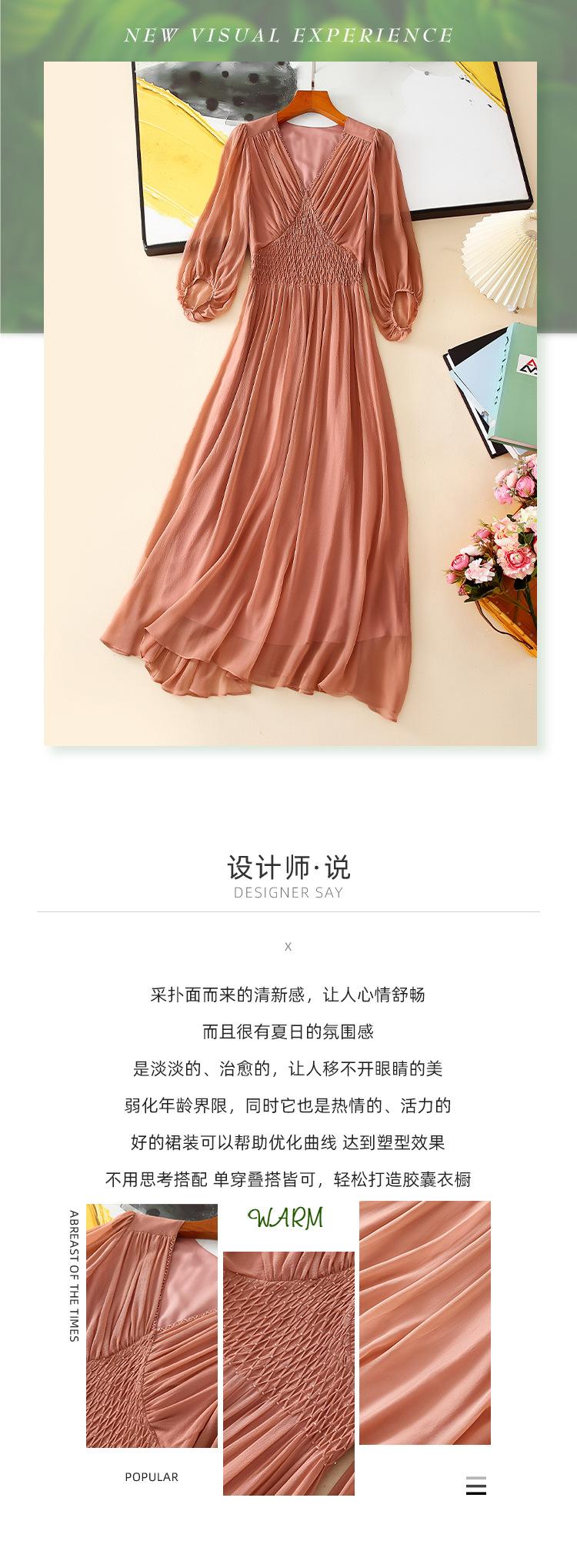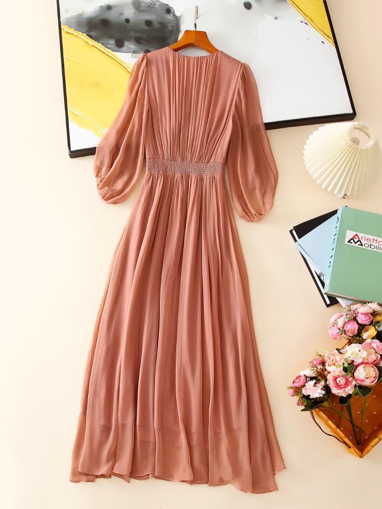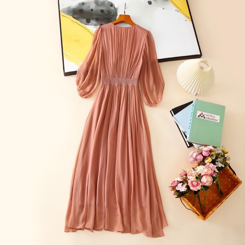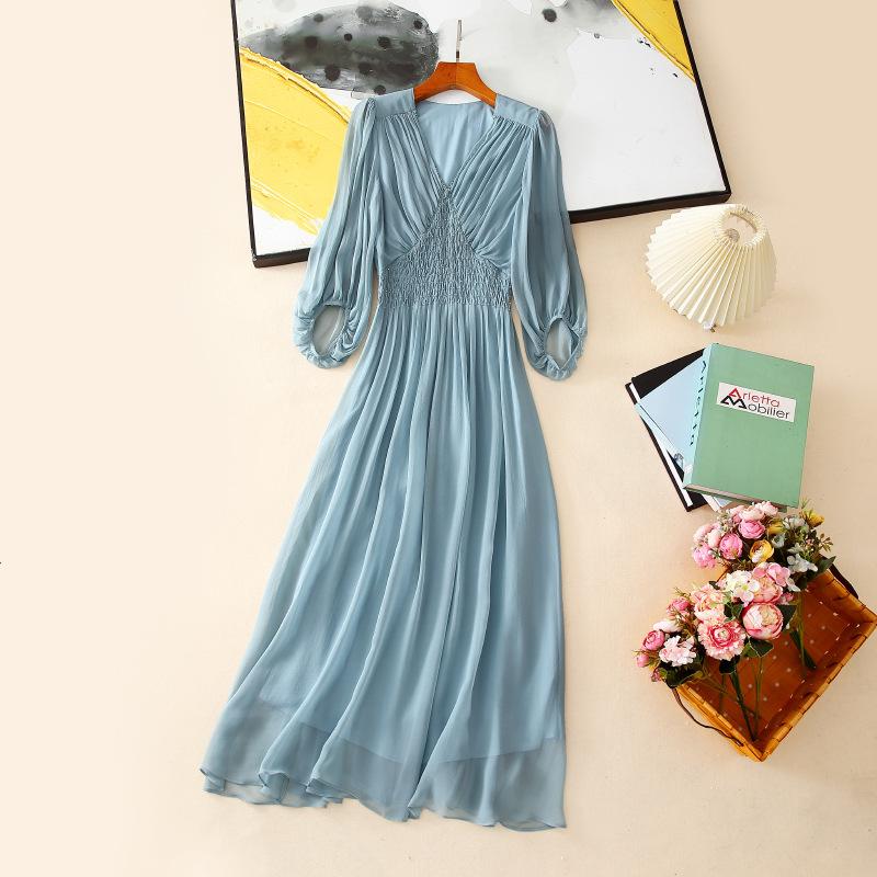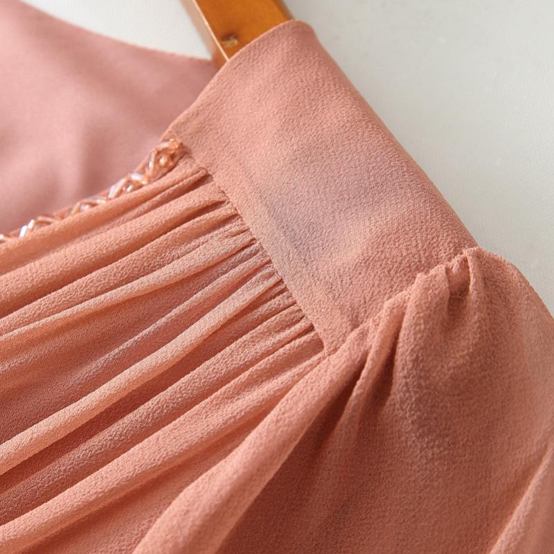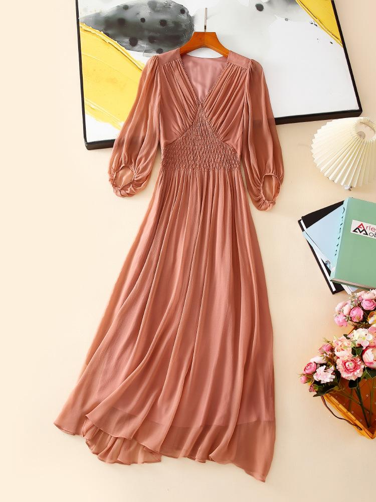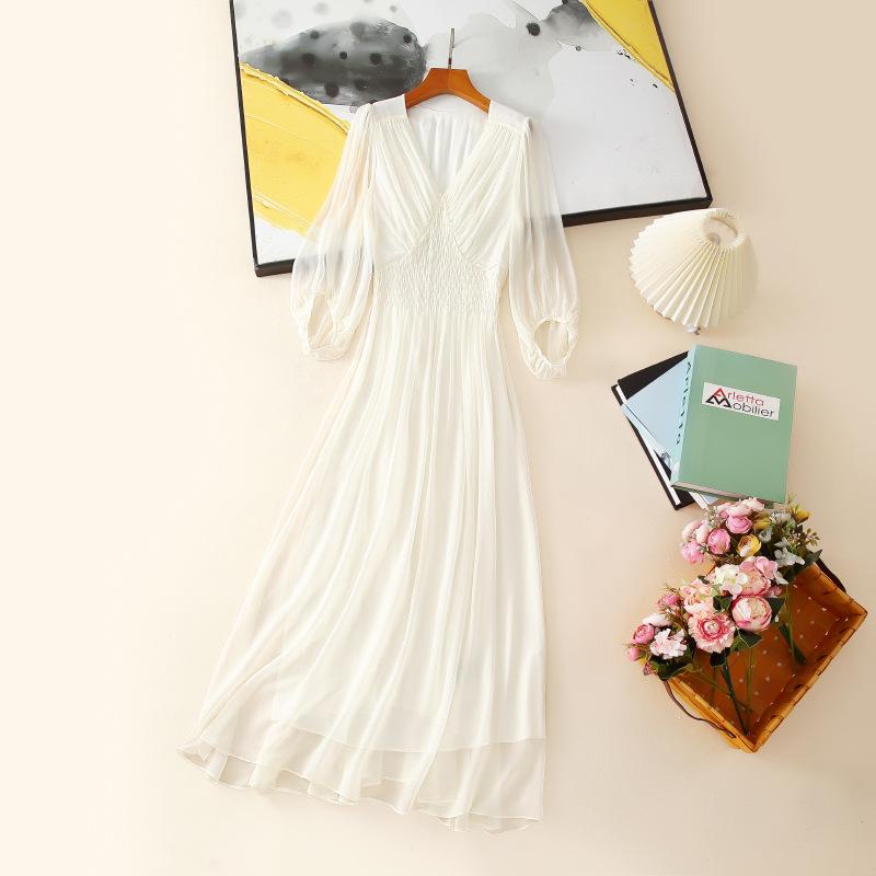 2025 Nuevo Estilo de Verano Seda Moda Elegante Look Adelgazante Versátil Cuello en V con Cuentas Plisado Look Adelgazante Vestido de Seda de Morera