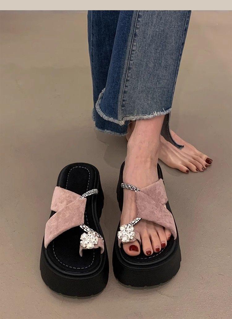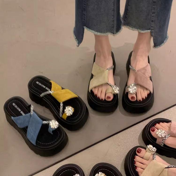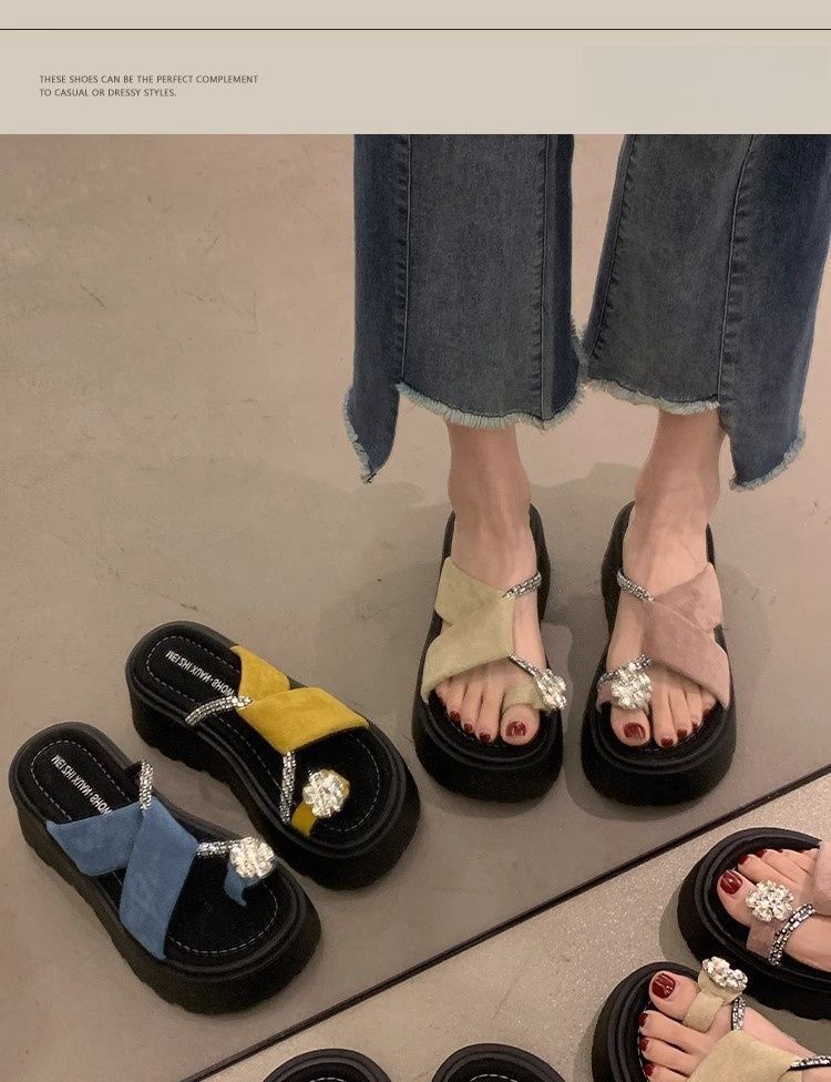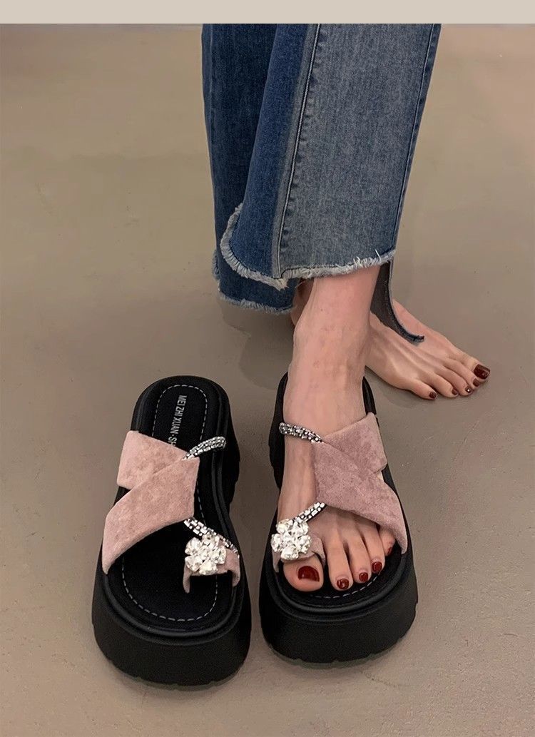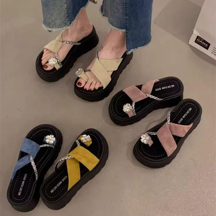 Pantuflas de punta con pedrería y suela gruesa para mujer, verano 2025, nueva altura, combinan con todo, sandalias para dama al por mayor