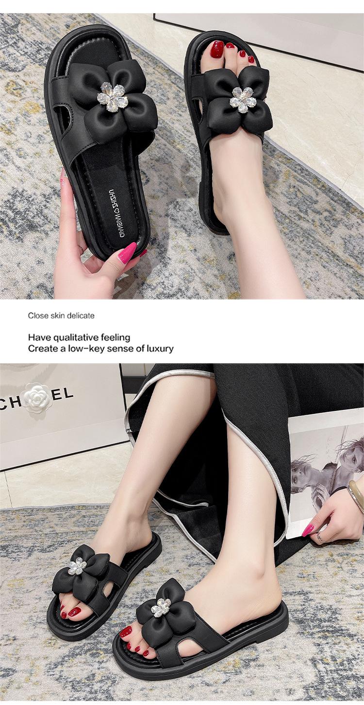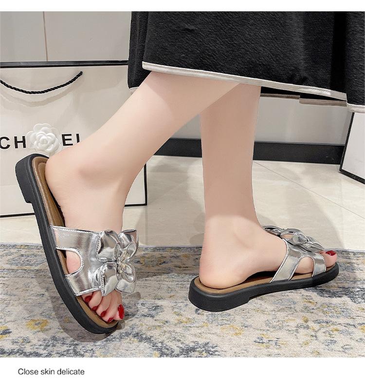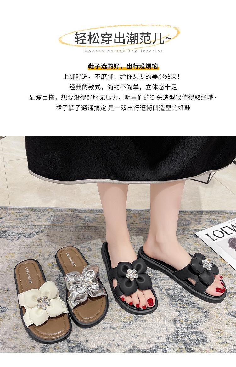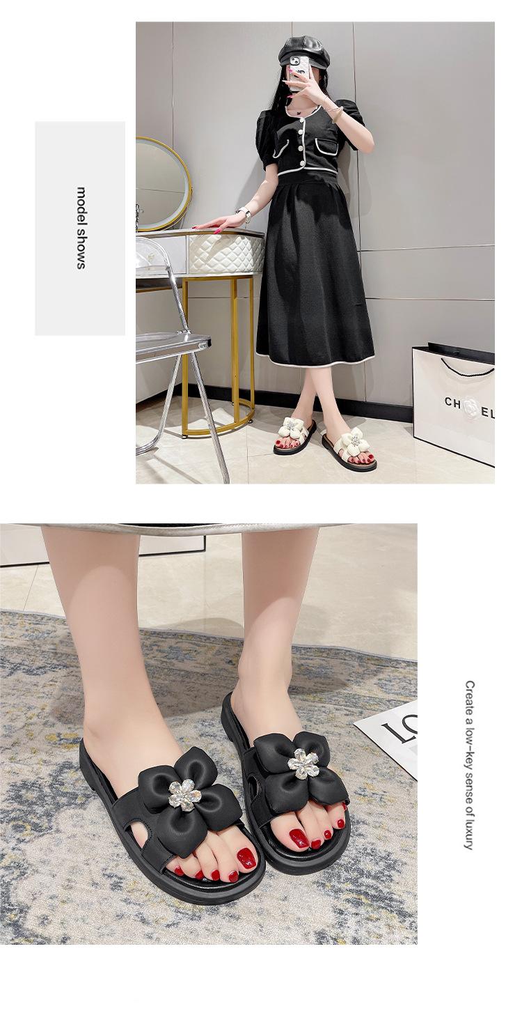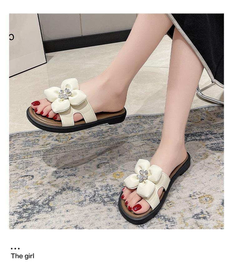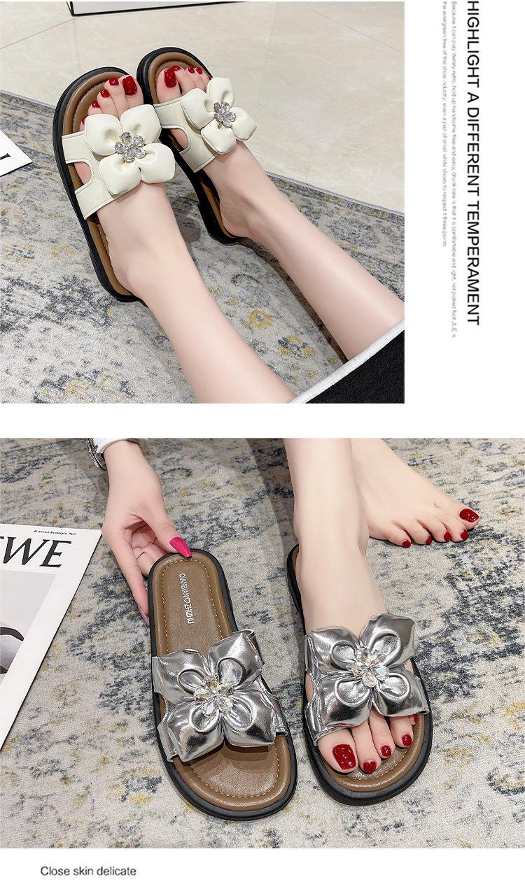 Sandalias planas francesas para mujer Verano 2025 Nuevo Exterior Moda Flores de pedrería con falda Pantuflas dulces