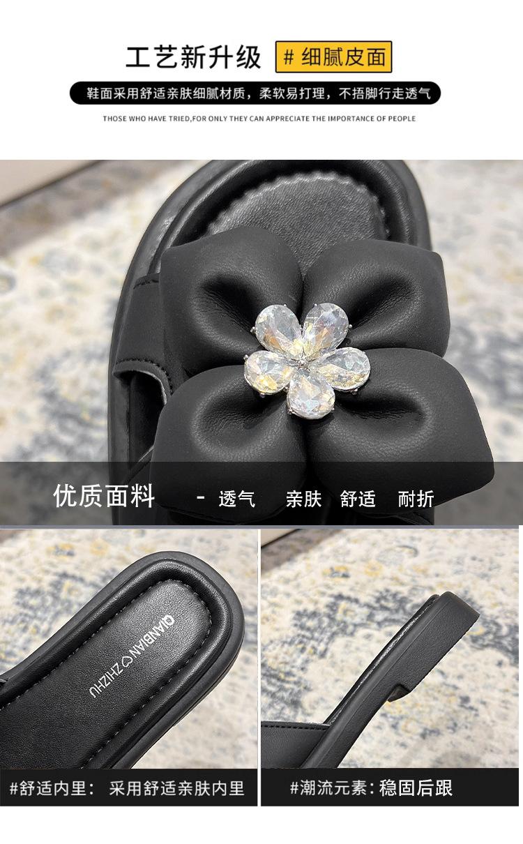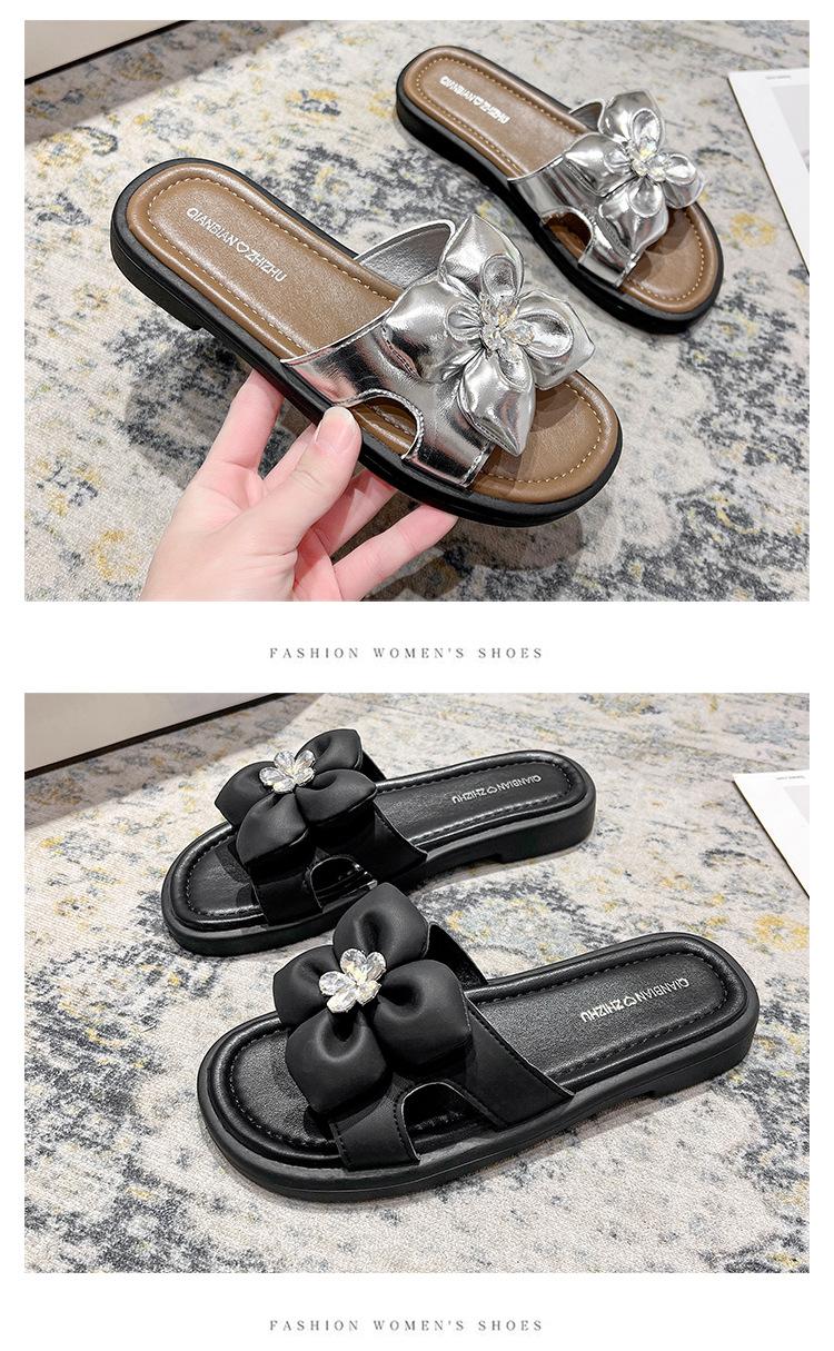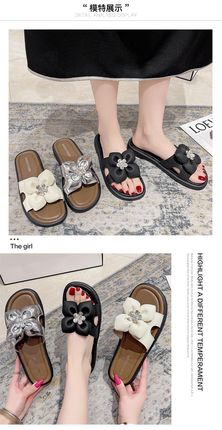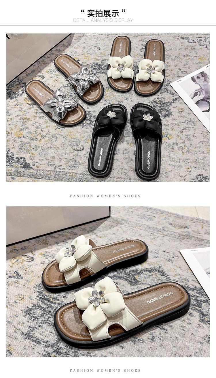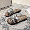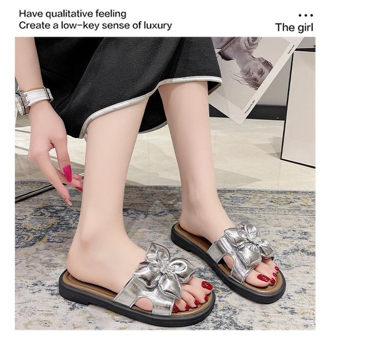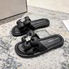 Sandalias planas francesas para mujer Verano 2025 Nuevo Exterior Moda Flores de pedrería con falda Pantuflas dulces