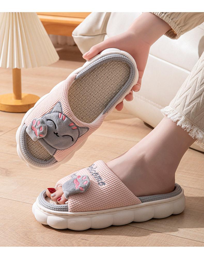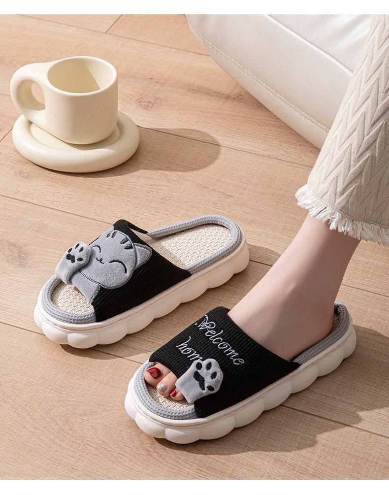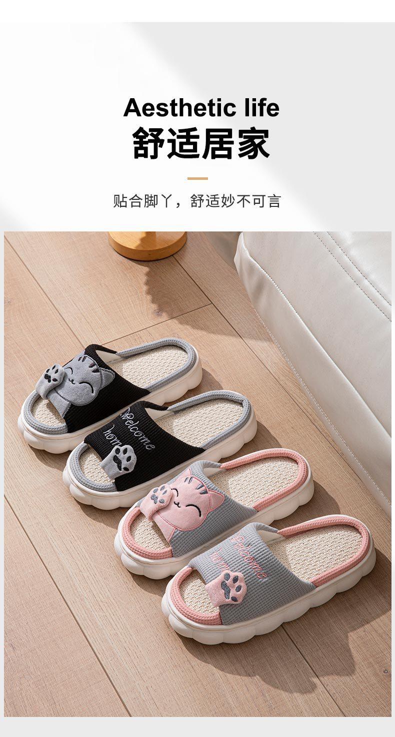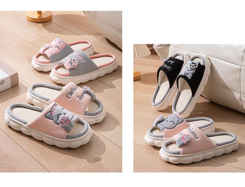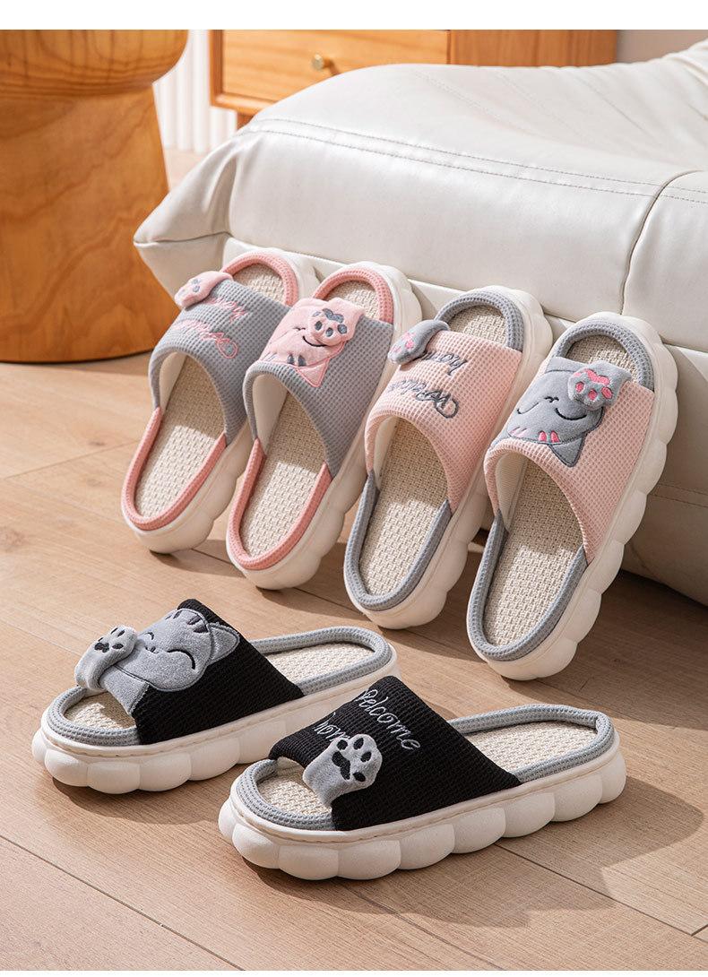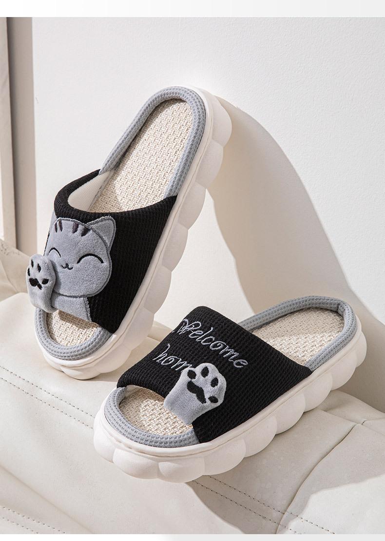 Pantuflas de Lino para Mujer para las Cuatro Estaciones para el Hogar Antideslizantes Gato de Dibujos Animados Ropa de Exterior Nuevas Suela Suave Transpirables de Pareja Pantuflas Gruesas para Hombre