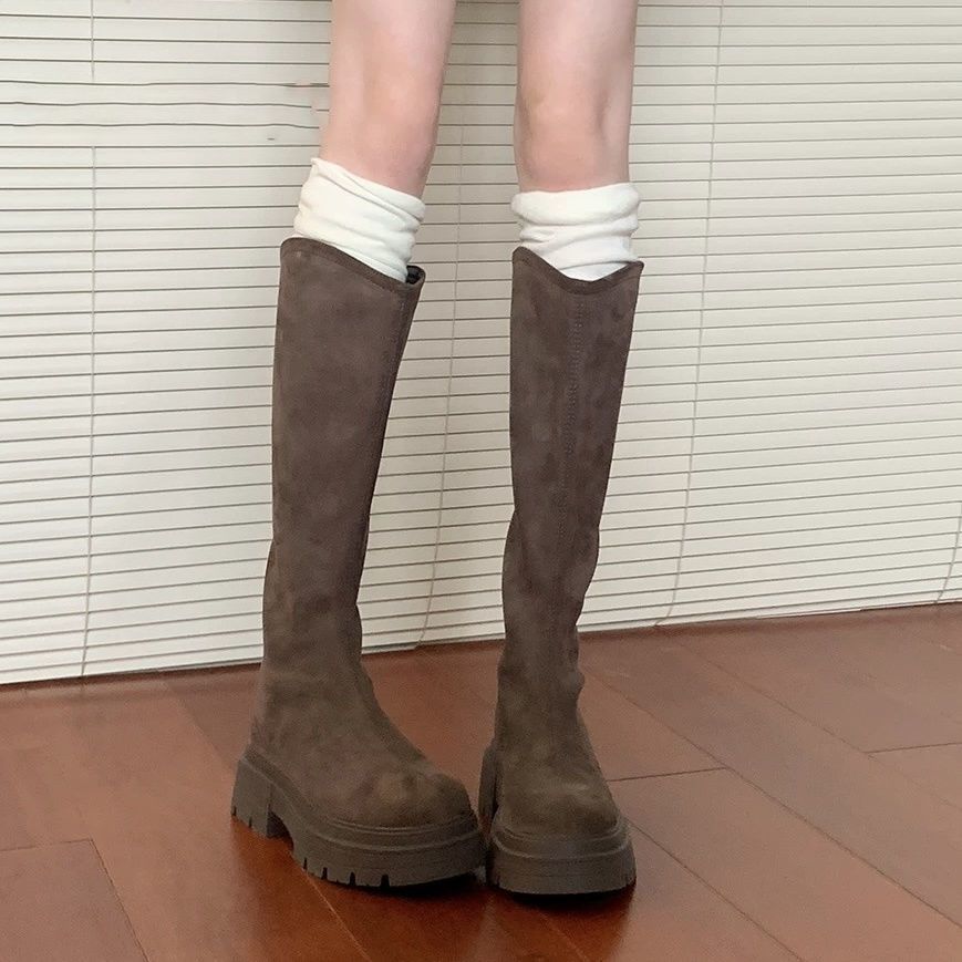 Botas Marrones de Fondo Grueso y Punta Redonda para Mujer Botas Largas Botas de Ante Botas Largas para Mujer Botas Altas Caballero Combinan con Todo Otoño e Invierno 2024 Nuevo