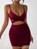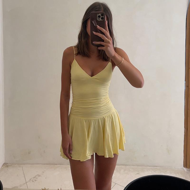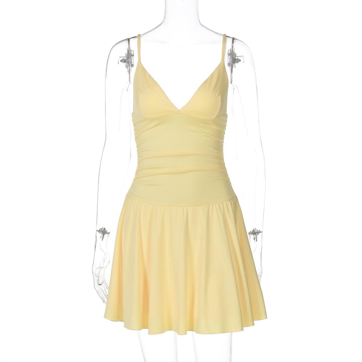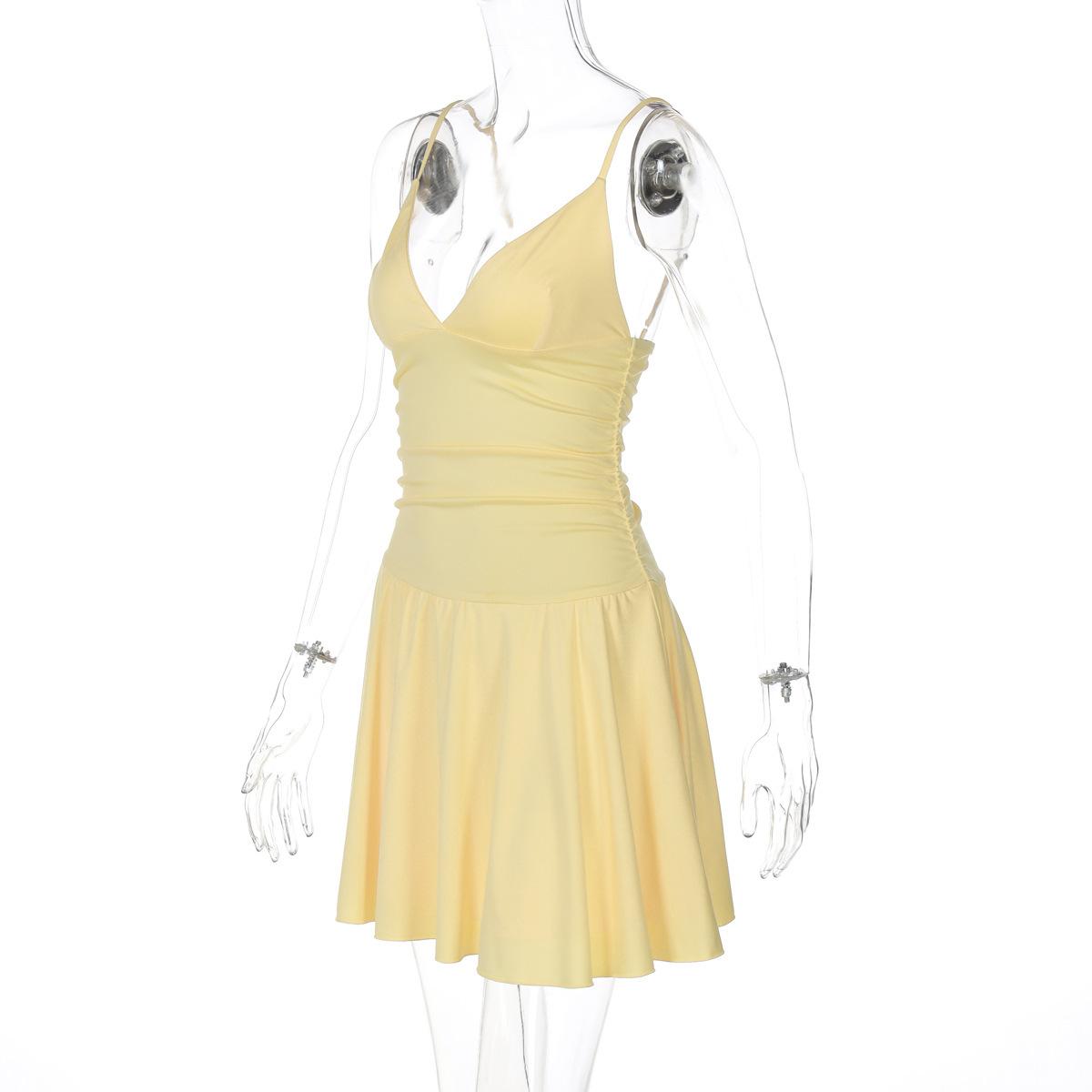 Europeo y Americano Transfronterizo 2025 Verano Nuevo Sexy Cuello en V Color Puro Estilo Fresco Slim Corto Vestido de Tirantes Princesa