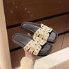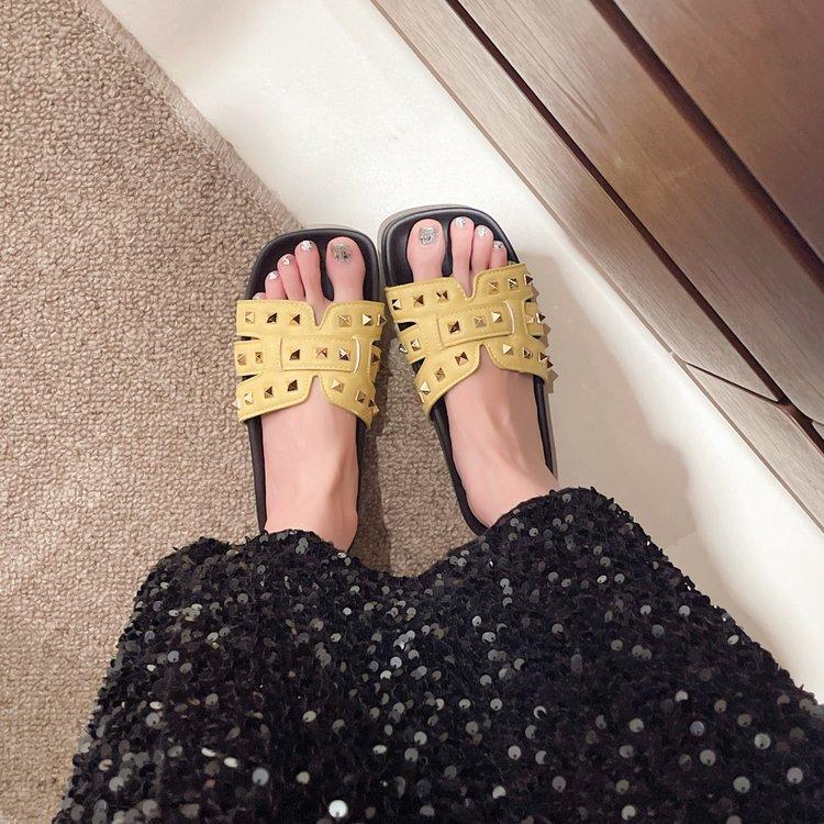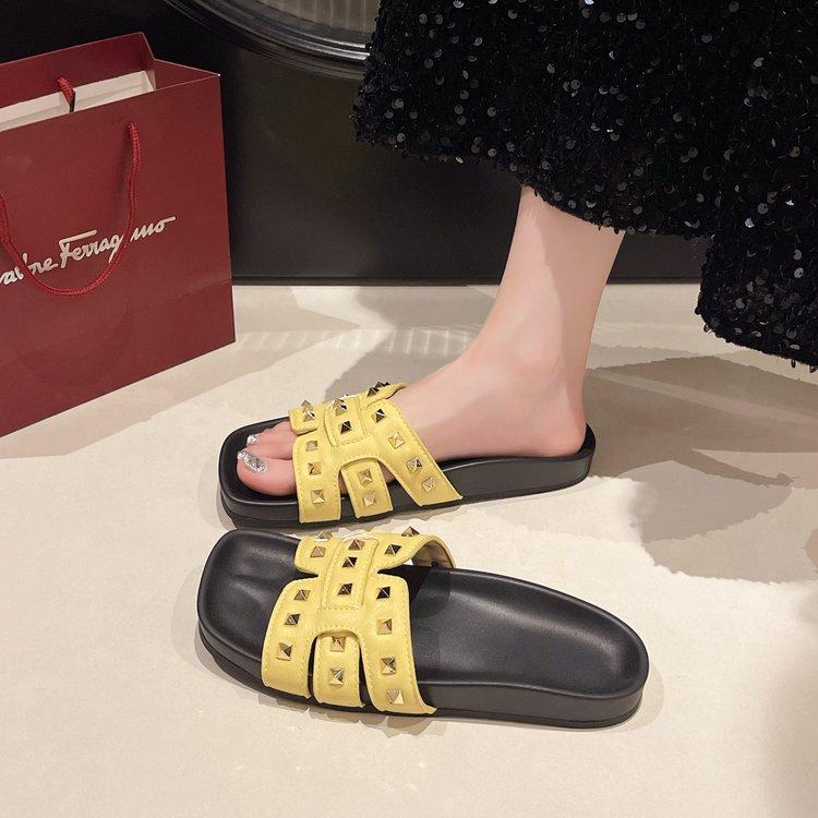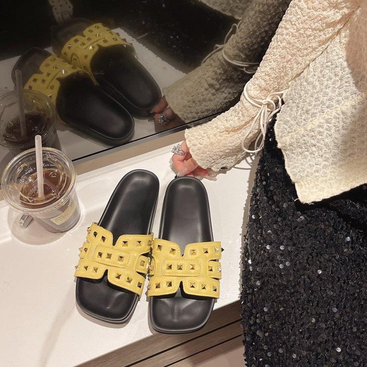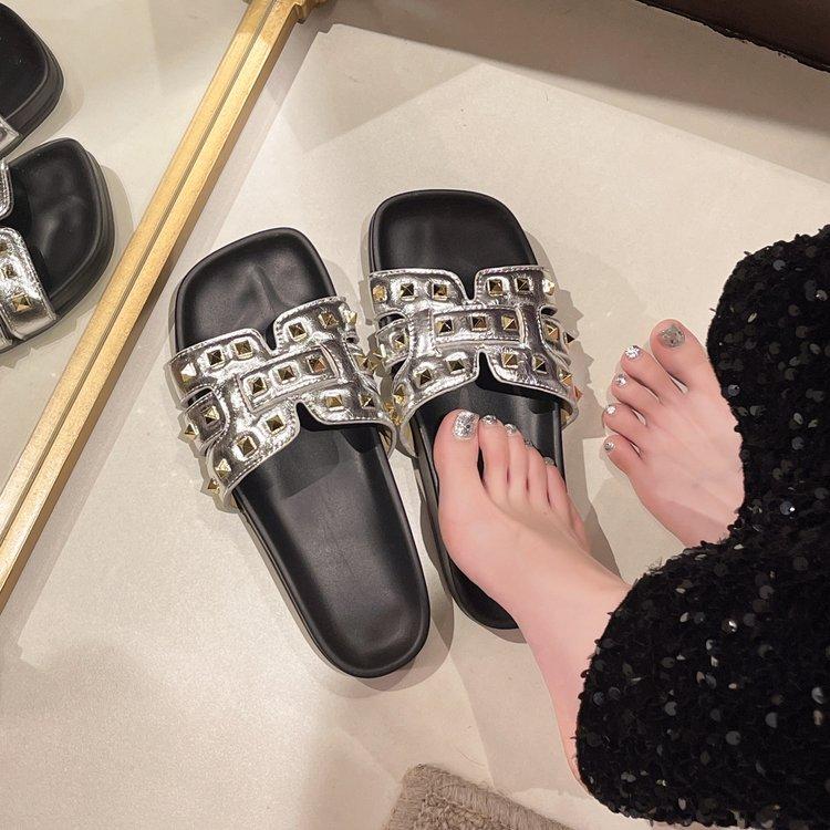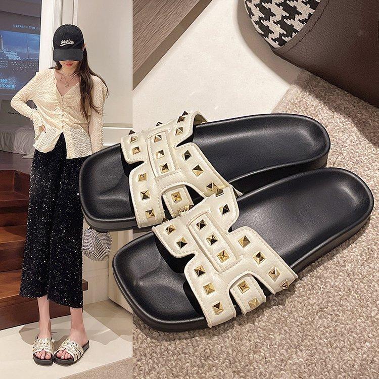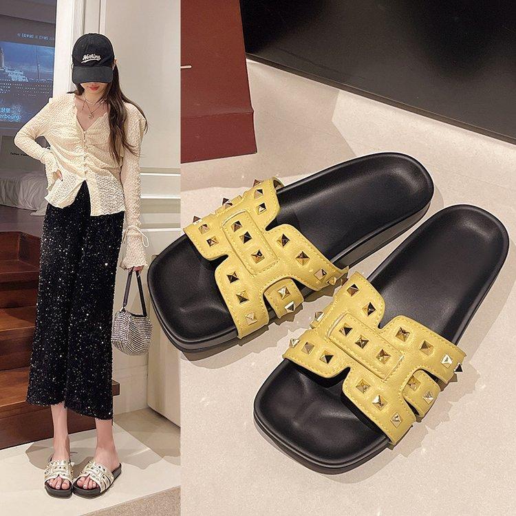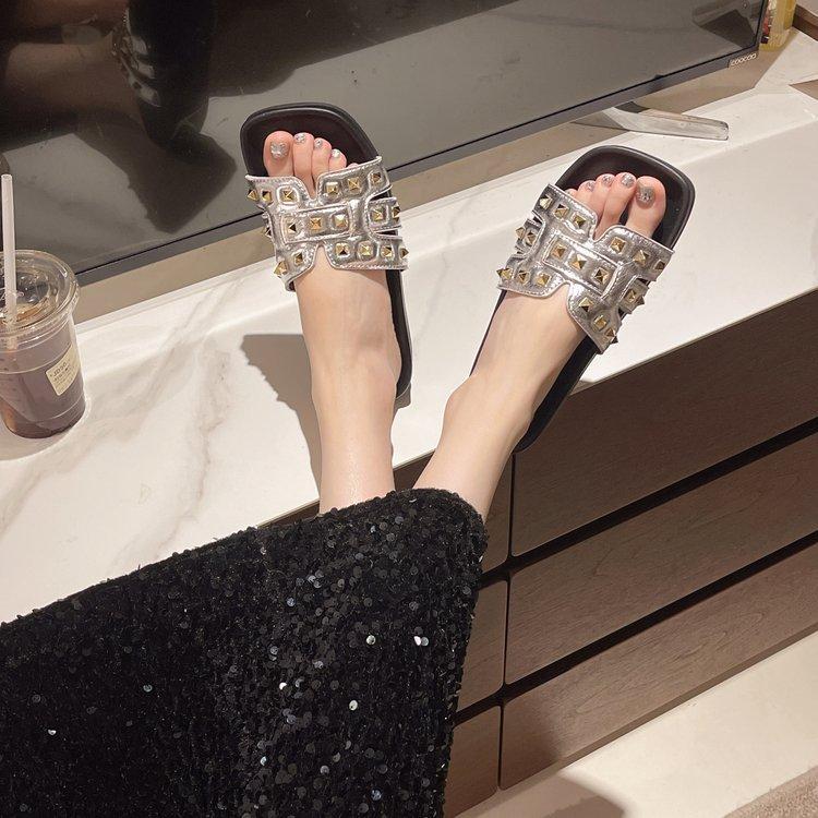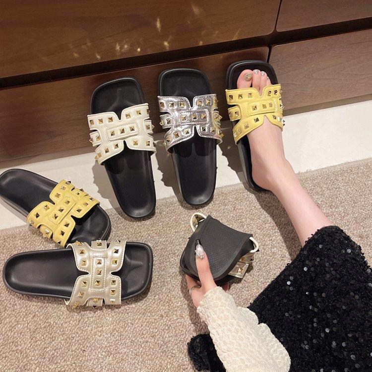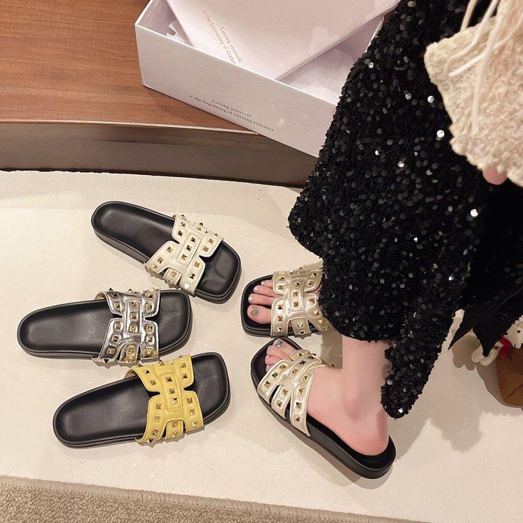 Pantuflas planas para mujer 2025 Verano Nuevo estilo Remache Ropa exterior Popular Vacaciones en la playa junto al mar Pantuflas para mujer
