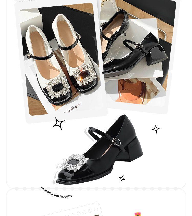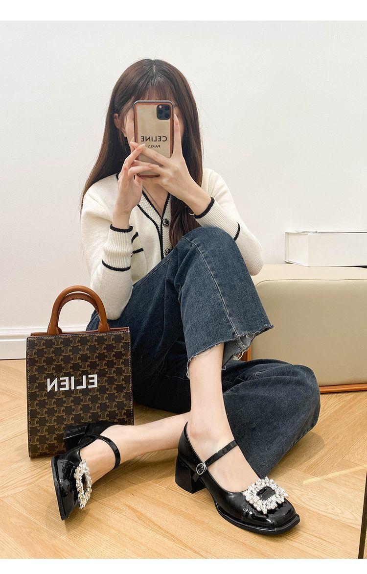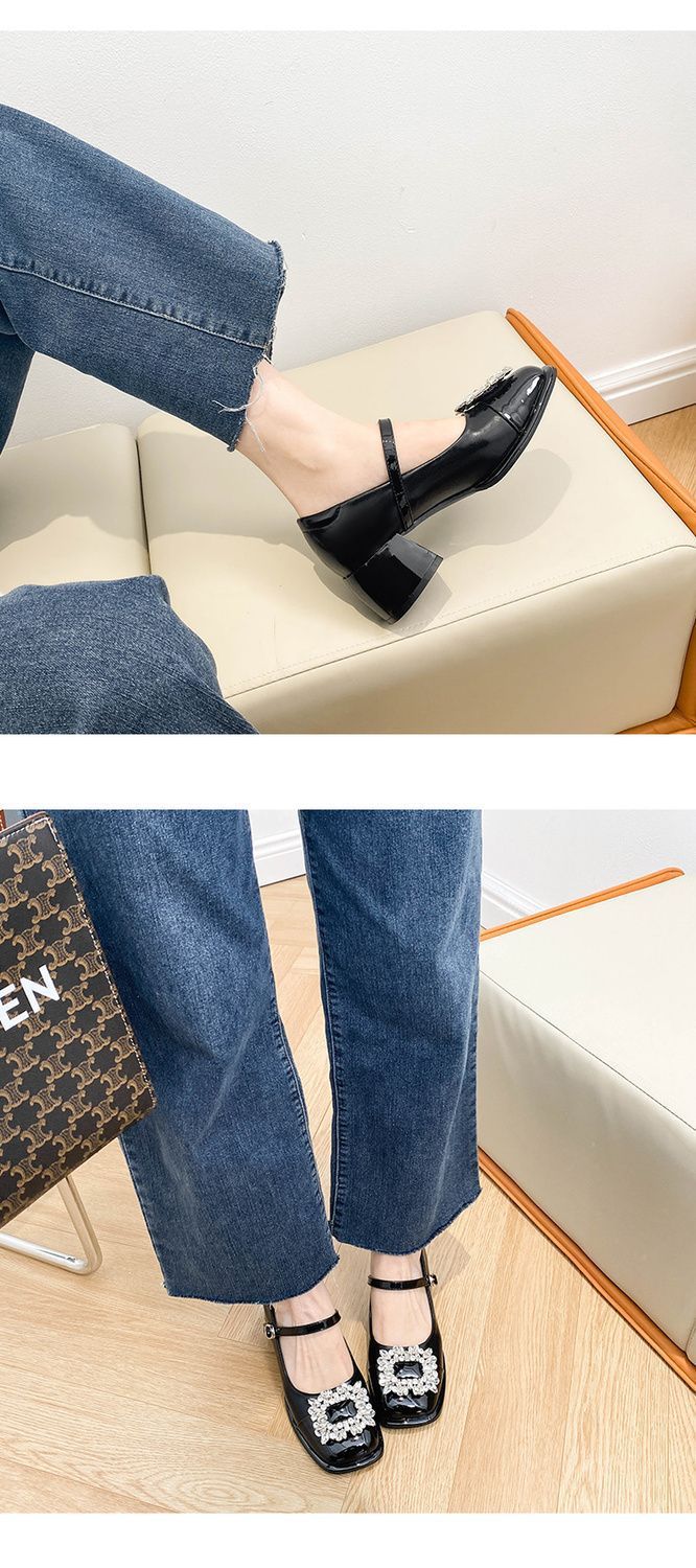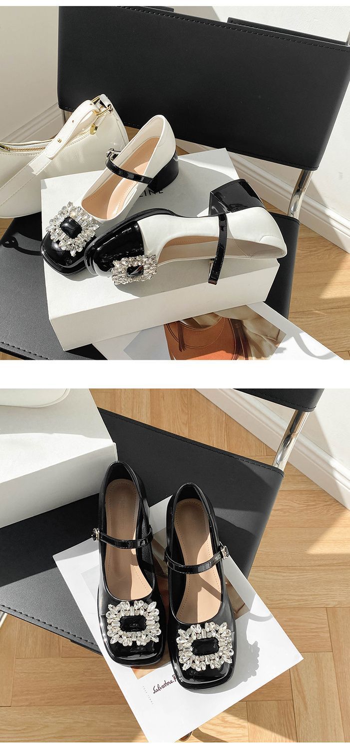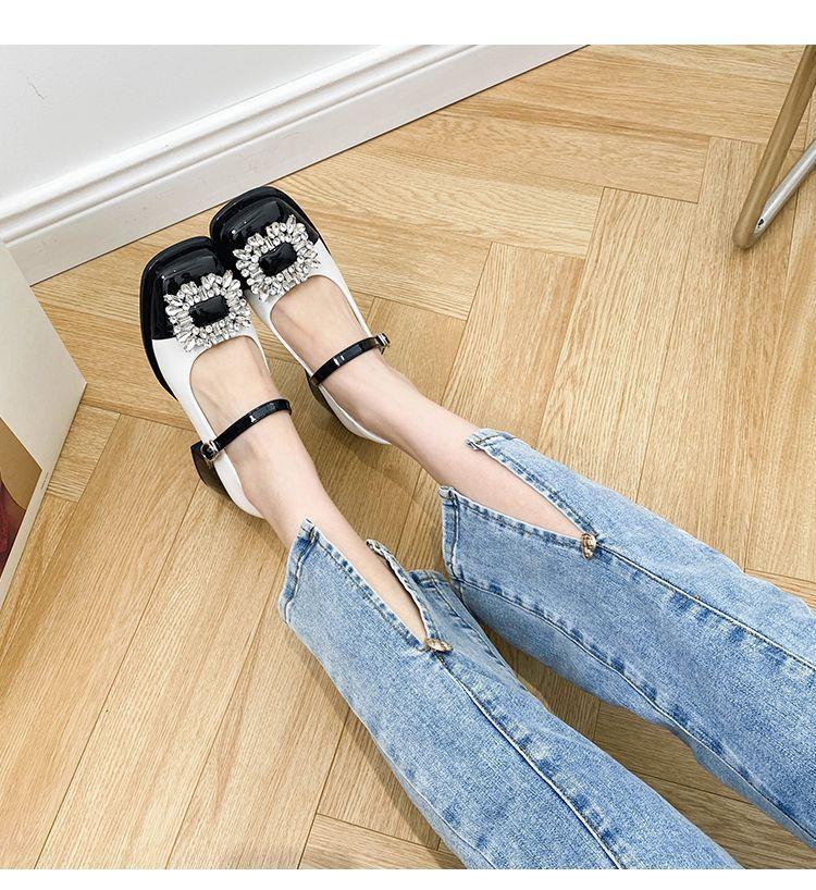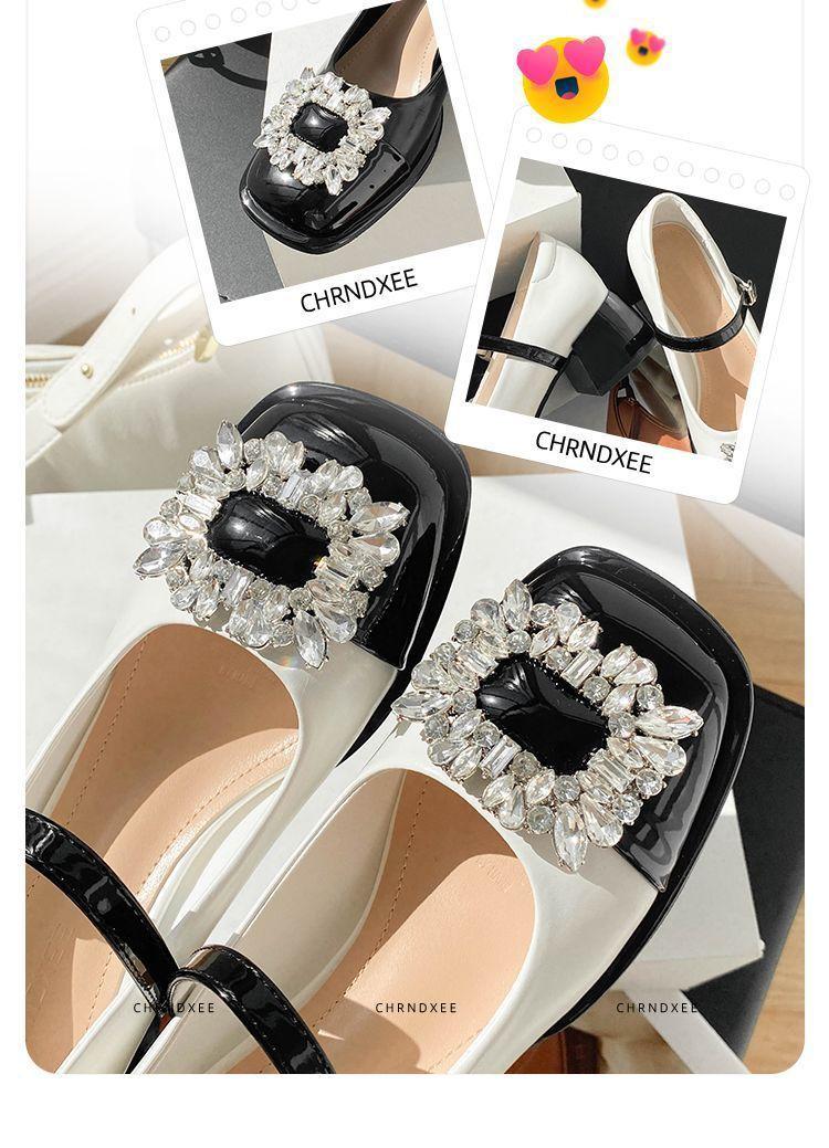 Zapatos de tacón Mary Jane para mujer 2023 Nuevo charol francés punta cuadrada hebilla de una línea pedrería boca escotada tacón grueso flats