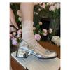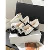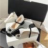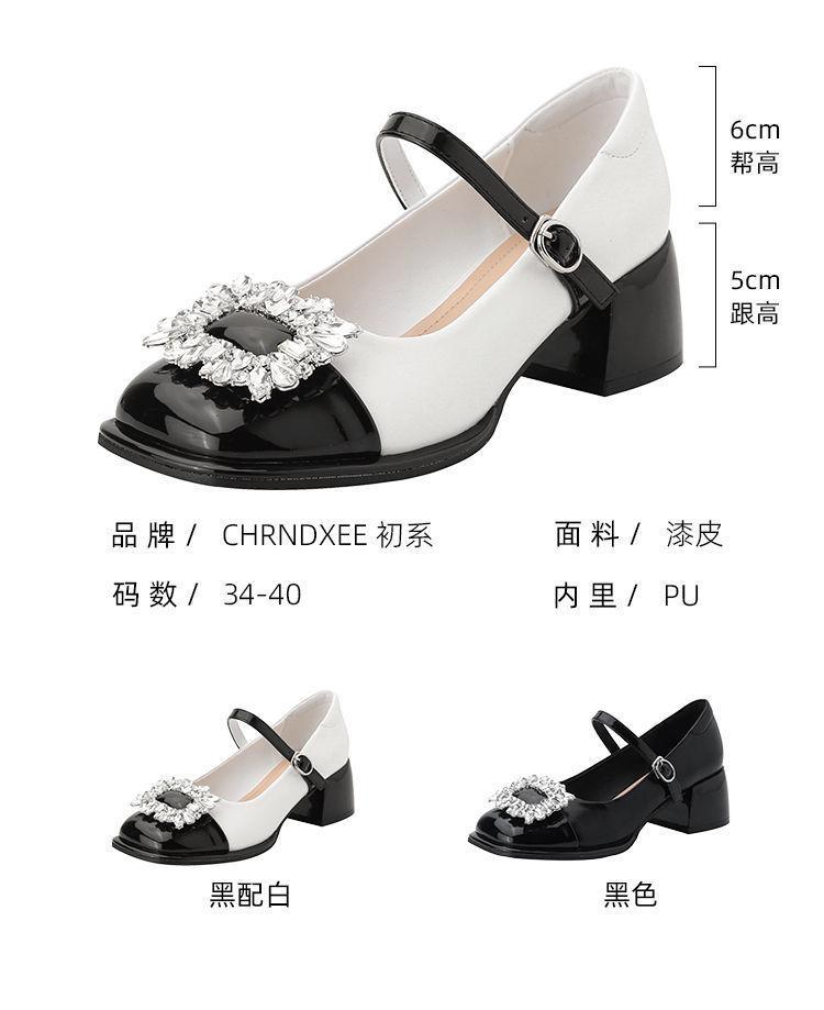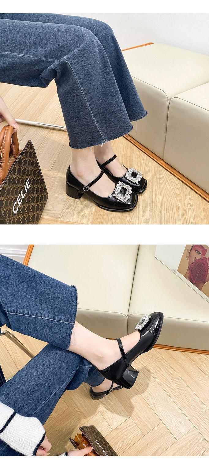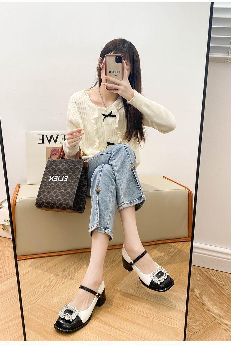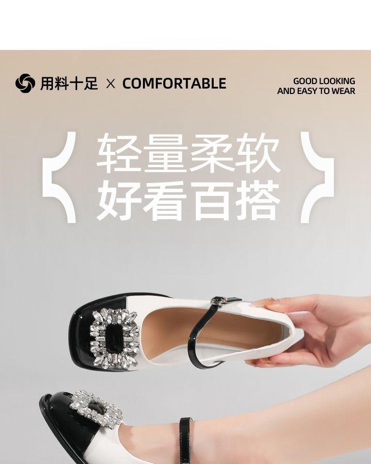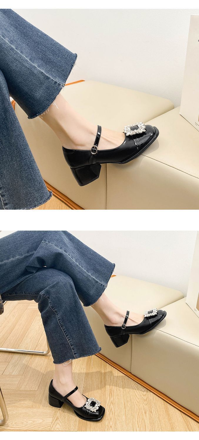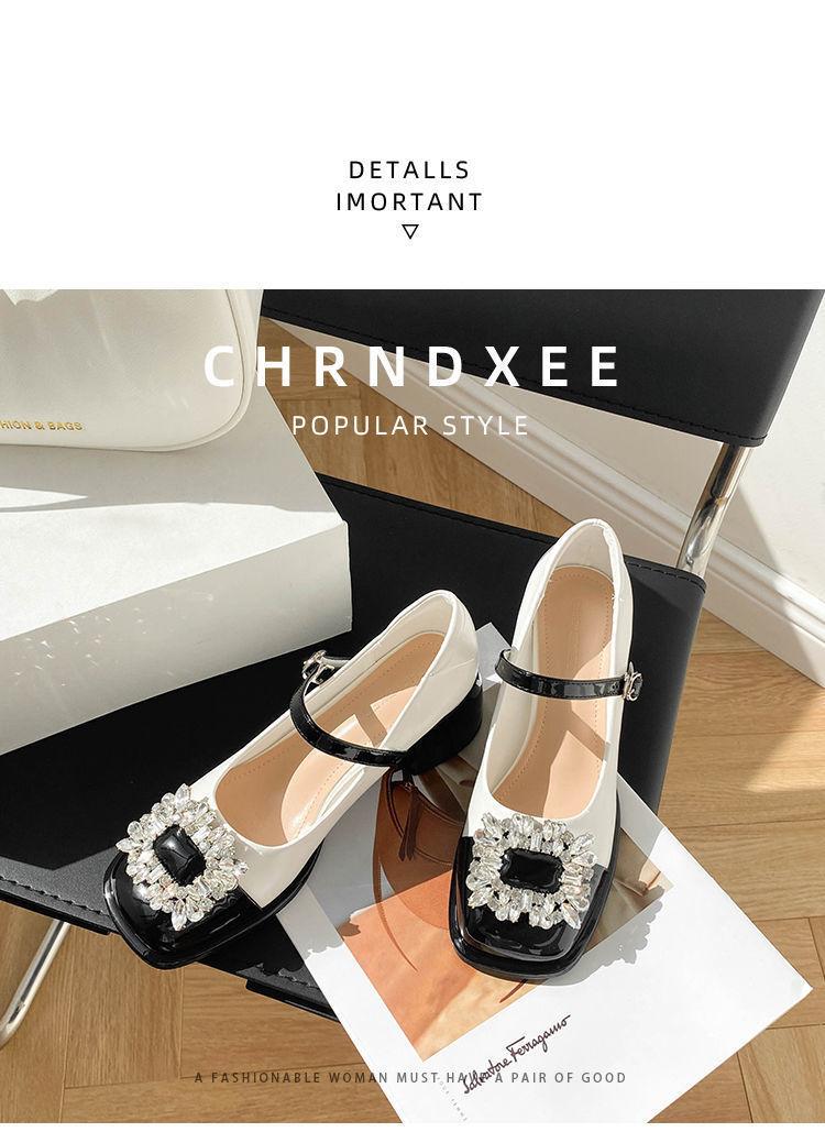 Zapatos de tacón Mary Jane para mujer 2023 Nuevo charol francés punta cuadrada hebilla de una línea pedrería boca escotada tacón grueso flats