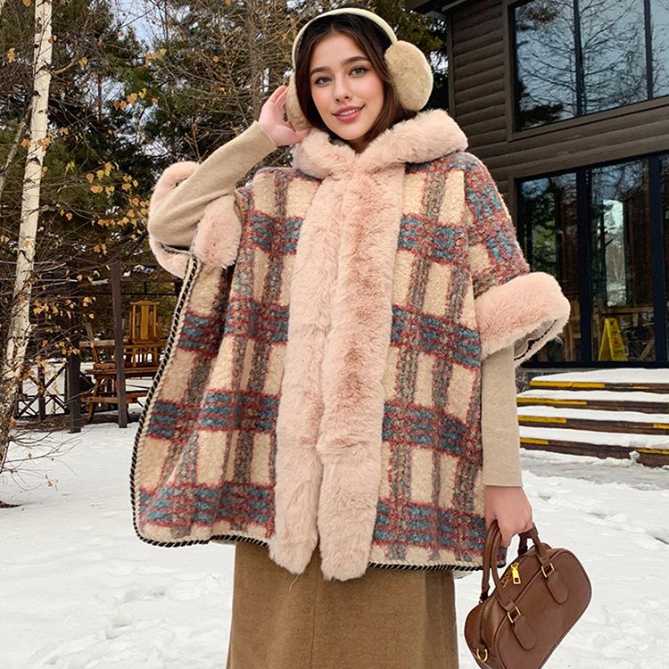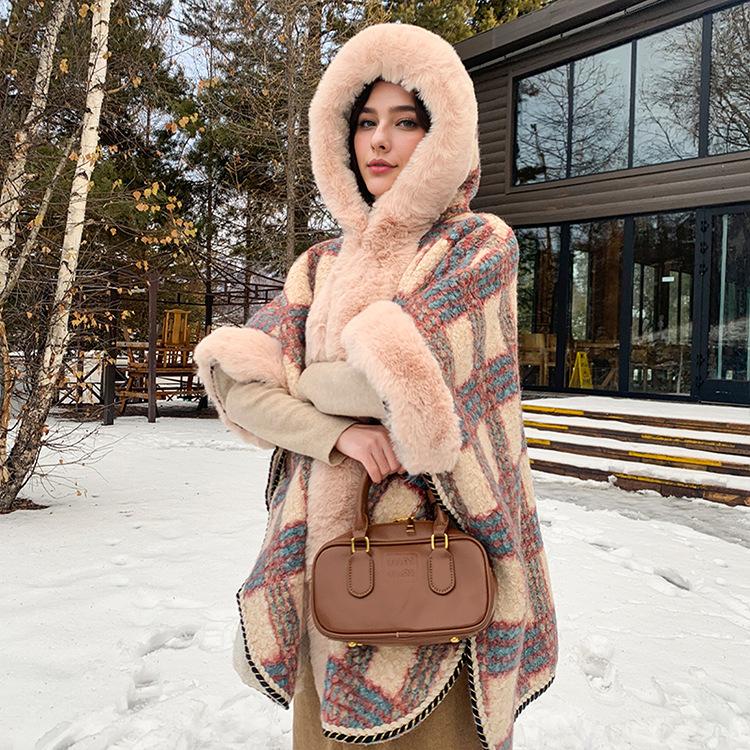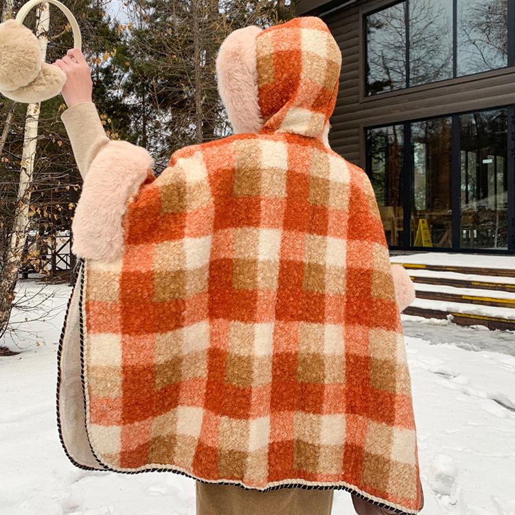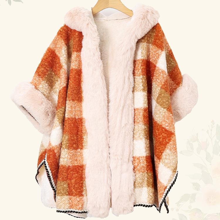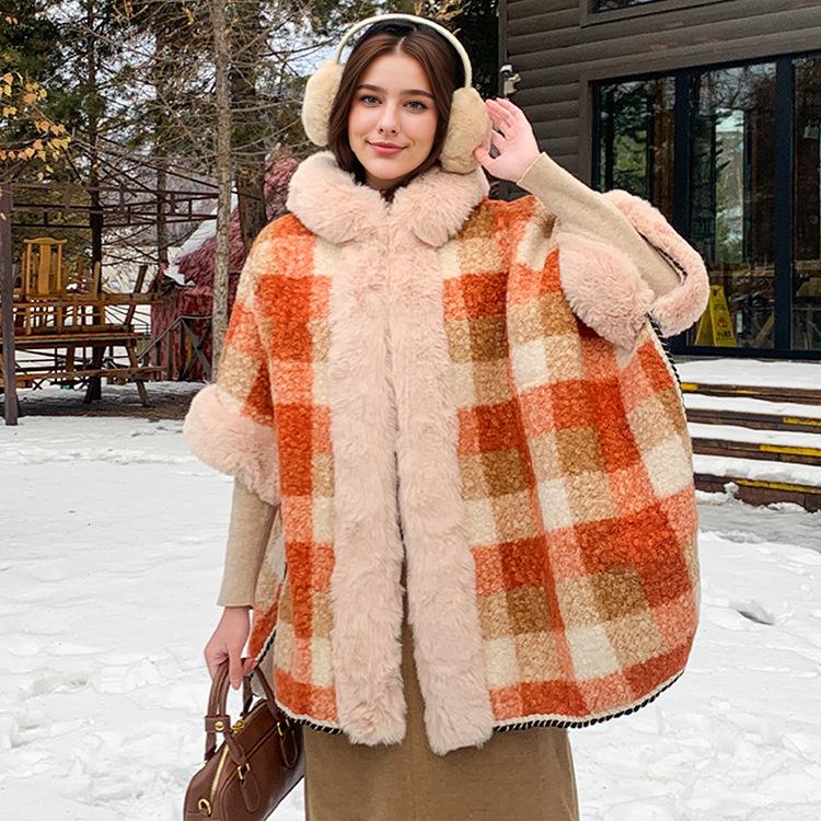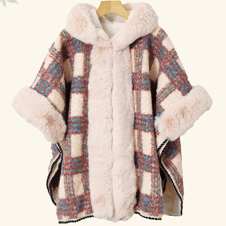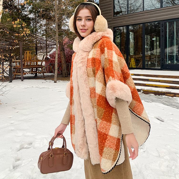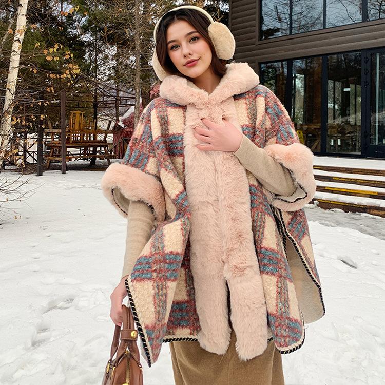Capa Chal de Cuello de Piel Sintética de Conejo Rex para Mujer, Otoño e Invierno con Capucha de Largo Medio Estilo Ala de Murciélago, Abrigo Grueso de Cuadros con Forro Polar para Calidez