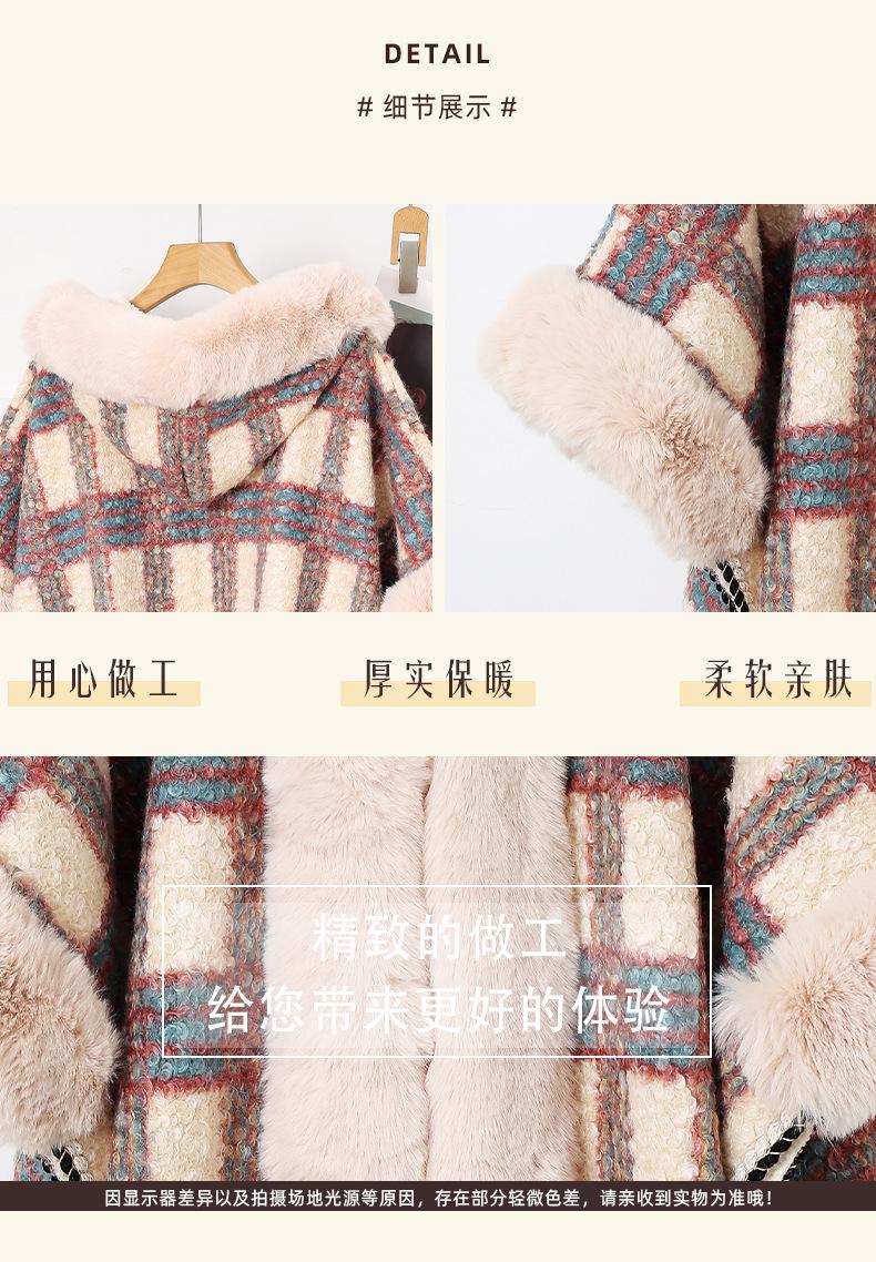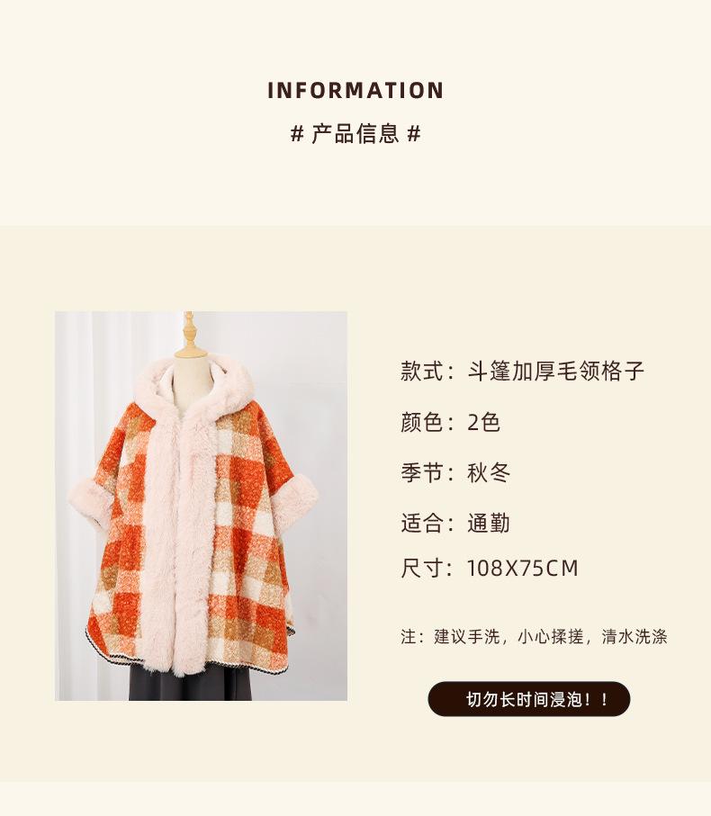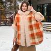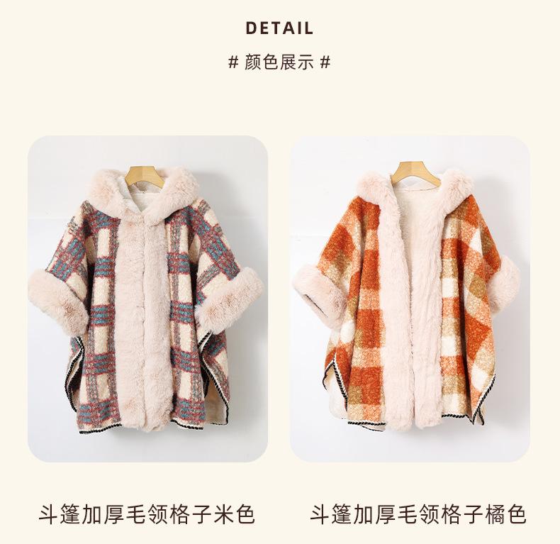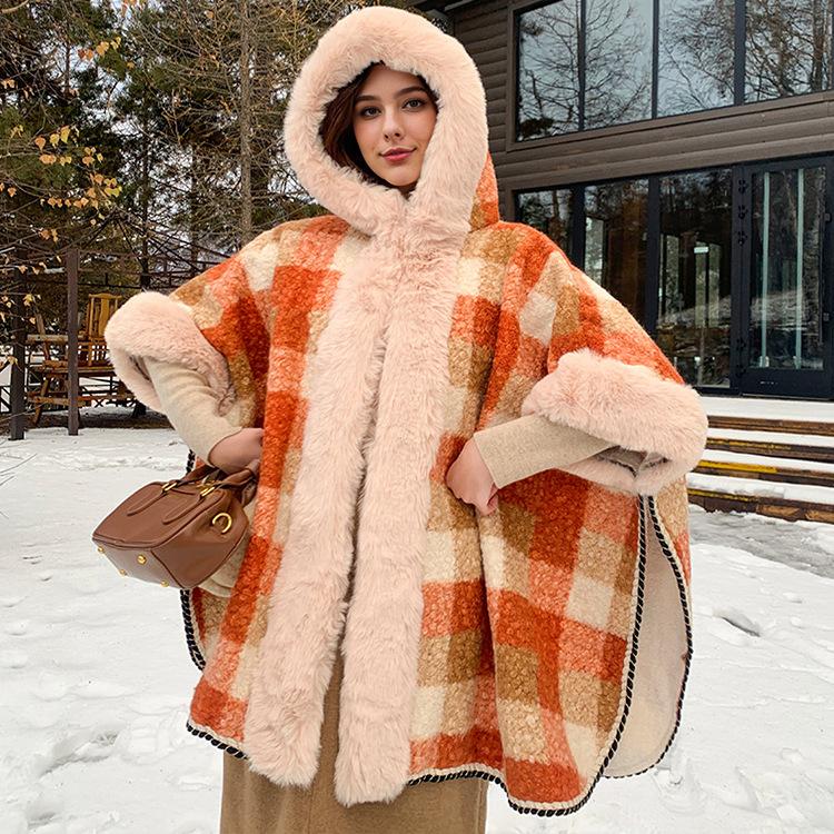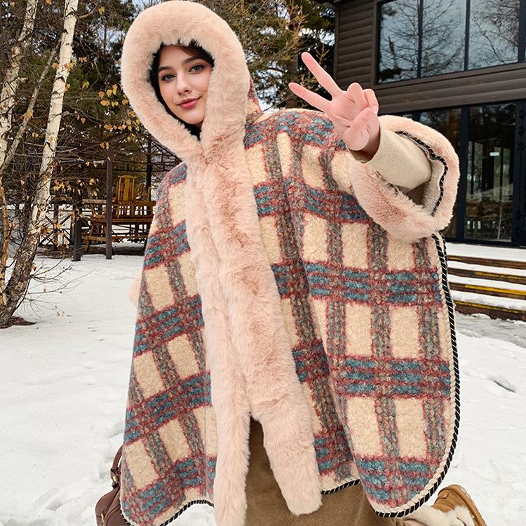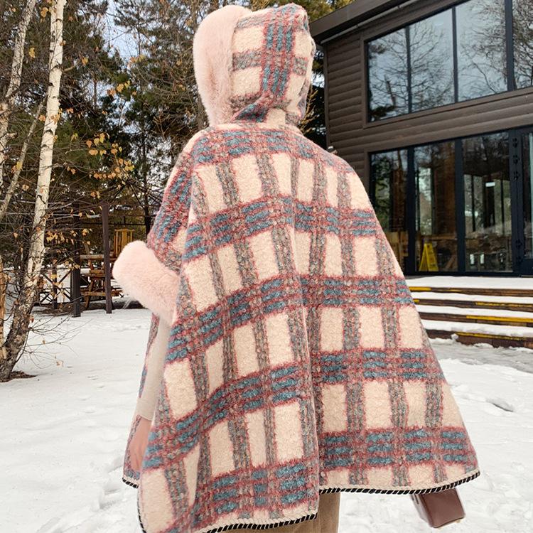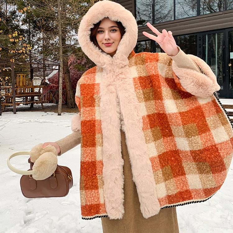 Capa Chal de Cuello de Piel Sintética de Conejo Rex para Mujer, Otoño e Invierno con Capucha de Largo Medio Estilo Ala de Murciélago, Abrigo Grueso de Cuadros con Forro Polar para Calidez