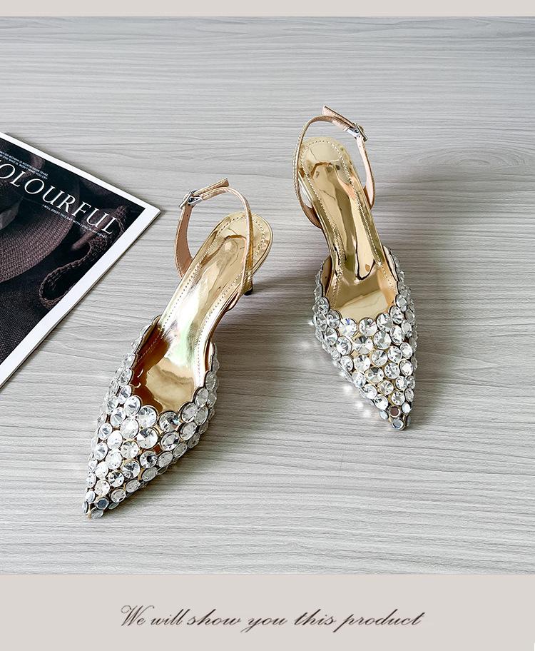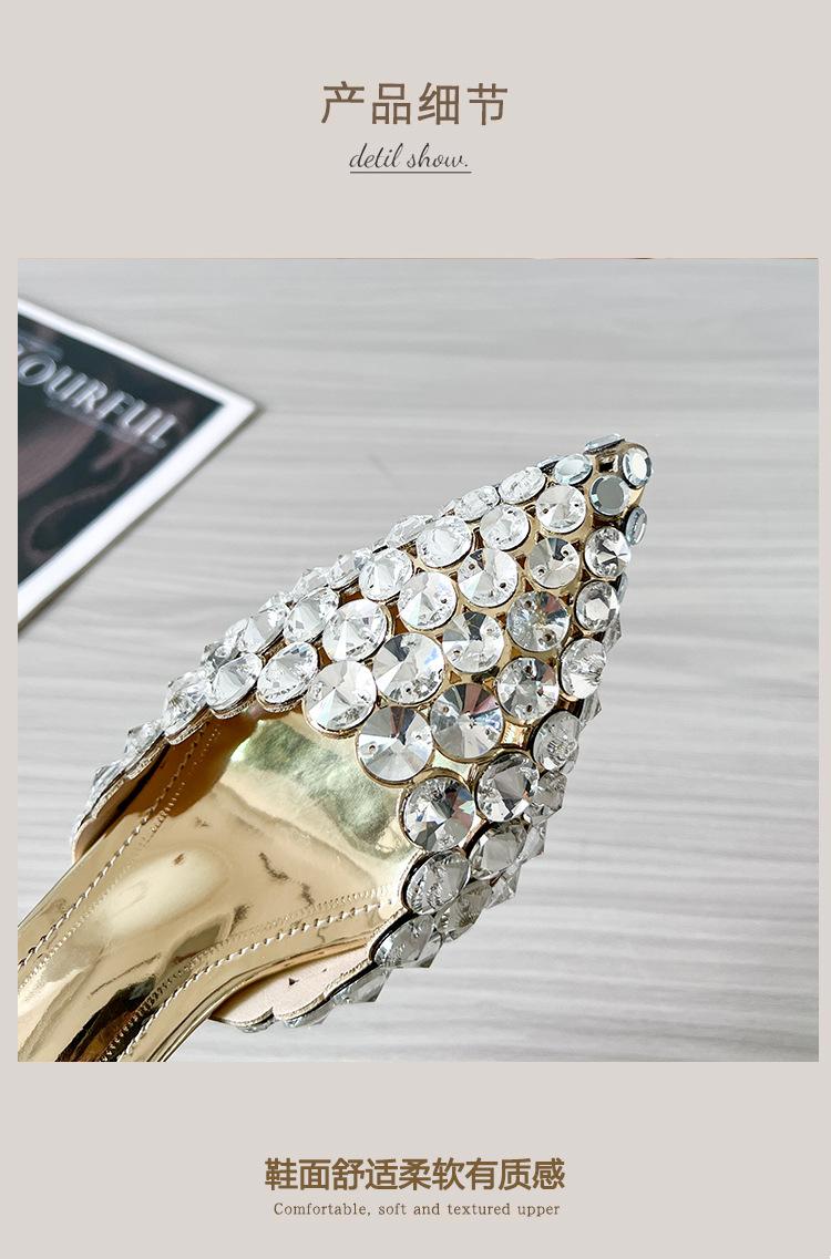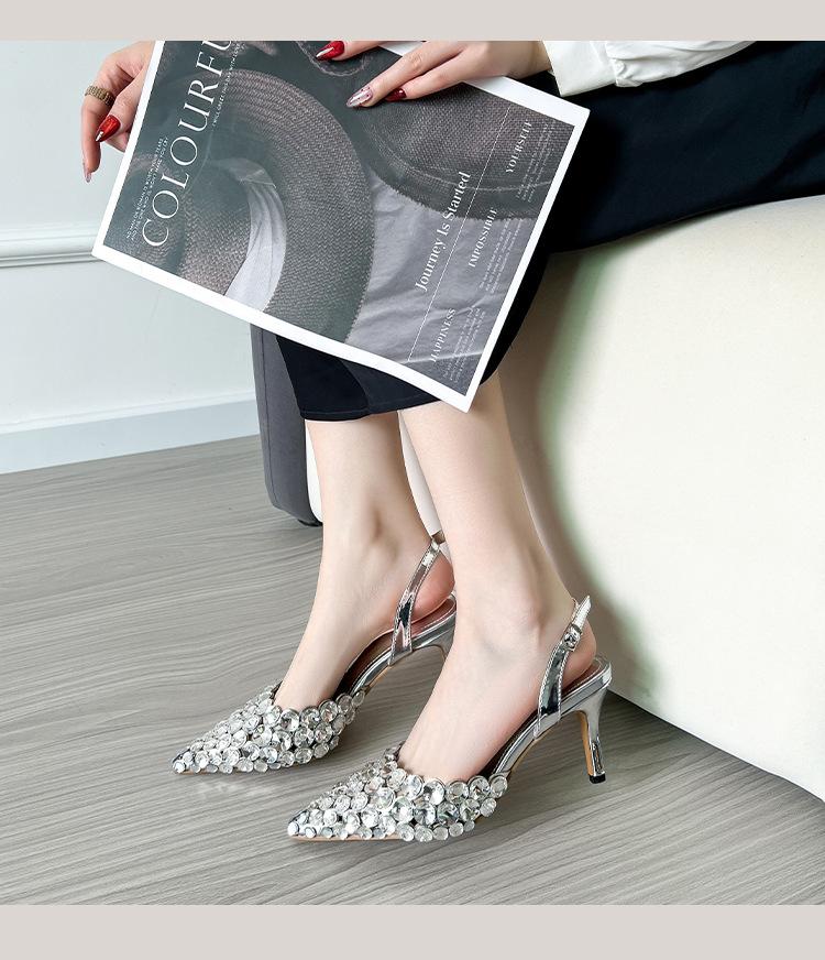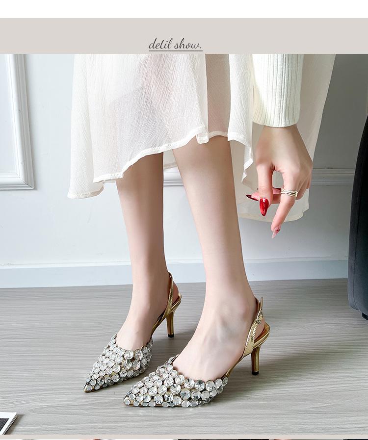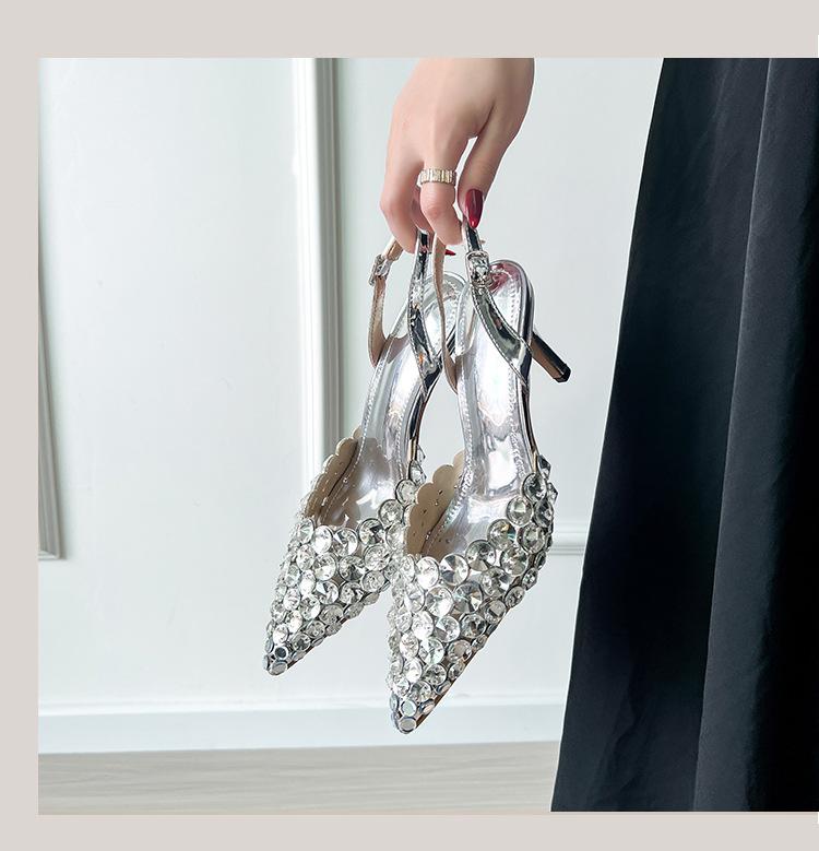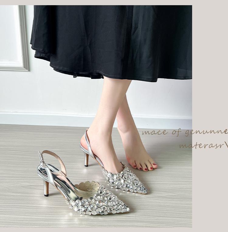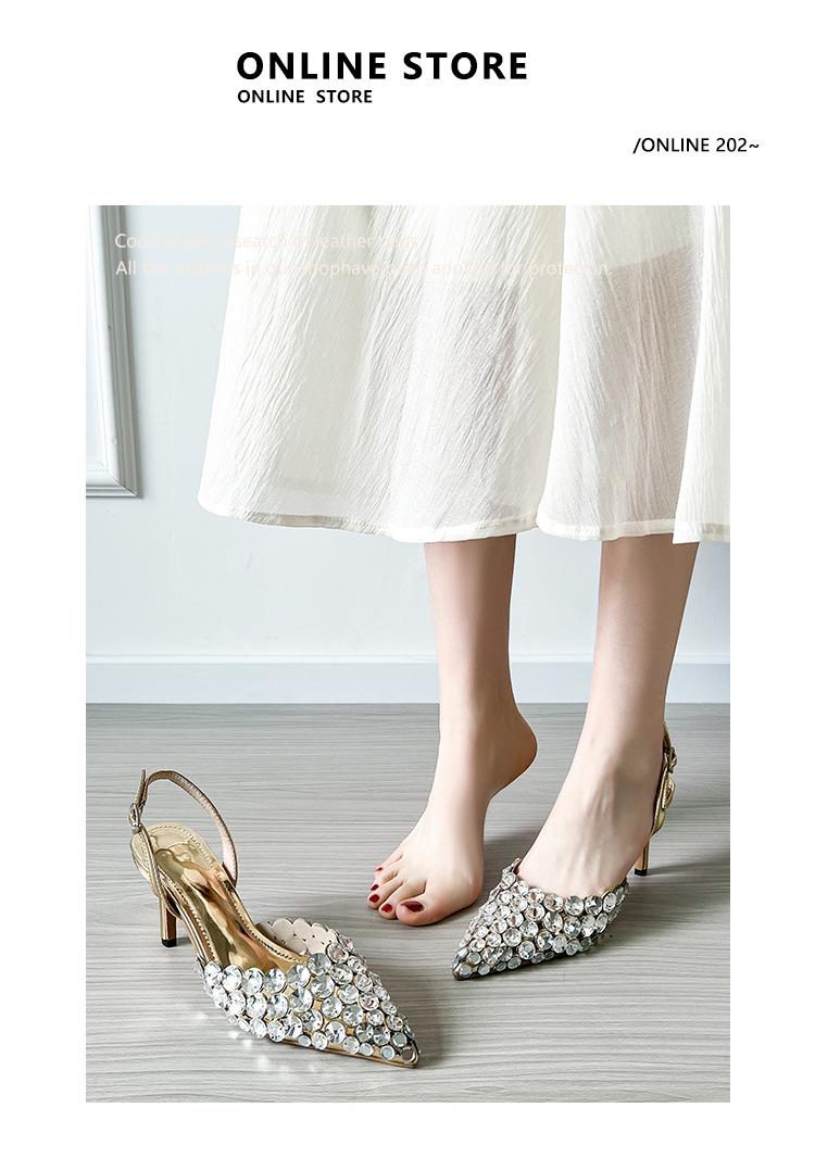 Moda Versátil Transfronteriza de Medio Oriente Verano Nuevo Estilo Zapatos de Tacón de Aguja Baotou Sandalias Sexy de Punta con Pedrería Zapatos de Mujer Franceses